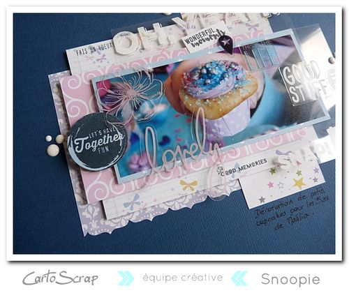 Liste du matériel : Cardstock – AC – Denim, mini pack 15×15 – Simple Stories – Enchanted, stickers Sn@p – Life documented – Clear photos, cartes Overlays – Sn@p – Life documented, Sprinkles dots – Lily white, die-cuts Ephemera – September Skies, mousse 3D, ainsi que les tampons Cartoscrap by Binka, prochainement disponibles.