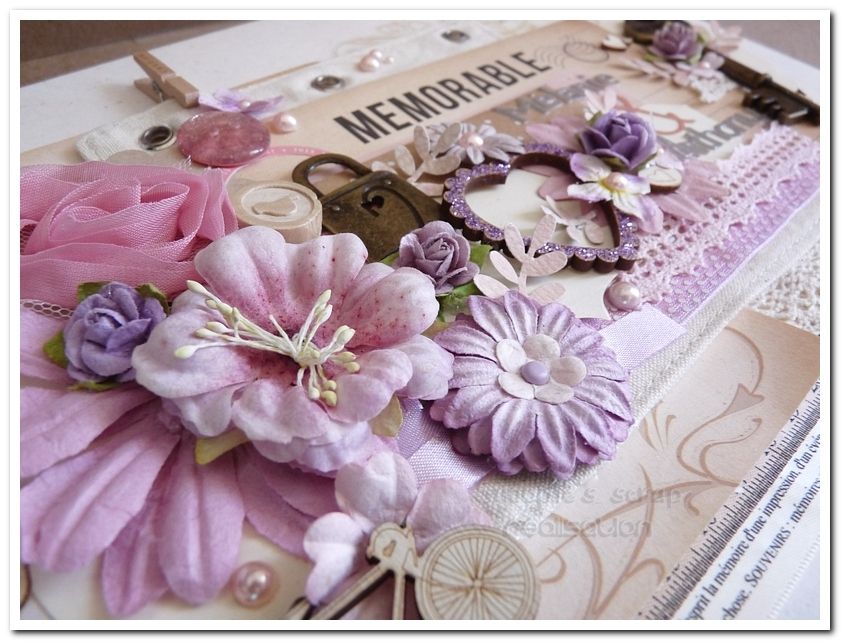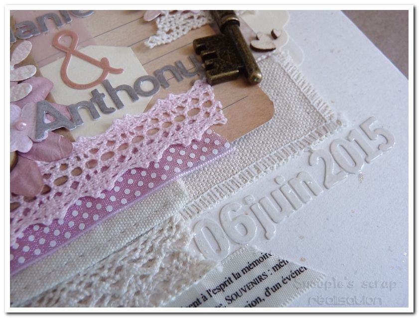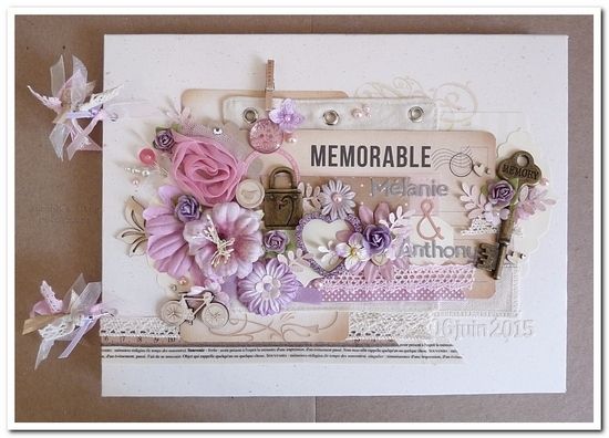 Un livre d’or dans les tons de rose, parme et ivoire et un peu vintage, avec de la dentelle et des fleurs.