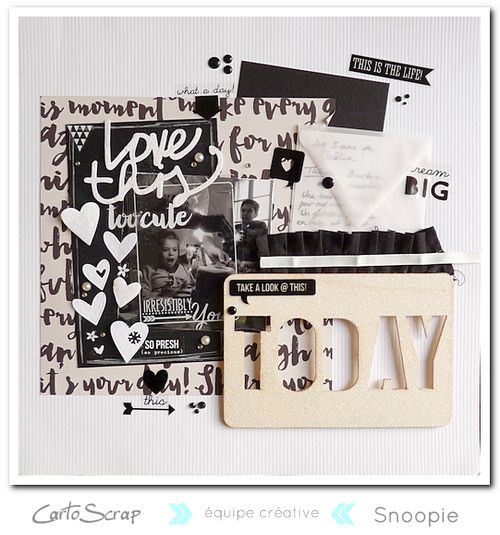 Liste du matériel : Bazzill Eggshell – texture washbord – blanc et Noir, pack 30×30 – My Mind’s Eyes – My story (existe aussi en 15×15), die Poppystamps – Stitched heart trio, pochette d’embellissements Flea Market – Wanderlust, Art Sugar – Art Ingredients – White, stickers Simple Stories – So Fancy photo et DIY Clear words, kit cartes album made easy – Snapshots, kit cartes & embellissements – Project Life – note to self, demi-perles adhésives – snow, Enamel dots SC – black & grey, strass adhésifs 3mm – argent, strass – Nightfall, mousse 3D.
