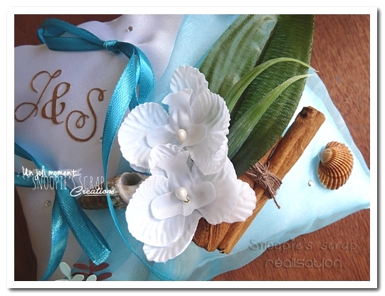 turquoise, blanc, kraft, beige, chocolat, marron, blue, white, cannelle, canelle, coquillages, mer, îles, exotique, orchidées, alliances, rings, coussin, porte-alliances, mariage, wedding, julie & swann.