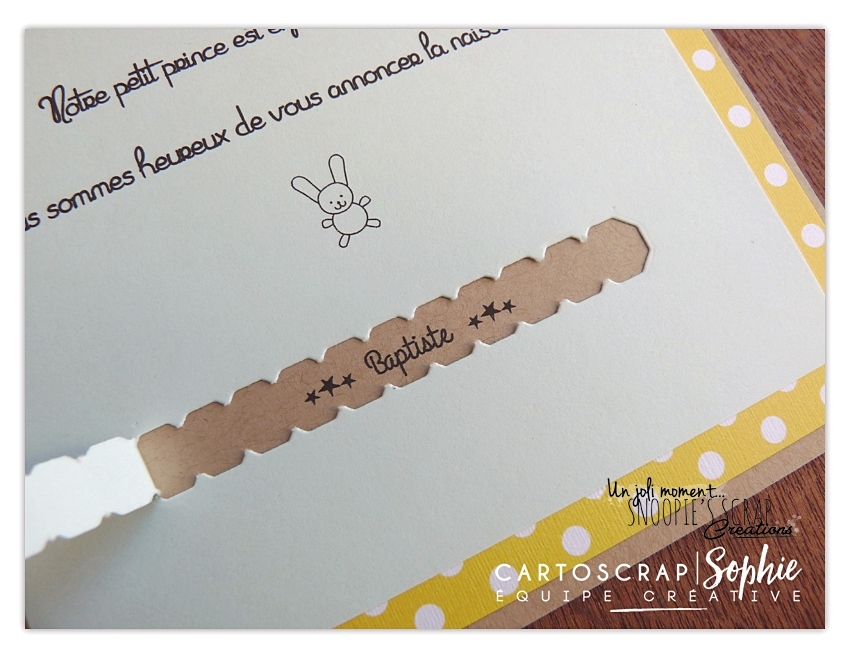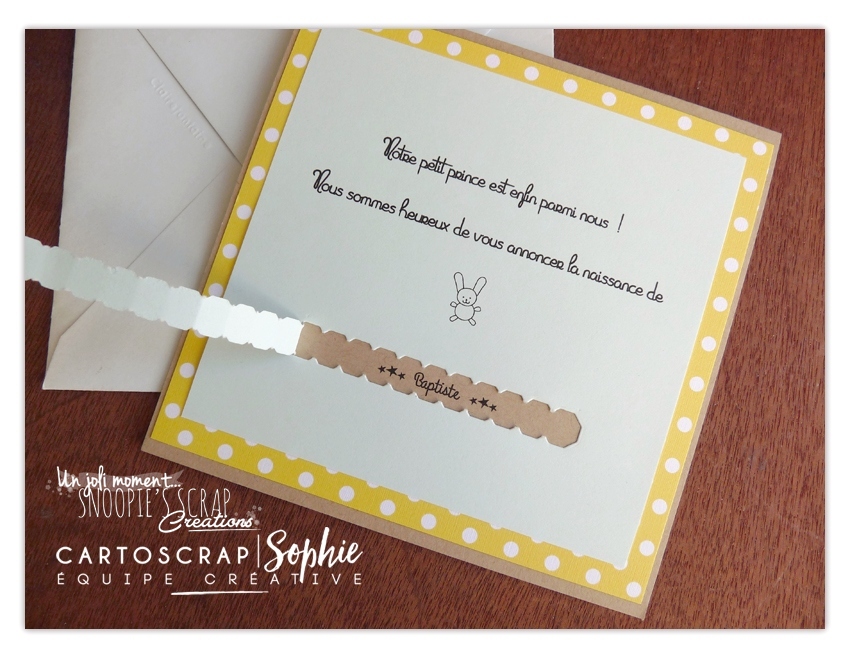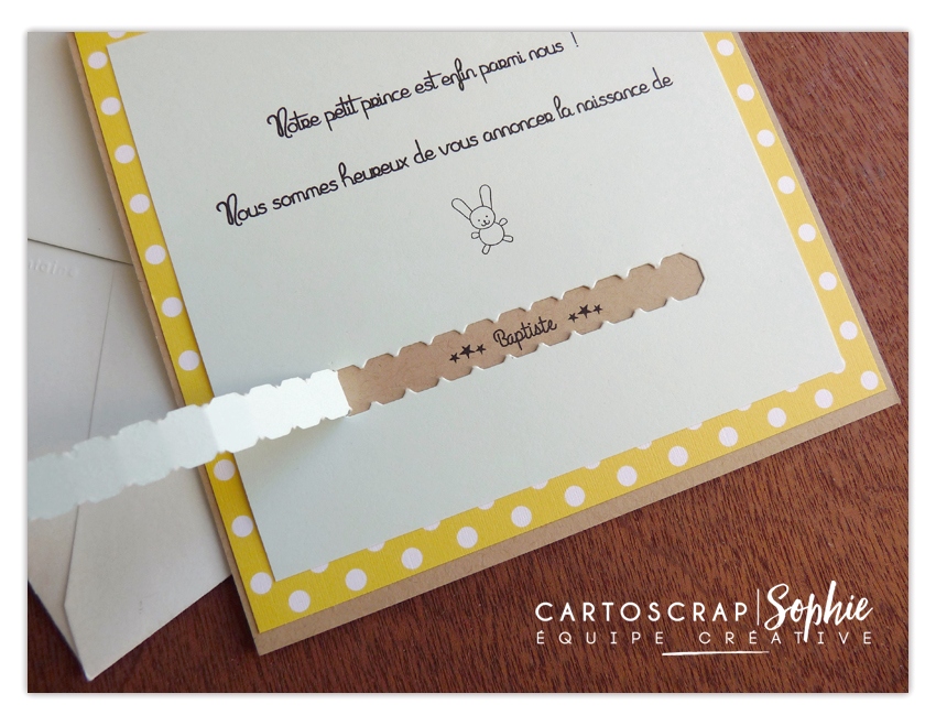 Voici une première version d’un faire-part de naissance garçon avec le prénom de bébé caché, à découvrir en tirant la tirette prévue à cet effet!