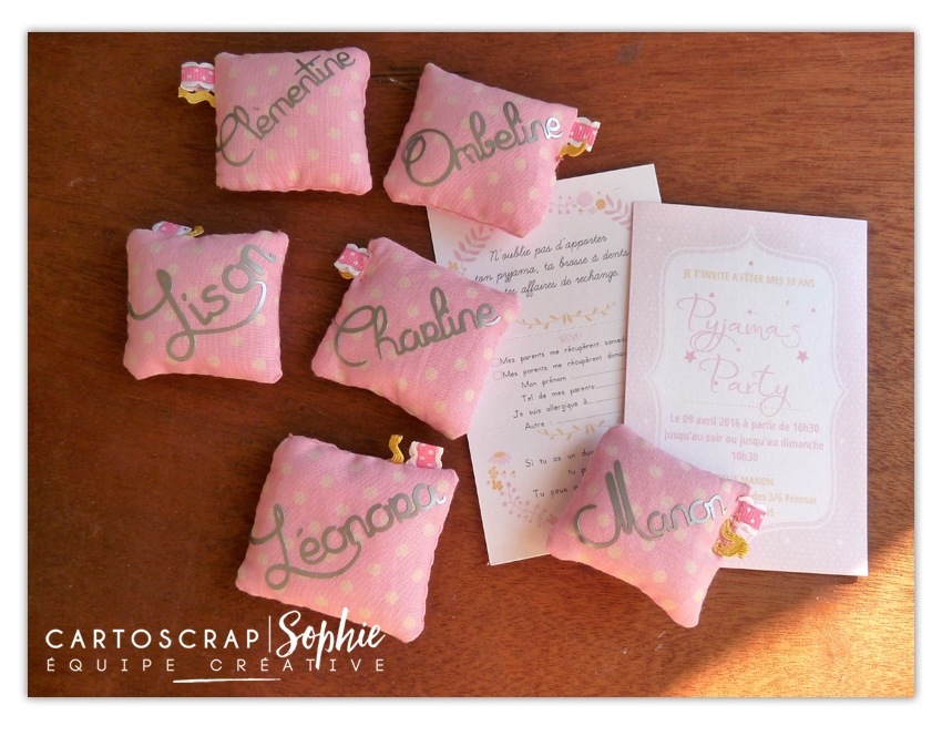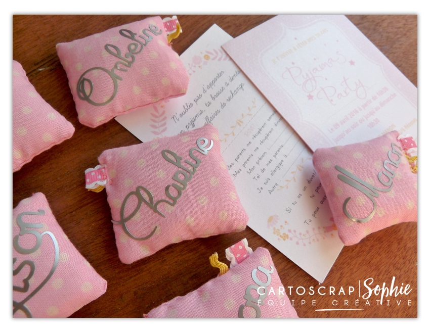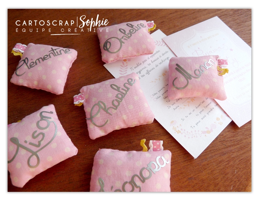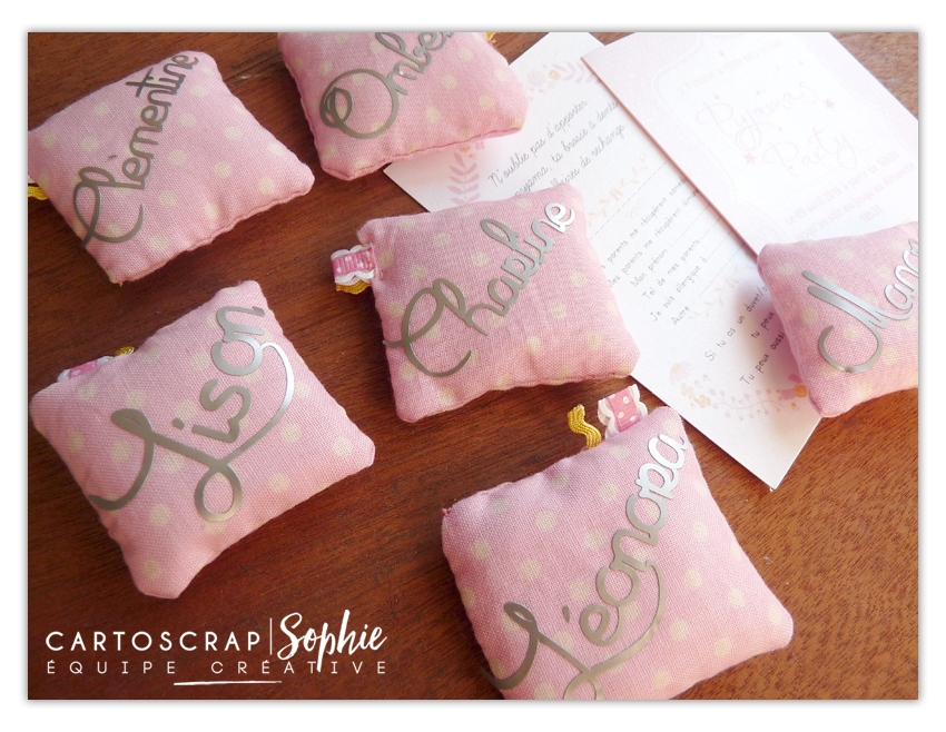 Pour donner un + à l’invitation, nous avons cousu des petits oreillers coussins (je dis NOUS car mon mari m’a même aidé pour les finitions LOL) de moins de 5cm il me semble et j’y ai apposé du vinyl argent, aux prénoms de chaque invitée.