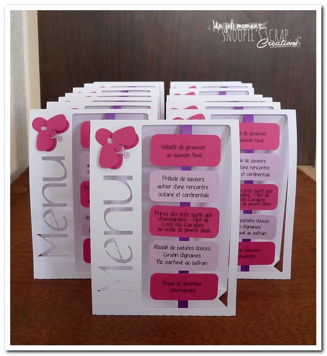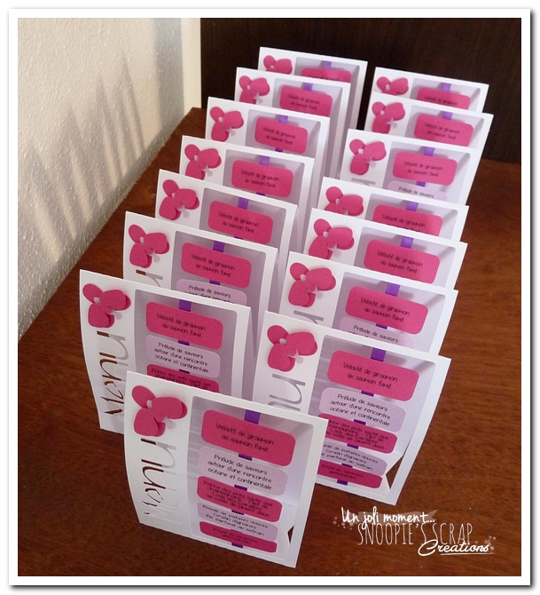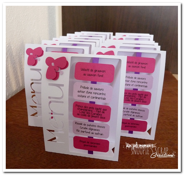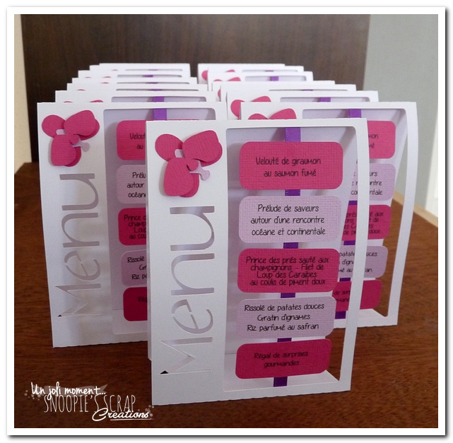 ce soir les menus de Myrtha & David, sur la même base que ceux de Sophie & Sébastien mais en remplaçant le rose par du parme et le ruban fushia par un violet plus soutenu pour contrasté.