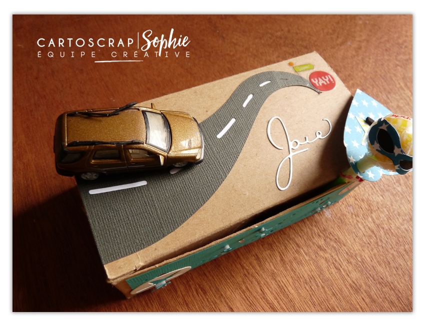 Pour la voiture sur la boîte, je me suis inspirée d’un emballage sur cet article, j’ai utilisé ce fichier ROUTE ici.