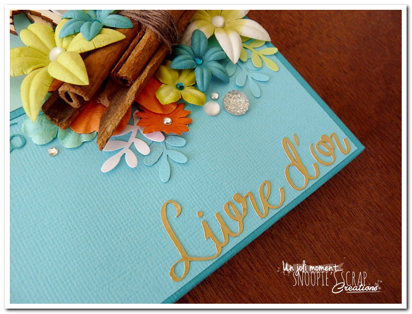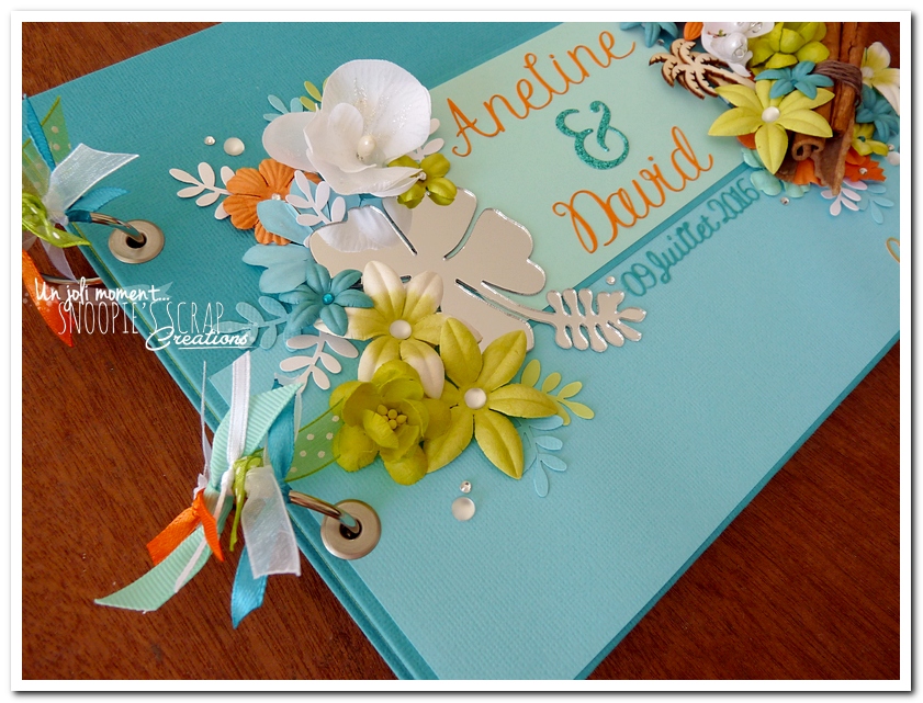 livre d’or mariage, exotique, îles, orchidées, fleurs, cannelle, feuillage, orange, aqua, turquoise, vert anis, blanc, Aneline & David friendly . FORMULE friendly
