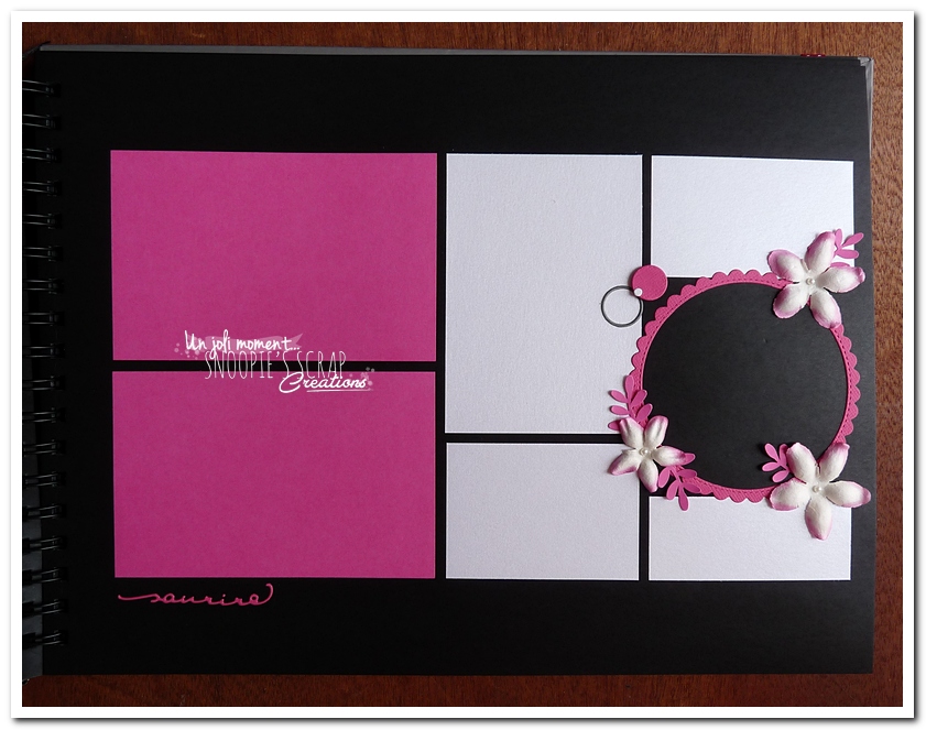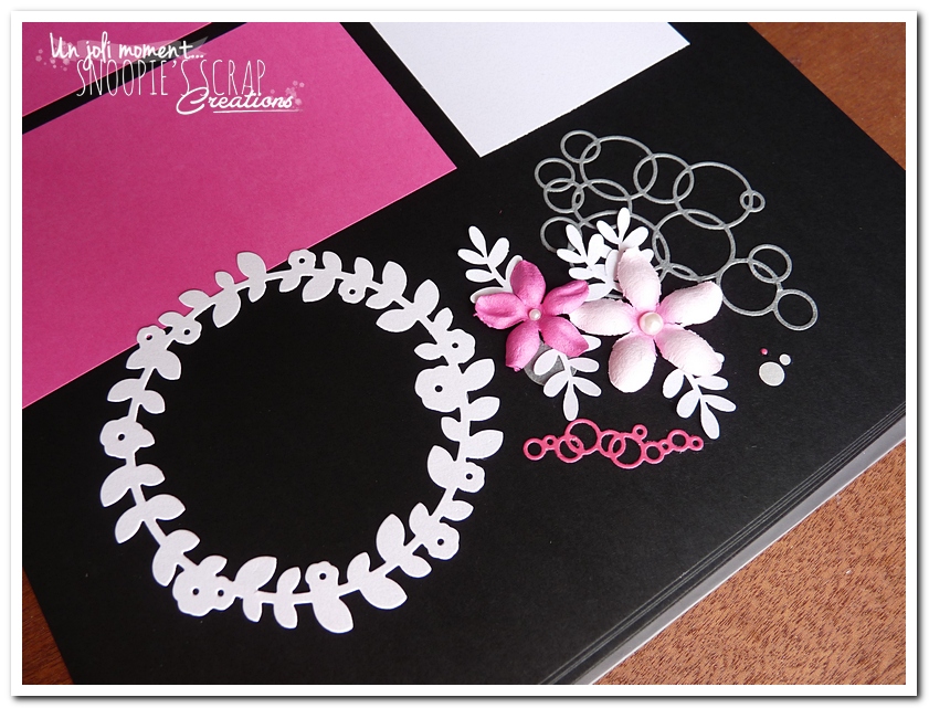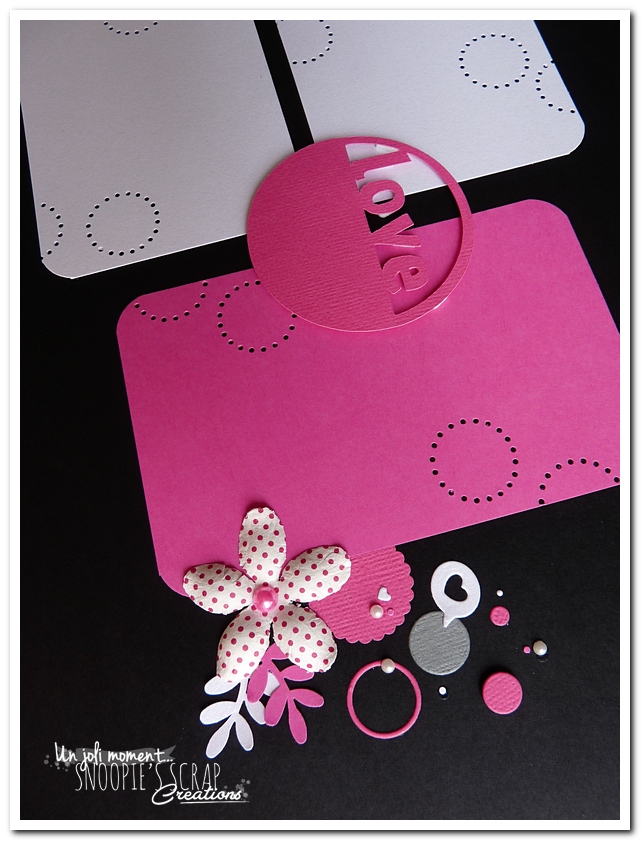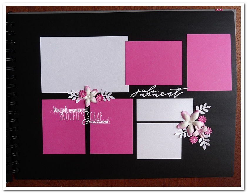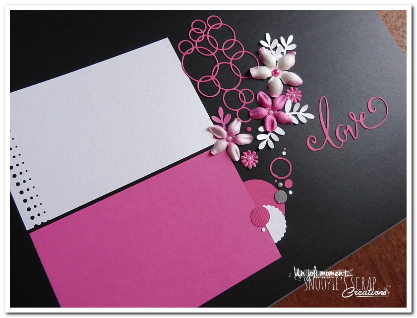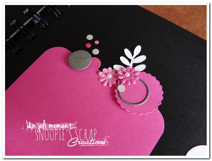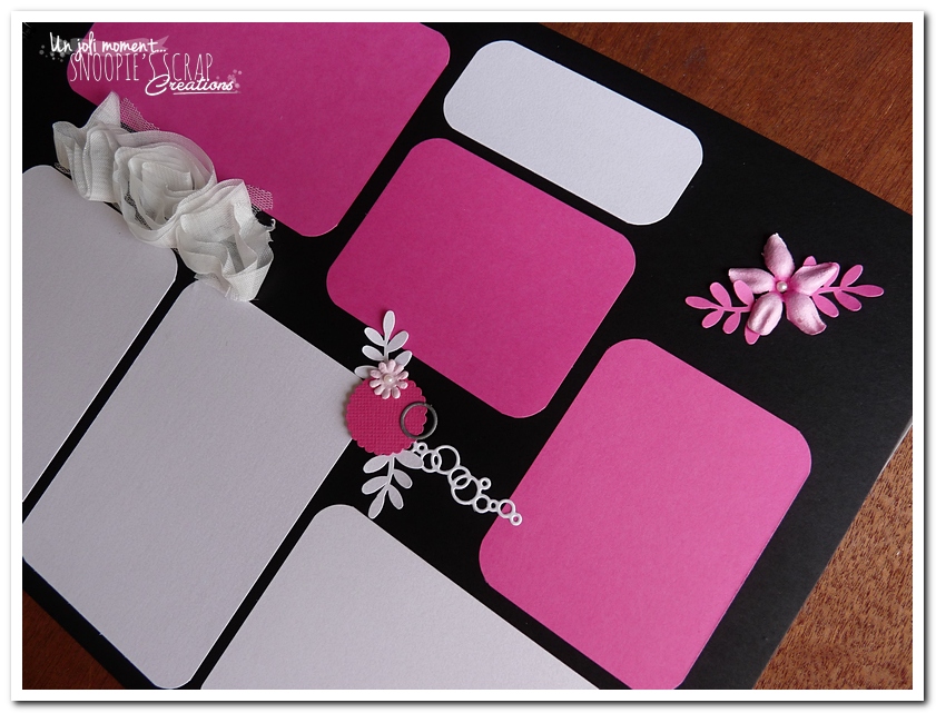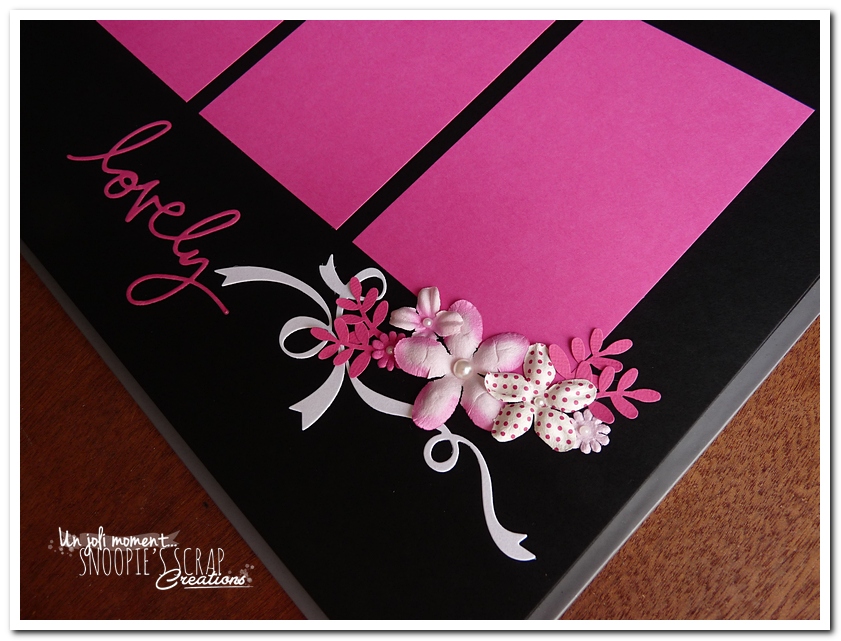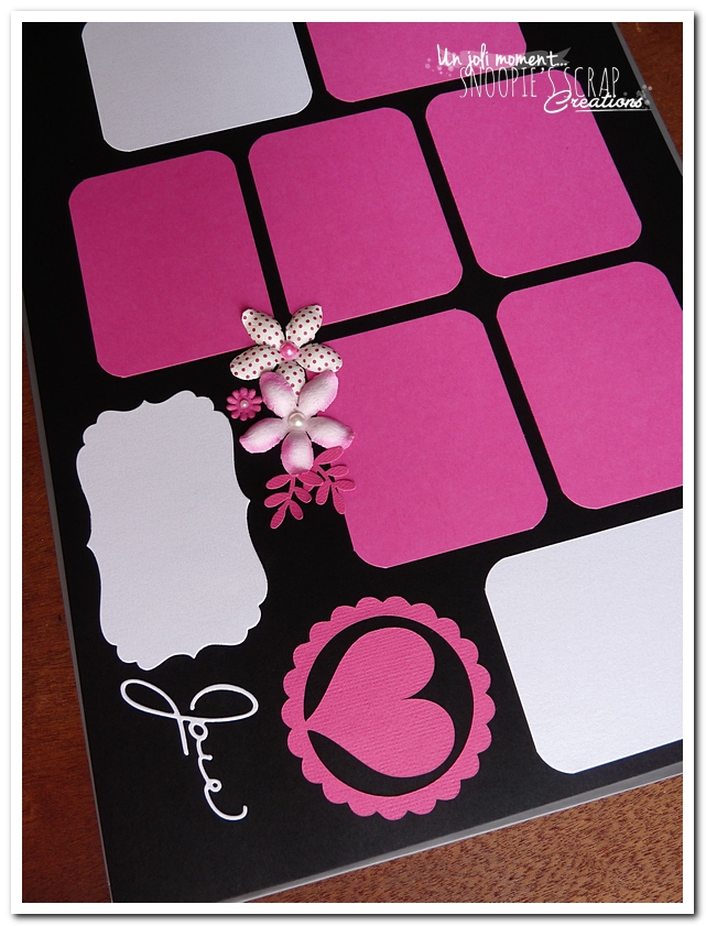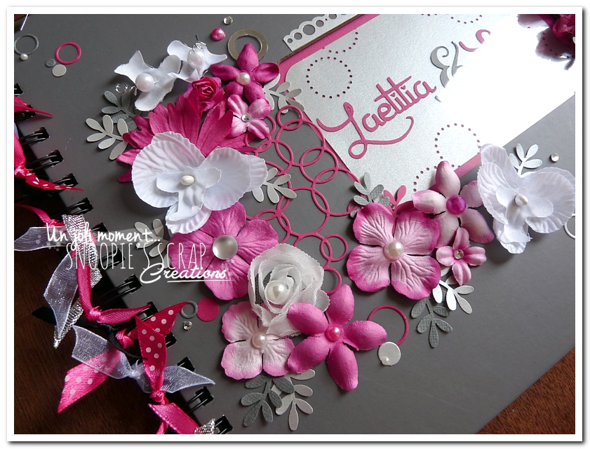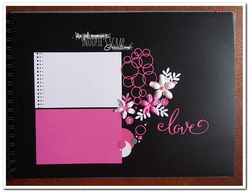 livre d’or, mariage Laetitia & Eric, blanc fushia & noir (touches argentées), fleurs (& bulles), mariage, wedding, pink, white, flowers, roses, orchidées, perles, strass, rubans, guest book.formule LOVE