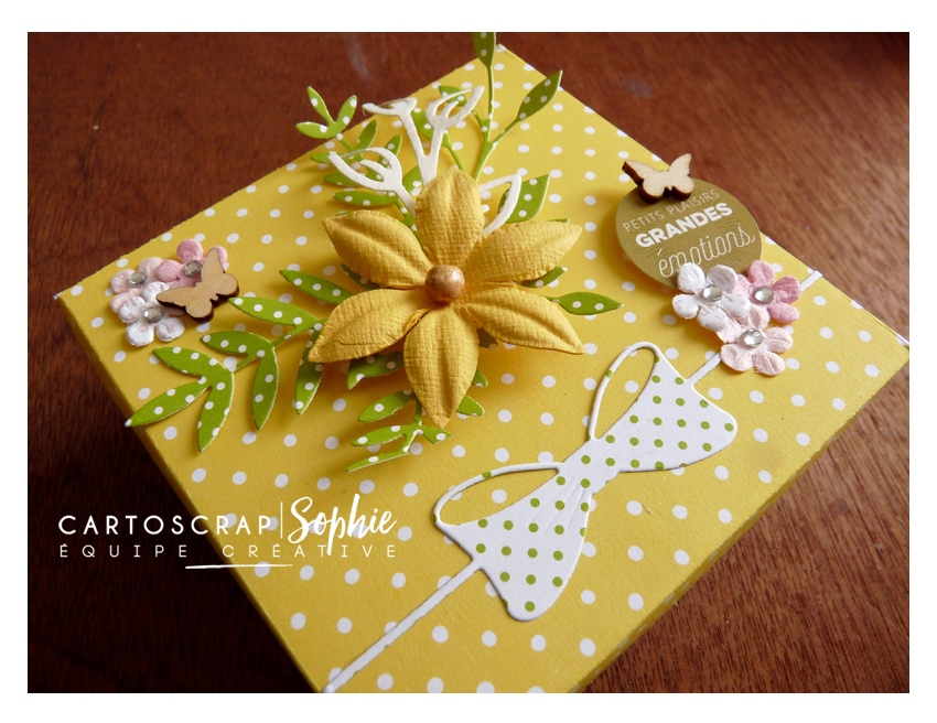 Celle avec le transparent, j’ai utilisé une machine de coupe manuelle (big shot) pour couper la forme dans le papier avant de le plier et le coller.