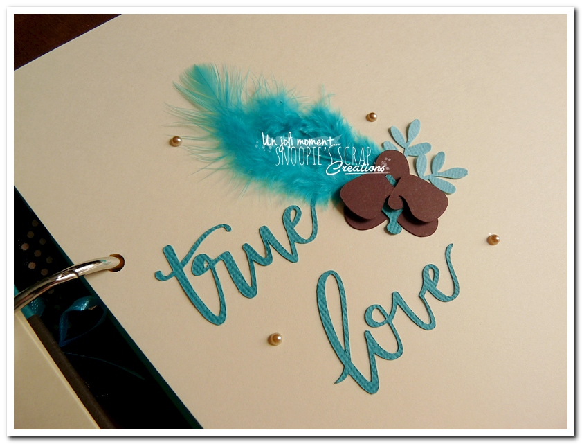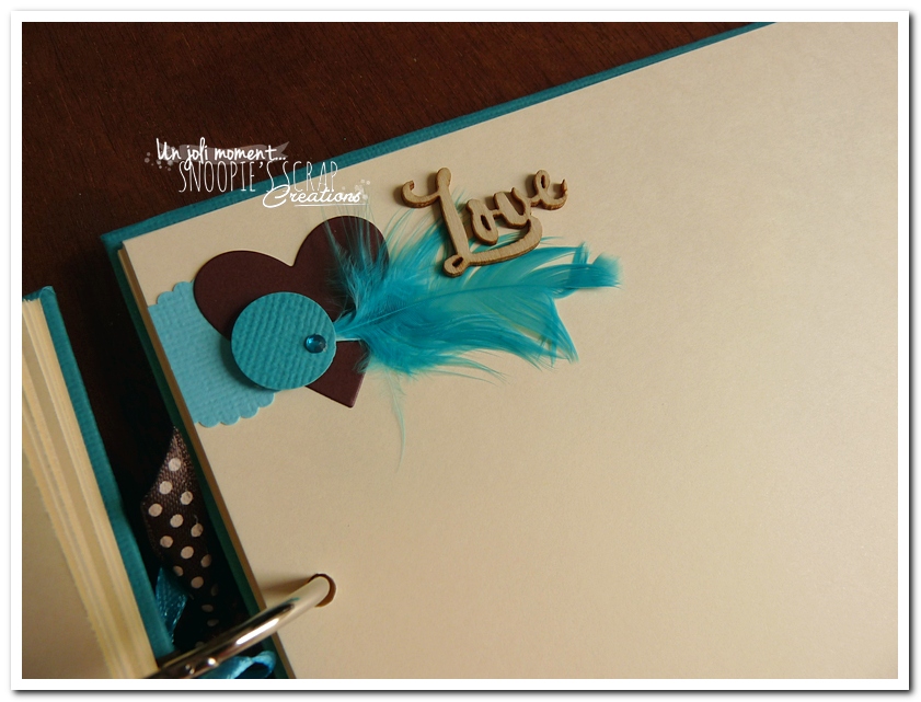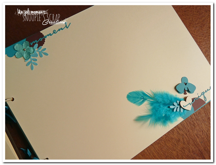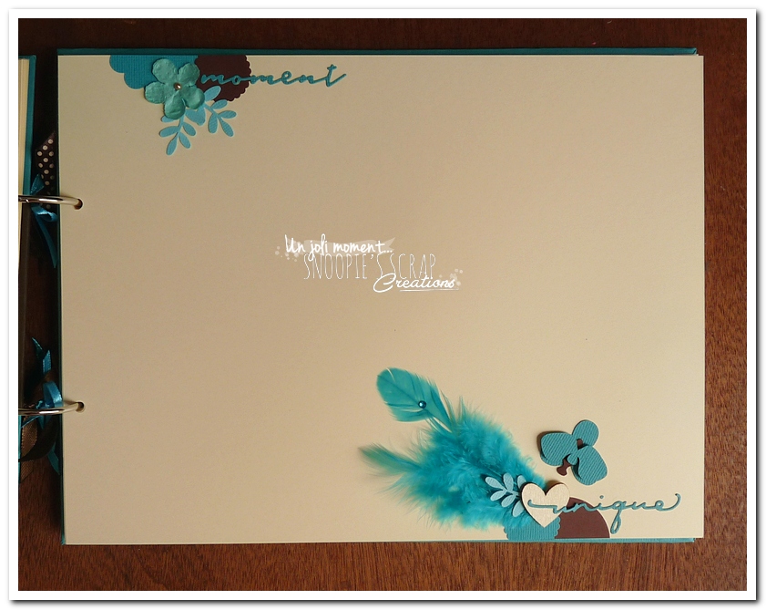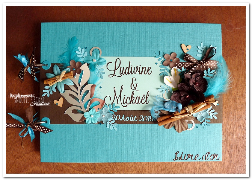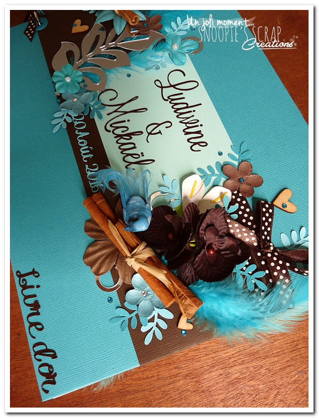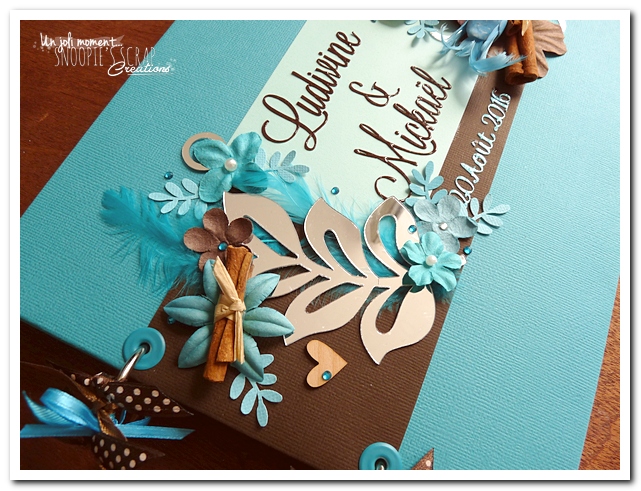 Ils souhaitaient un livre d’or se rapprochant au maximum du coussin d’alliances qu’ils avaient fait confectionner (ailleurs), avec une base comme mes livres exotiques chocolat-turquoise, avec l’intérieur dans le même genre que celui de Sophie & Sébastien mais adapté à leur thème & leurs couleurs.