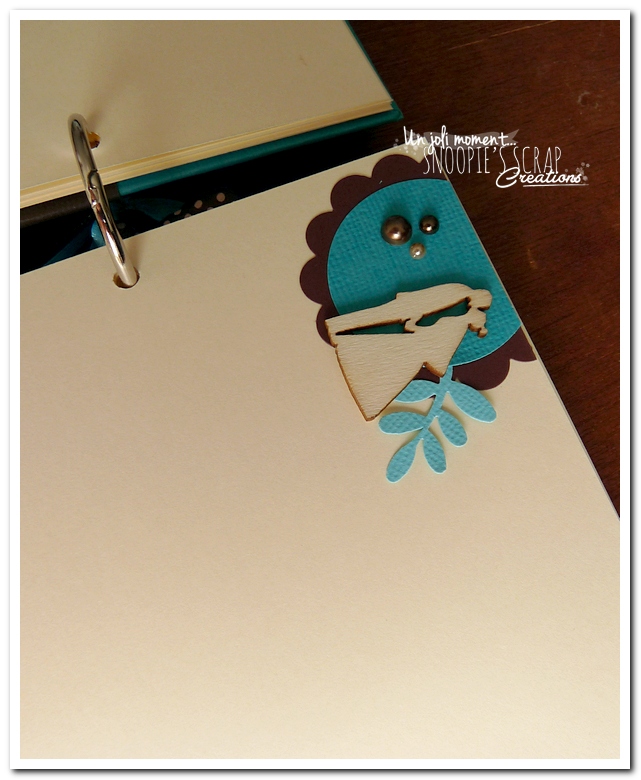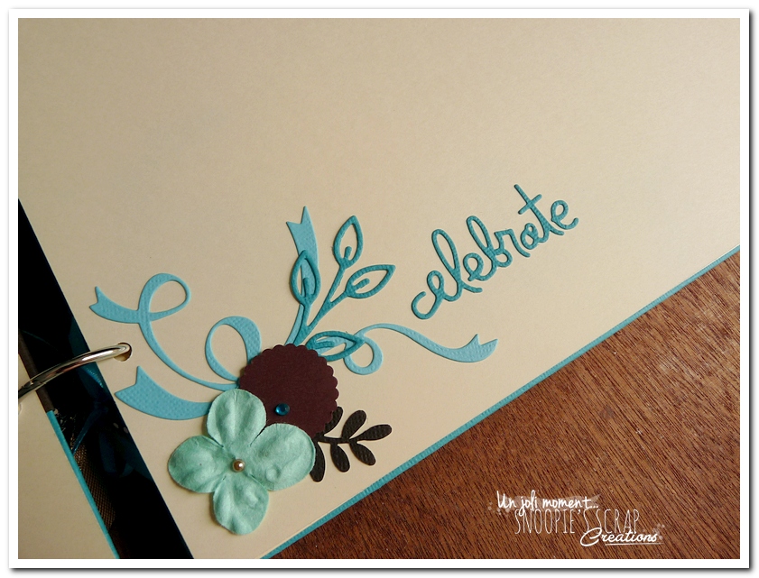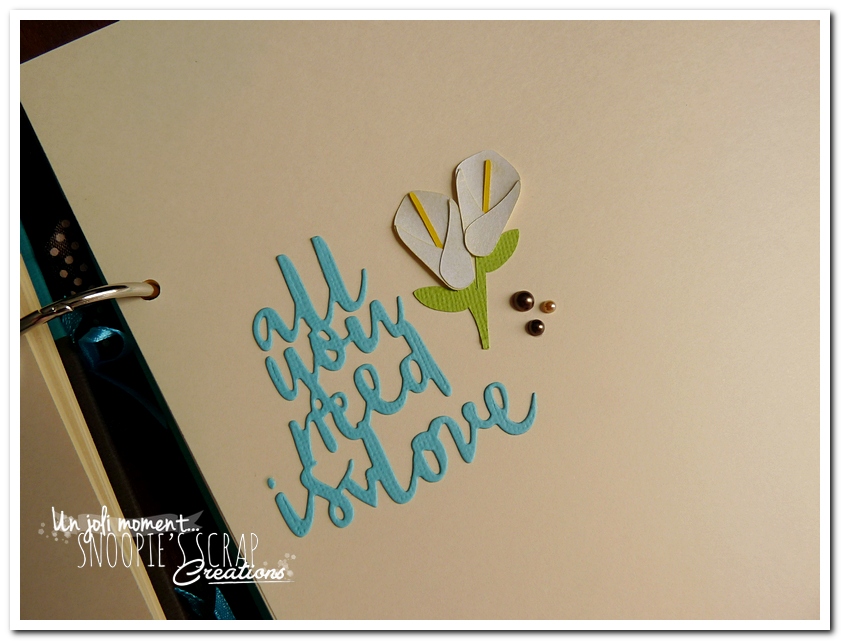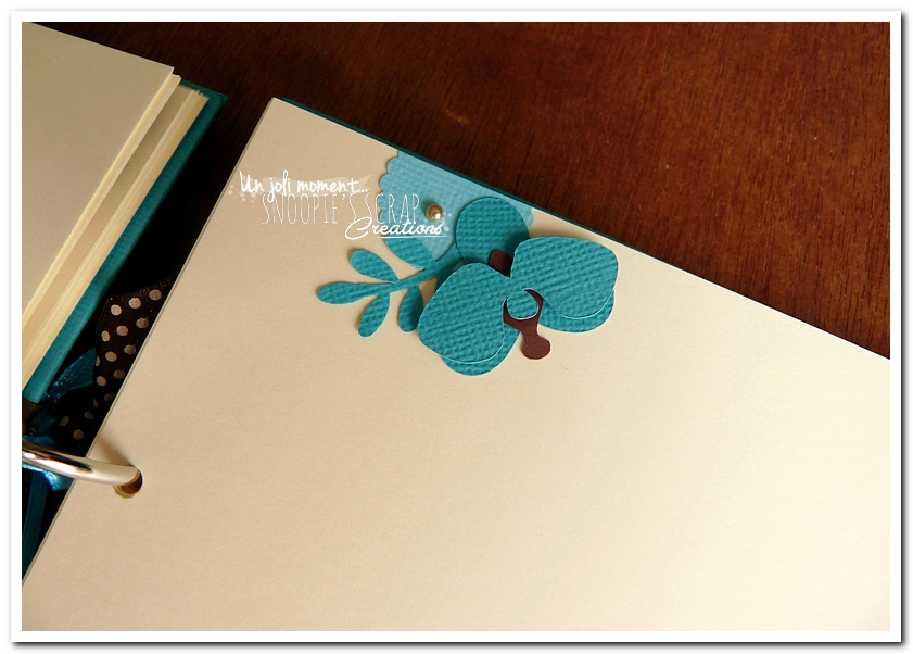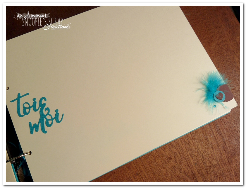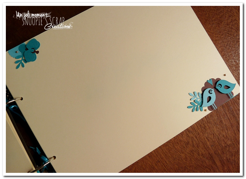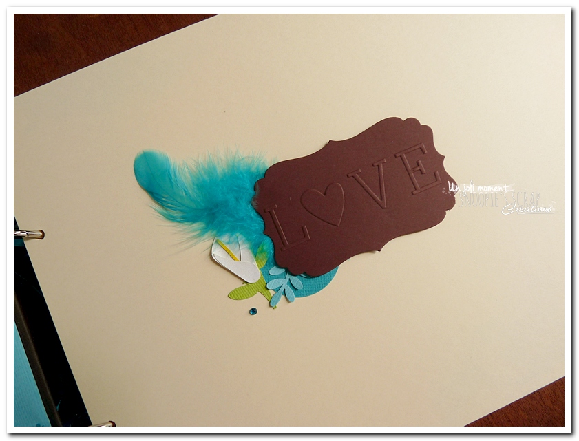 Ils souhaitaient un livre d’or se rapprochant au maximum du coussin d’alliances qu’ils avaient fait confectionner (ailleurs), avec une base comme mes livres exotiques chocolat-turquoise, avec l’intérieur dans le même genre que celui de Sophie & Sébastien mais adapté à leur thème & leurs couleurs.
