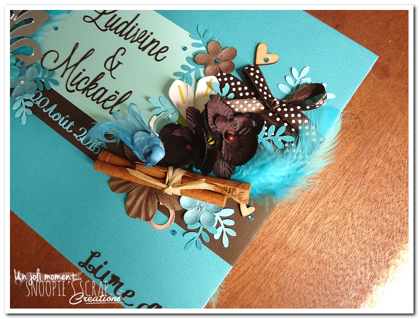 mariage Ludivine & Mickaël, mickael, wedding, exotique, îles, eau, mer, troiques, voyages de noces, hawaï, martinique, guadeloupe, canelle, cannelle, fleurs, plumes, oiseaux, miroir, feuilles, arum, lys, livre d’or, urne, tirelire, boîte à rêves, boîte à rêves, turquoise, blpeu, aqua, teal, eau, chocolat, marron, kraft, bois, ENJOY.