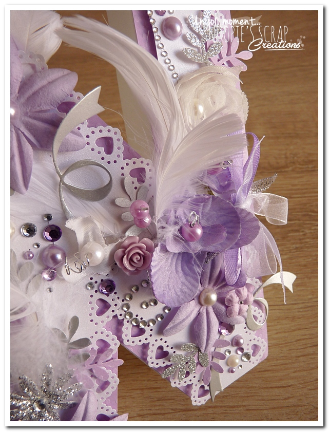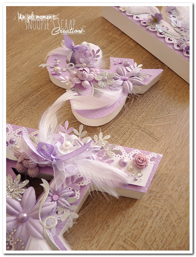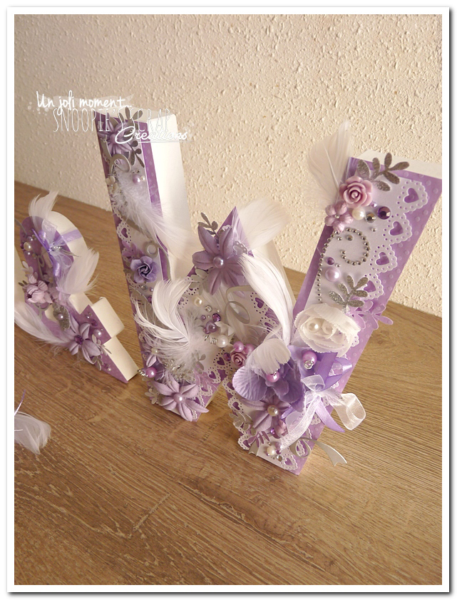 initiales, lettres, décorées, plumes, strass, perles, fleurs, parme, blanc, argent, feuillage, dentelle, coeurs, audrey & william.