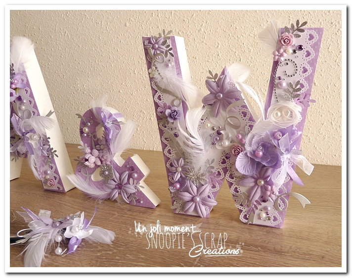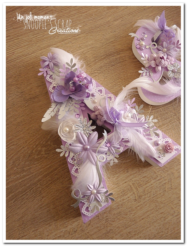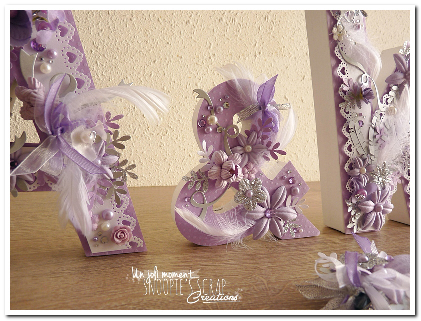 initiales, lettres, décorées, plumes, strass, perles, fleurs, parme, blanc, argent, feuillage, dentelle, coeurs, audrey & william.