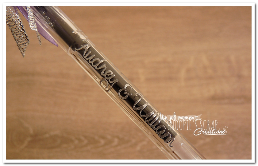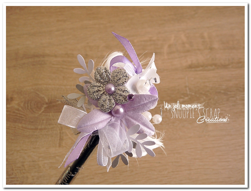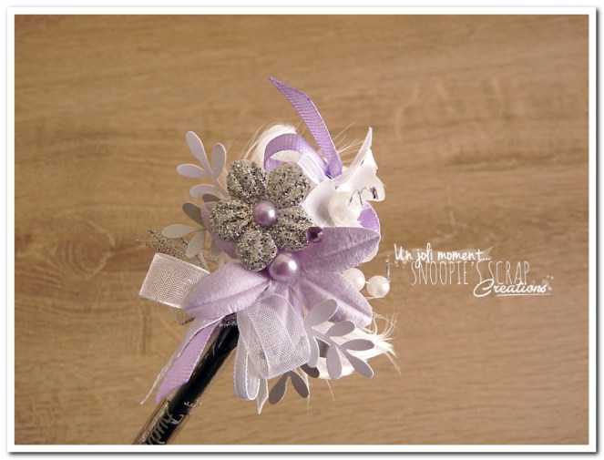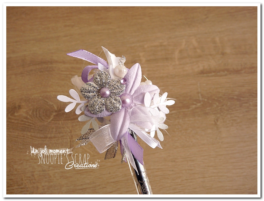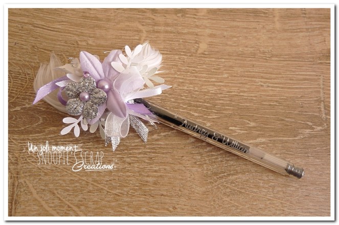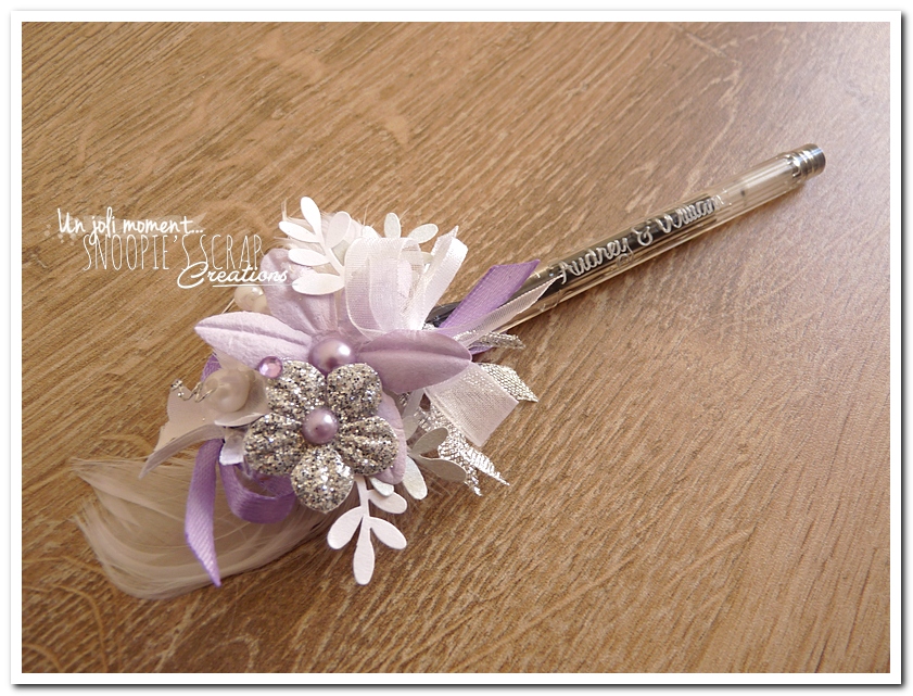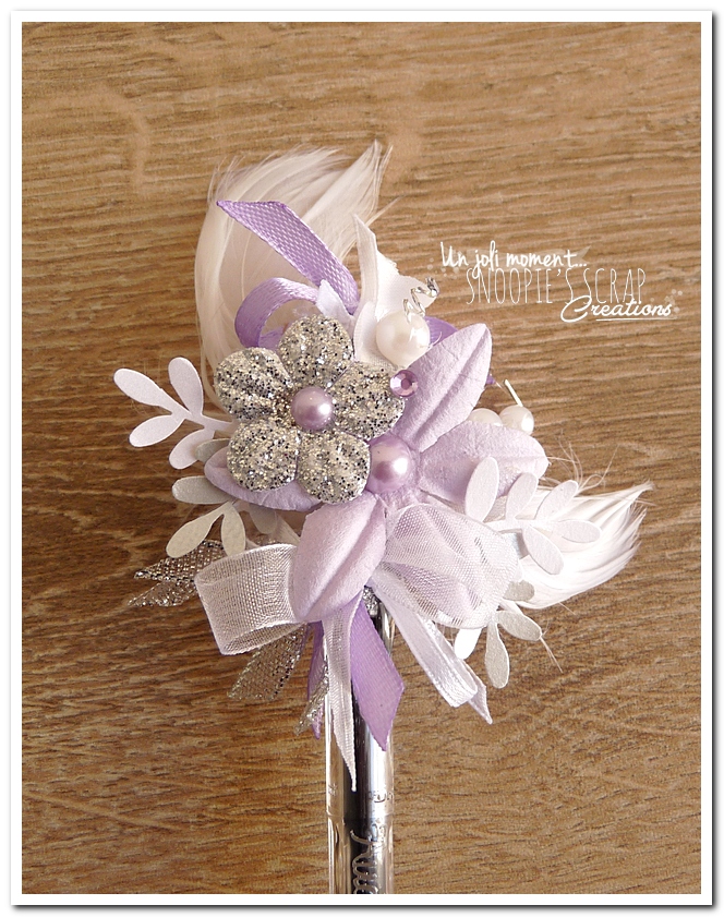 stylo décoré et personnalisé, plumes, strass, perles, fleurs, parme, blanc, argent, feuillage, dentelle, coeurs, audrey & william.