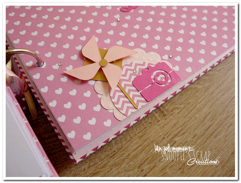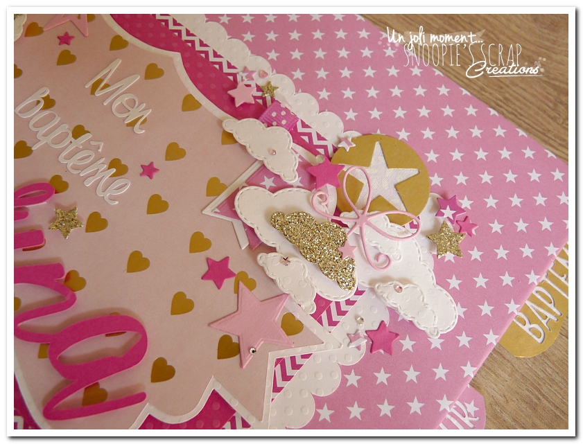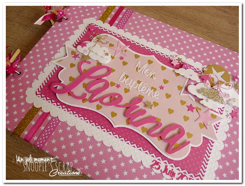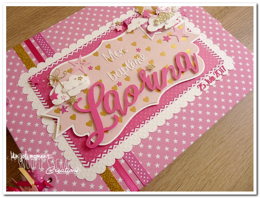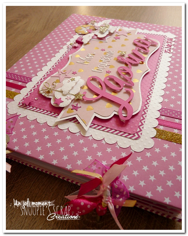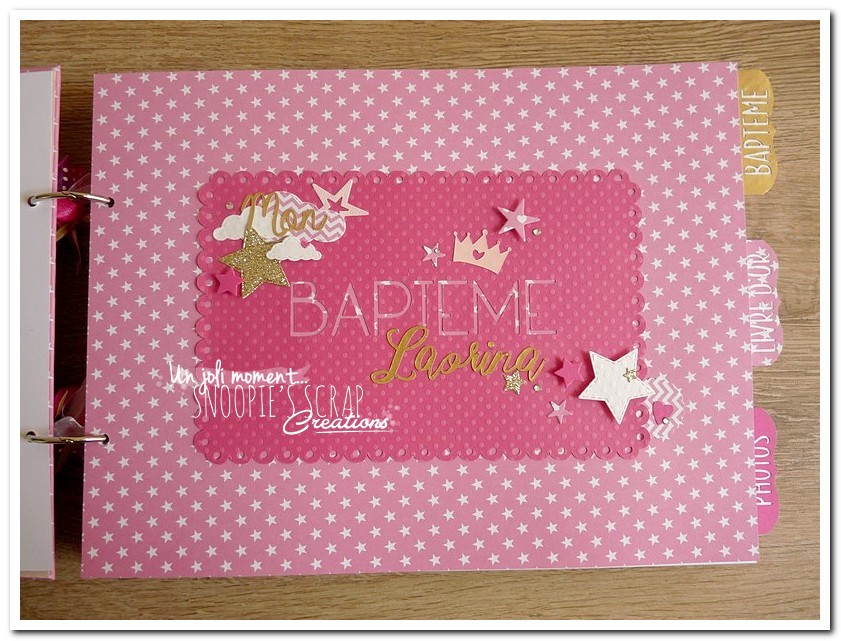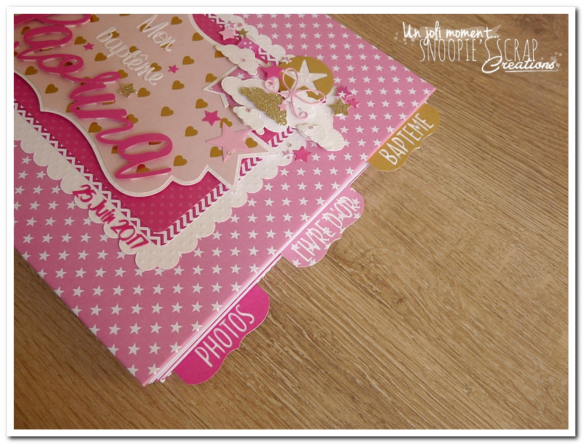 Baptême, Laorina, livre d’or, album photos, onglets, blanc, étoiles, moulin à vent, pois, chevrons, fille, rose, fushia, fuschia, fuchia, doré, or, pailleté, coeurs.