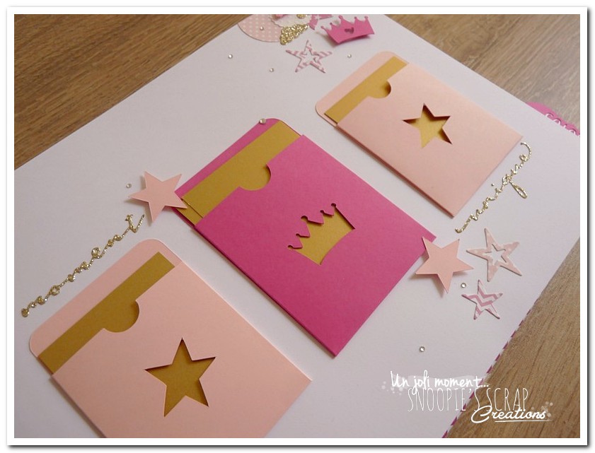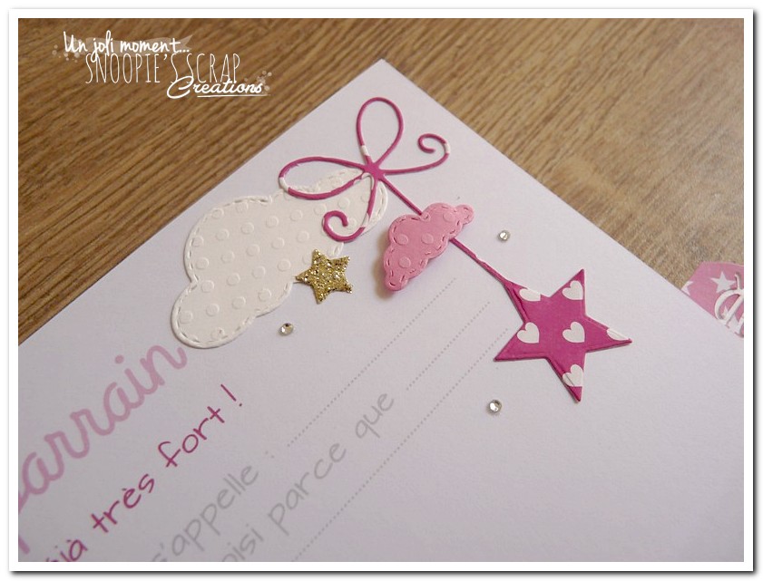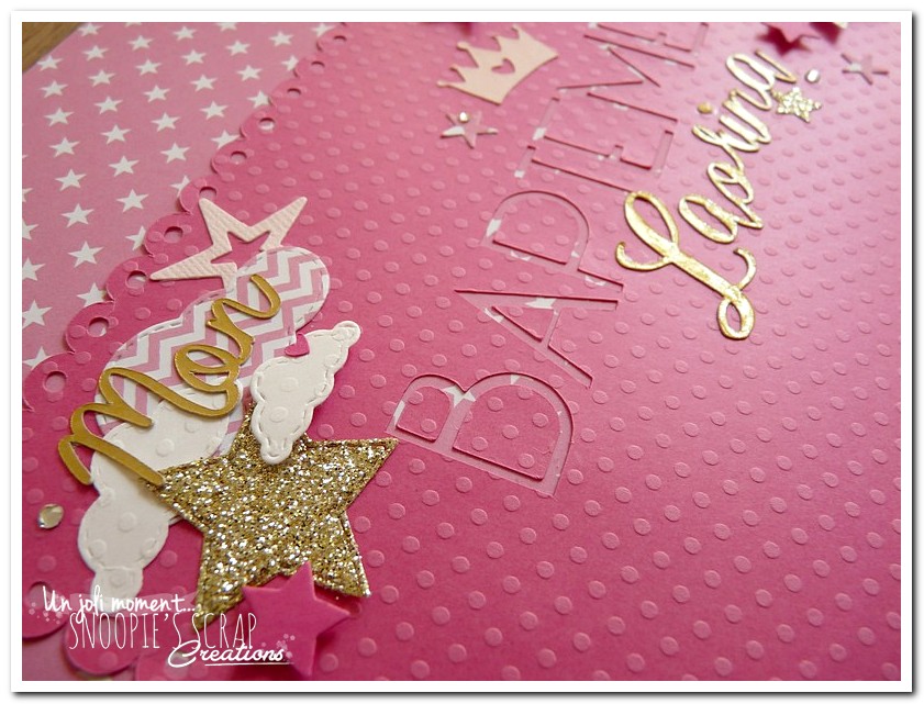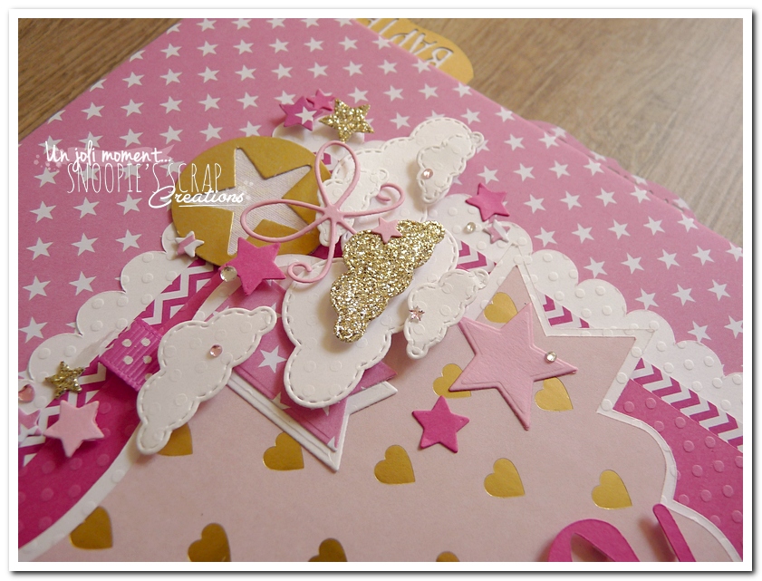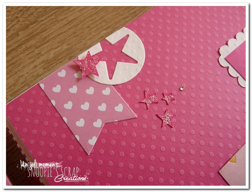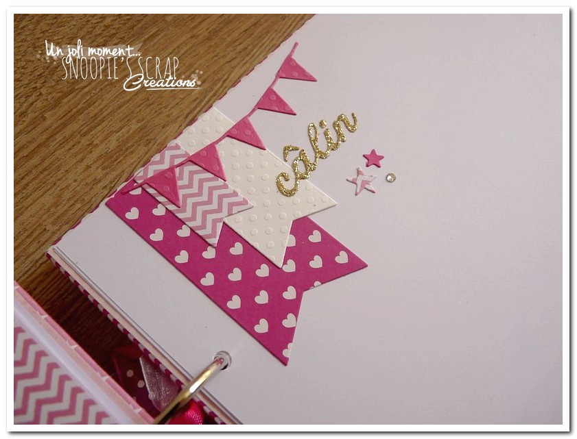 Baptême, Laorina, livre d’or, album photos, onglets, blanc, étoiles, moulin à vent, pois, chevrons, fille, rose, fushia, fuschia, fuchia, doré, or, pailleté, coeurs.