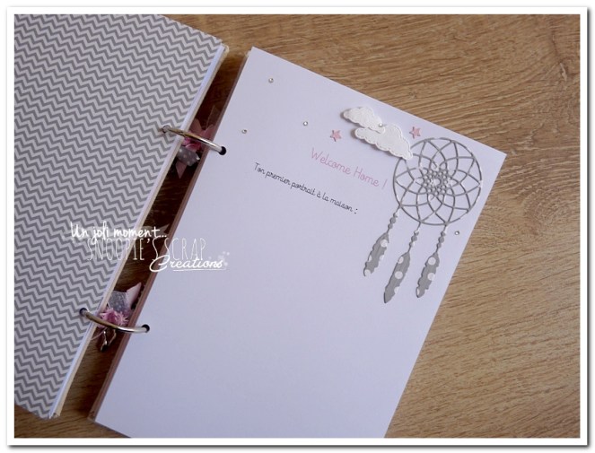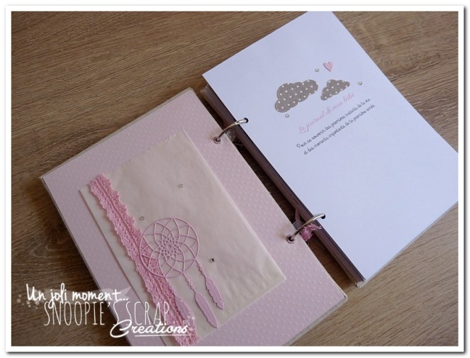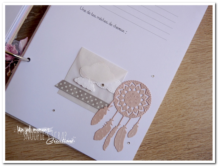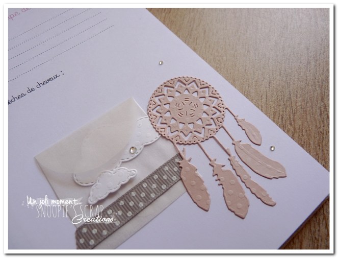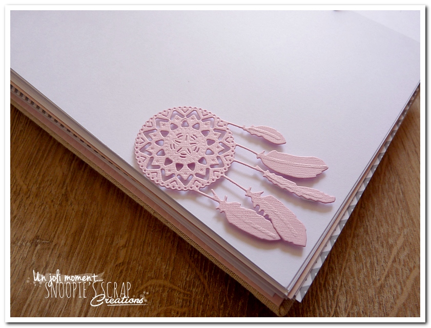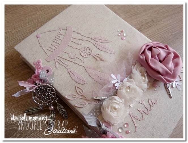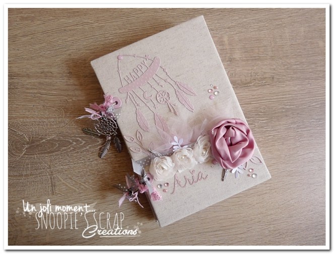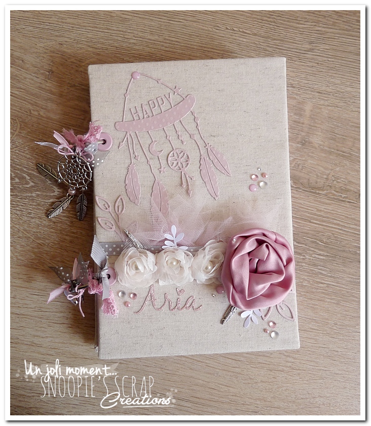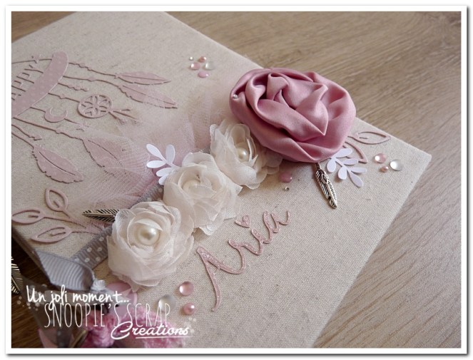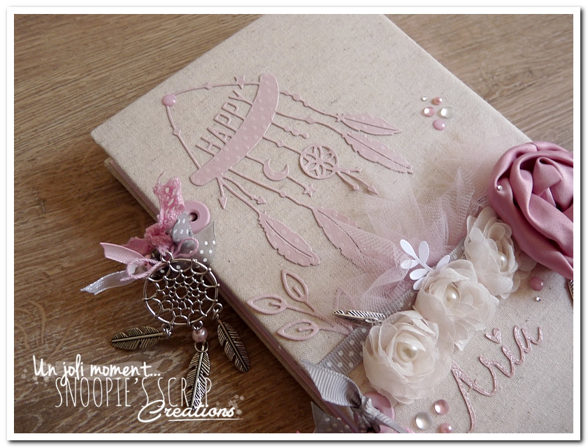livre naissance, baptême, fille, bébé, album, cadeau naissance, album souvenir de naissance, plumes,bébé, rose , lin, gris , vieux rose, dreamcatcher, dream catcher, attrape rêves, attrape-rêves – livre naissance Aria.