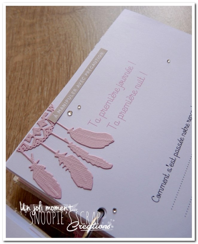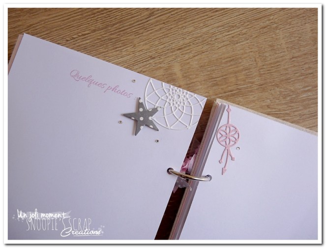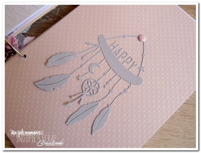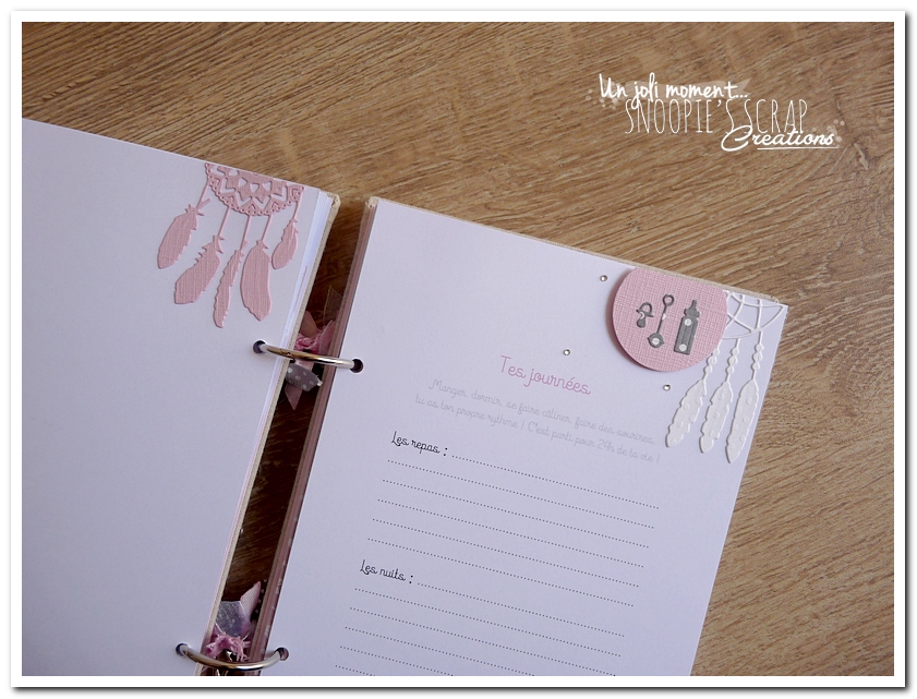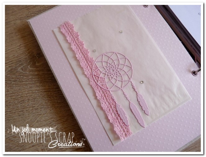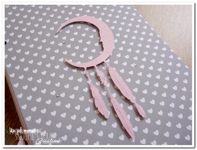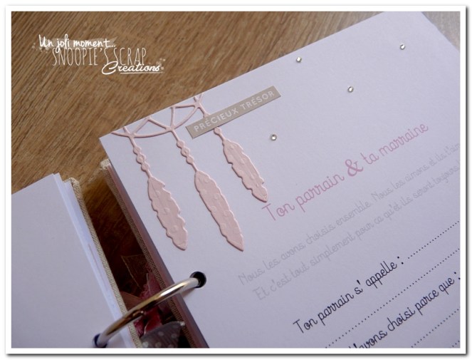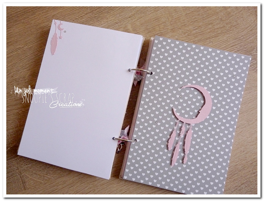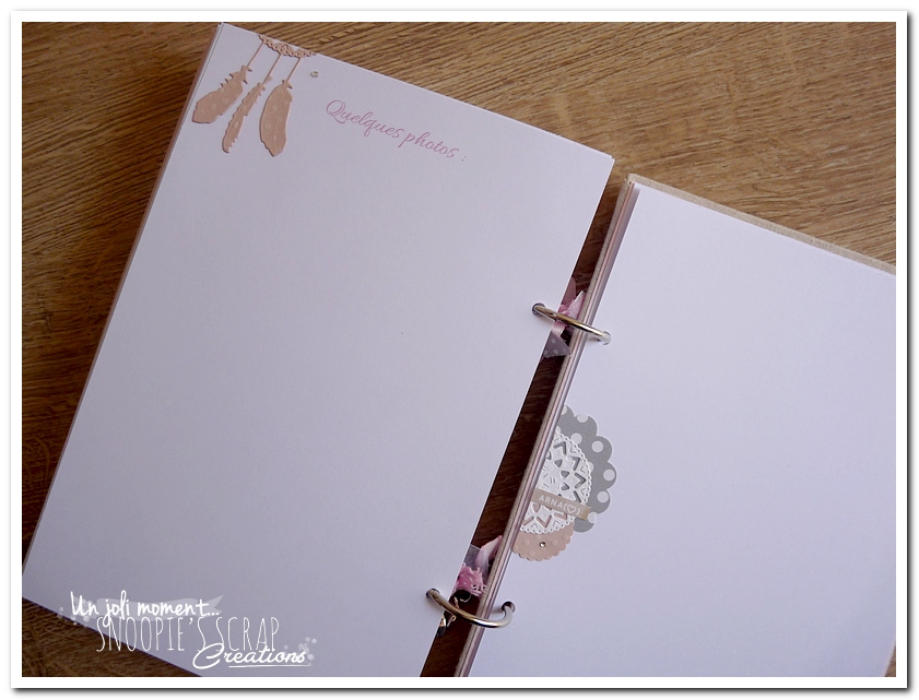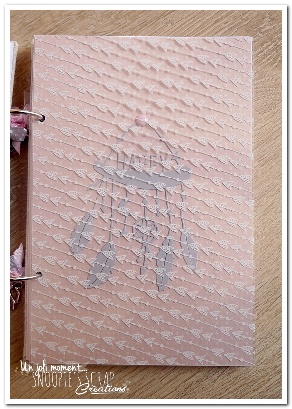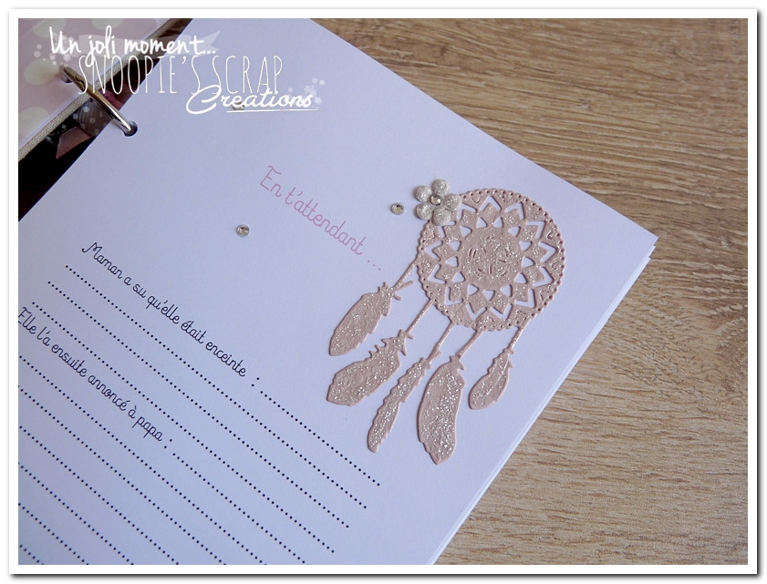 livre naissance, baptême, fille, bébé, album, cadeau naissance, album souvenir de naissance, plumes,bébé, rose , lin, gris , vieux rose, dreamcatcher, dream catcher, attrape rêves, attrape-rêves – livre naissance Aria.