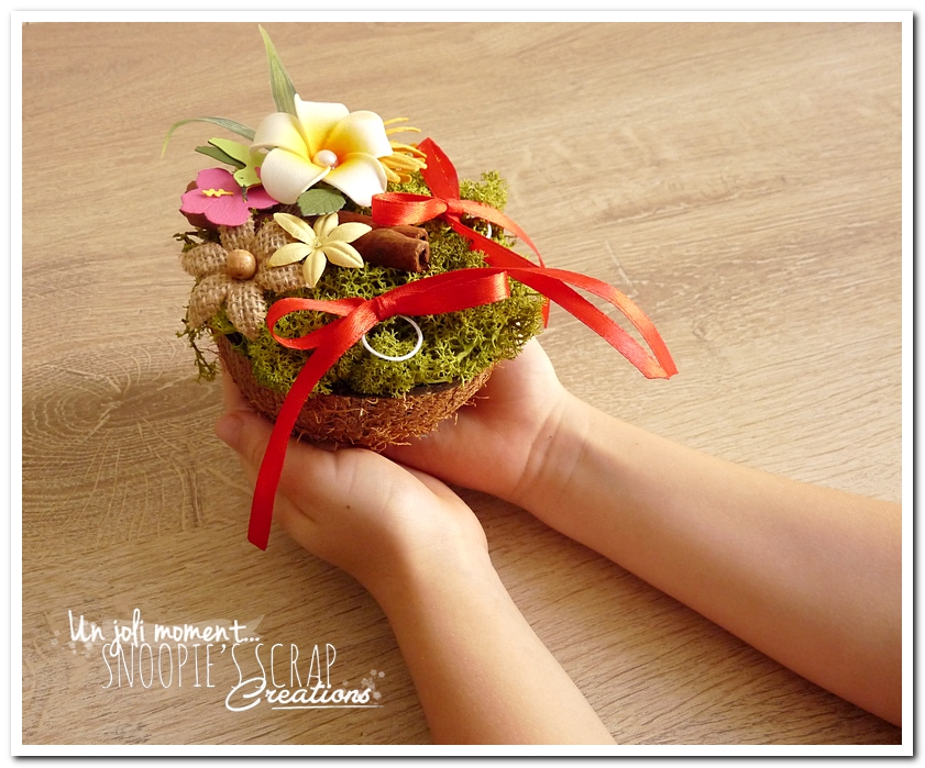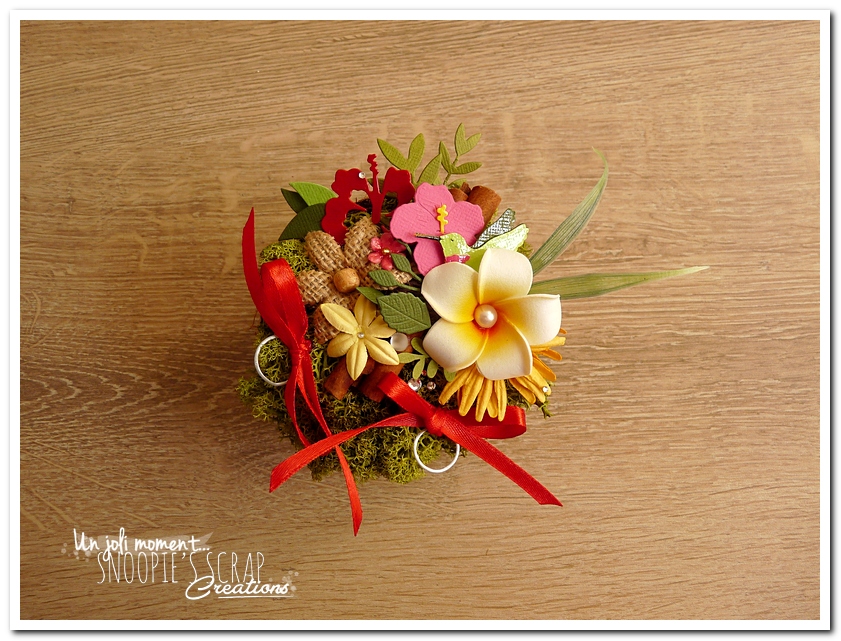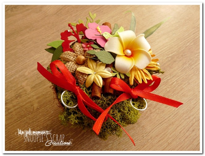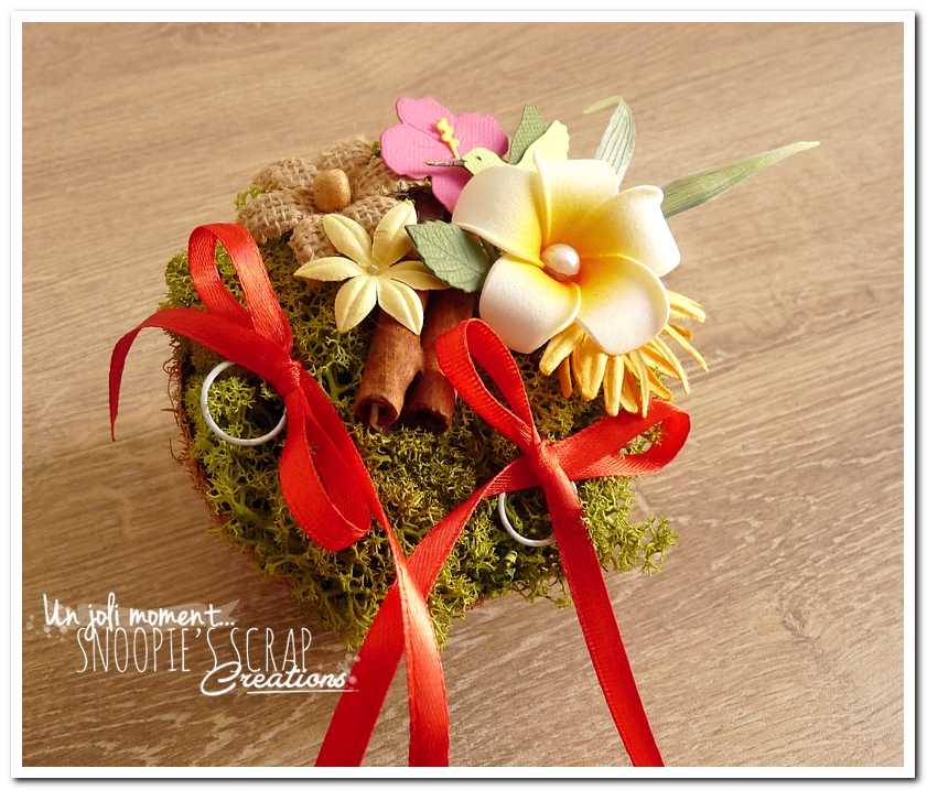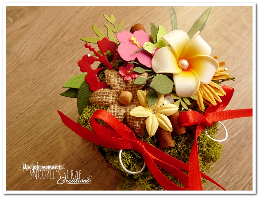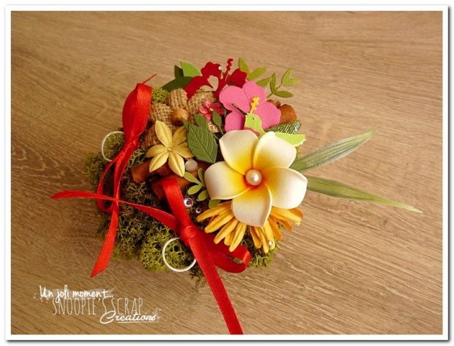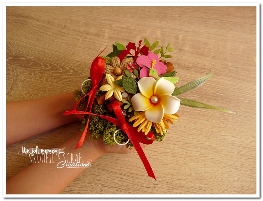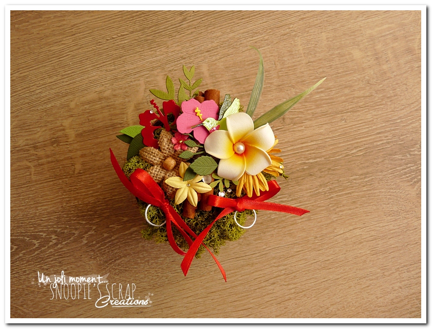 Celui de Sophie & Thierry, à part la coco/mousse/fleur frangipanier, est tout droit sorti de mon imagination, mêlant fleurs en papier & jute.