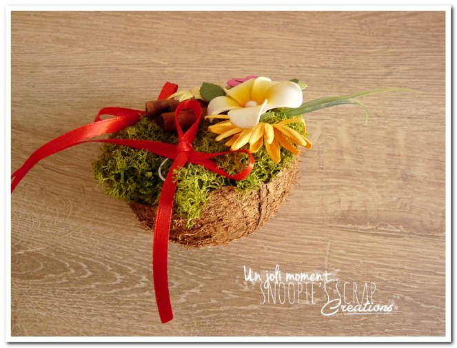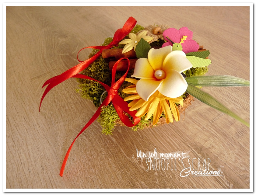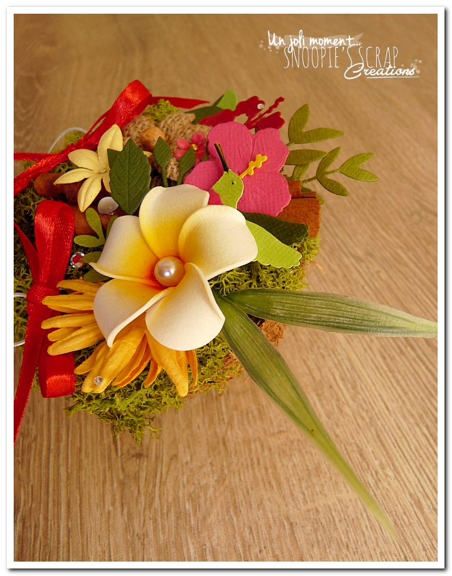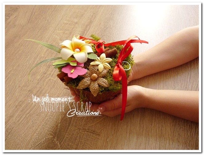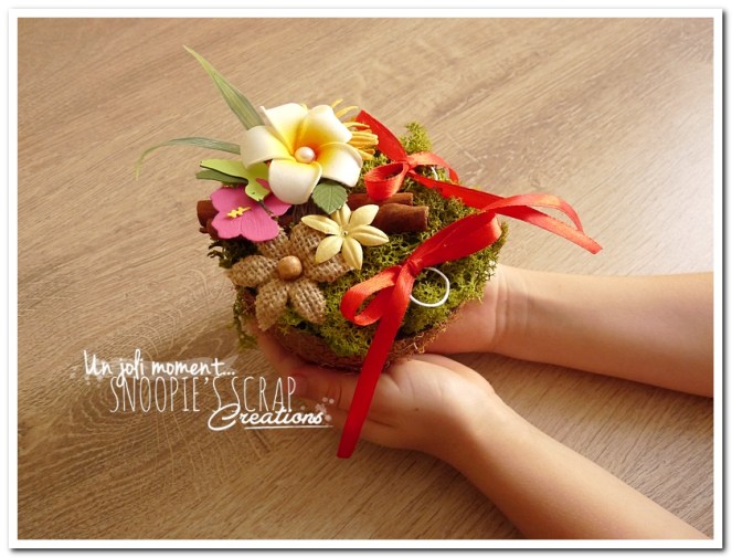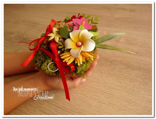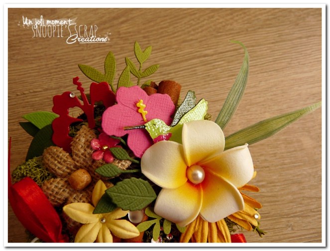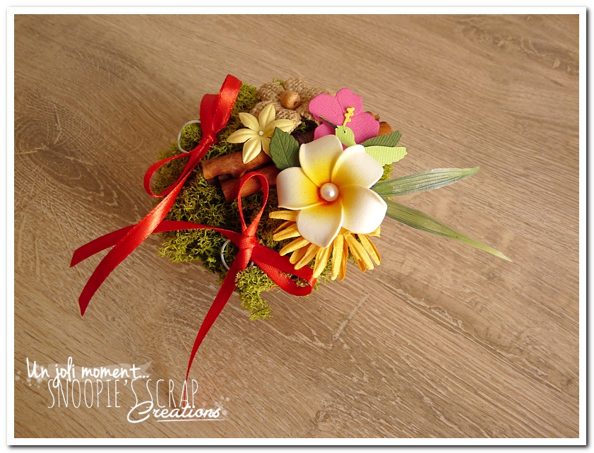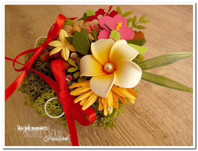 Celui de Sophie & Thierry, à part la coco/mousse/fleur frangipanier, est tout droit sorti de mon imagination, mêlant fleurs en papier & jute.