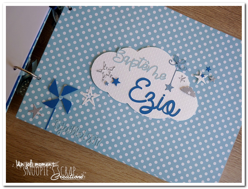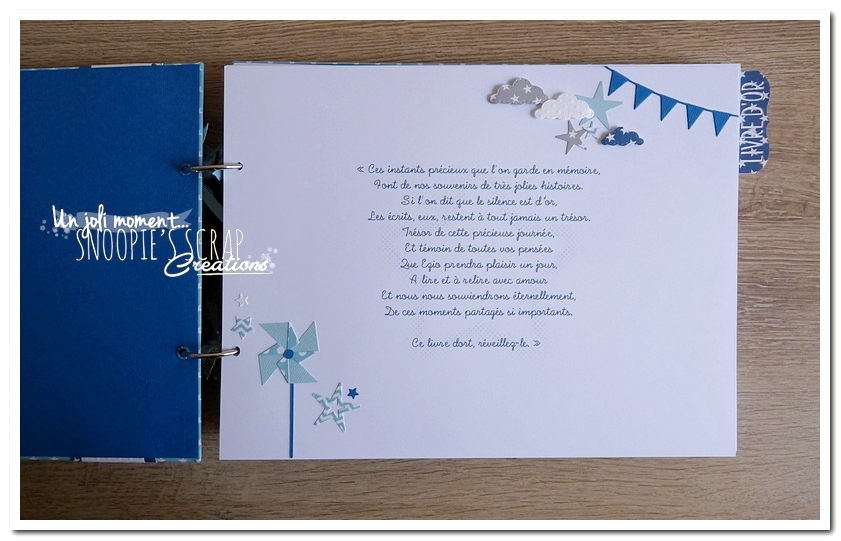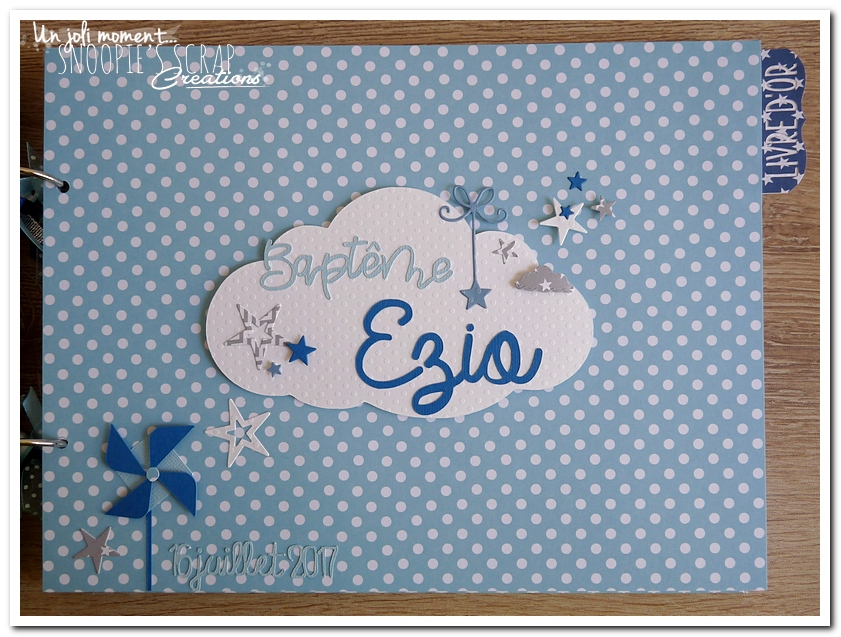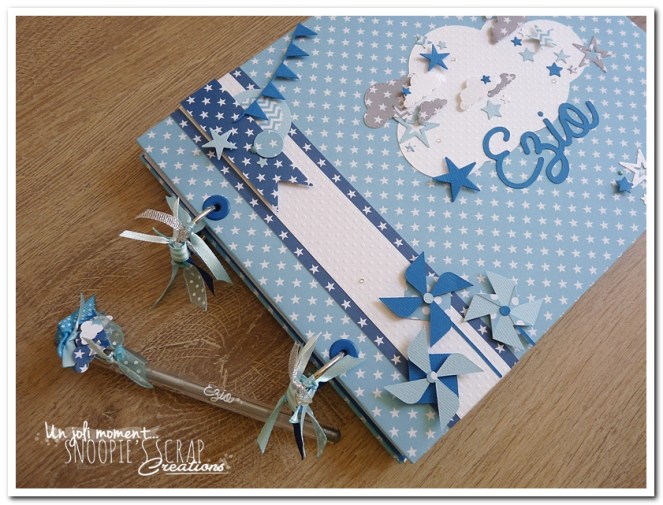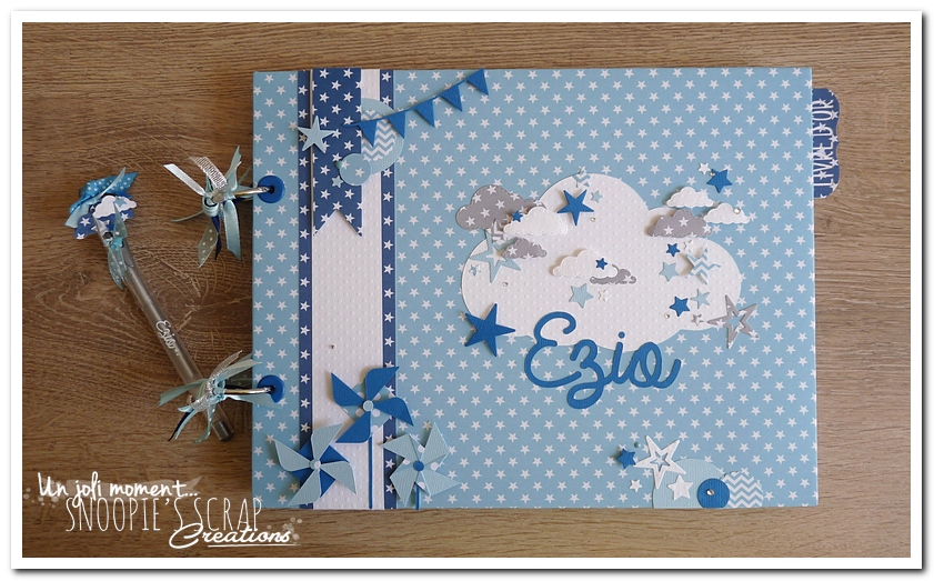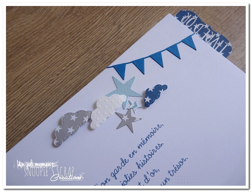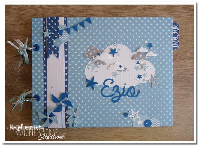 Baptême Manoa Ezio livre d’or, baptême, parrainage civil, mariage, pacs, bleu clair, bleu roi, bleu dur, blanc, jaune, nuages, rubans, fanions, étoiles, moulins à vent, mongolfières.