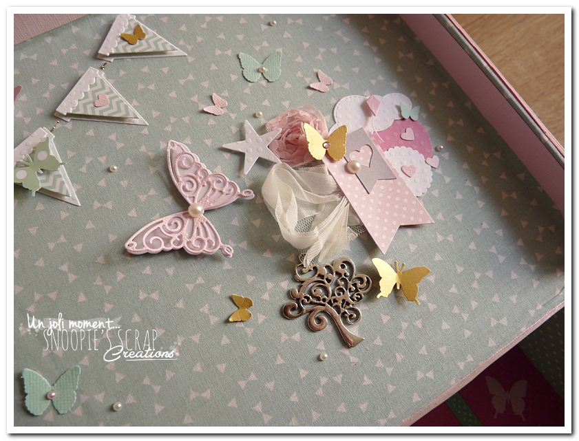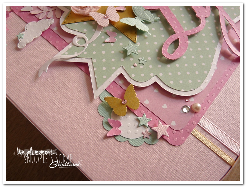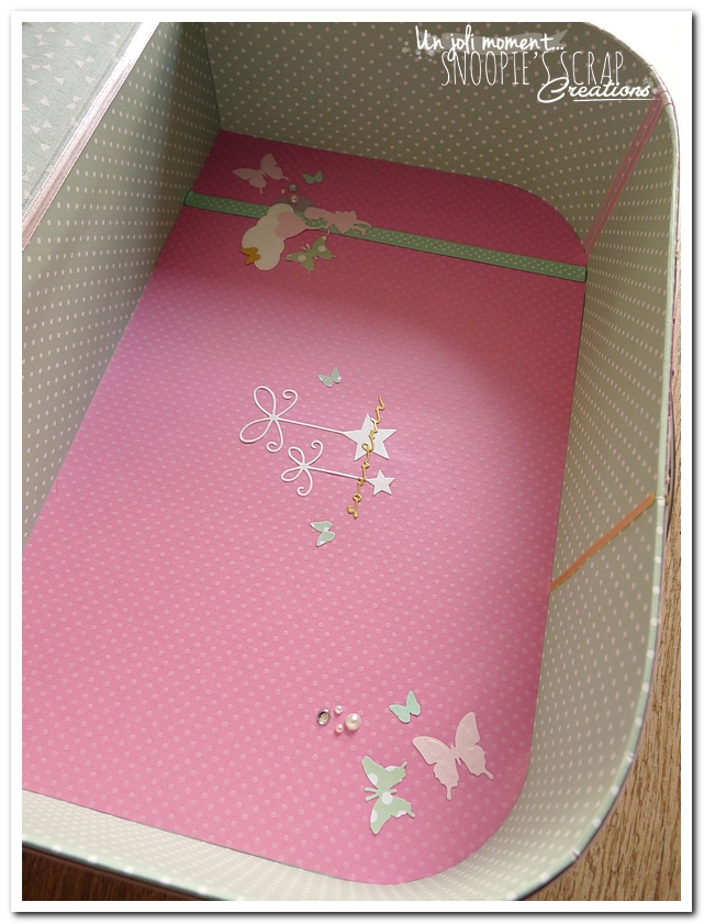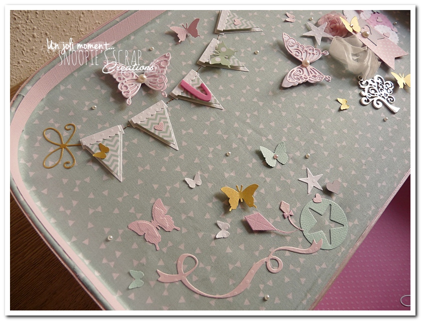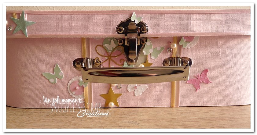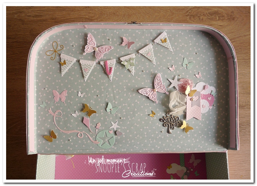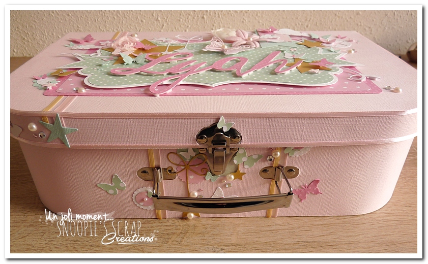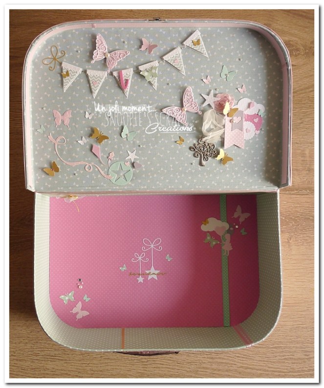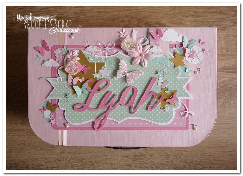 Baptême, anniversaire,  valise,  boîte souvenirs,  menthe vert d’eau, turquoise clair, blanc, gris, étoiles,  pois, chevrons, rose, fushia, fleurs, fille, Lyah, nuages, papillons, arabesques.