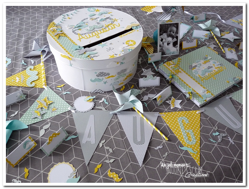 Baptême, parrainage civil, candy Bar, guirlande banderole prénom, papeterie et décoration de table, souvenirs, aqua, jaune, menthe vert d’eau, turquoise clair, blanc, gris, étoiles, moustache, mustache, Augustin, pois, chevrons, garçon.