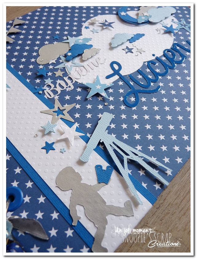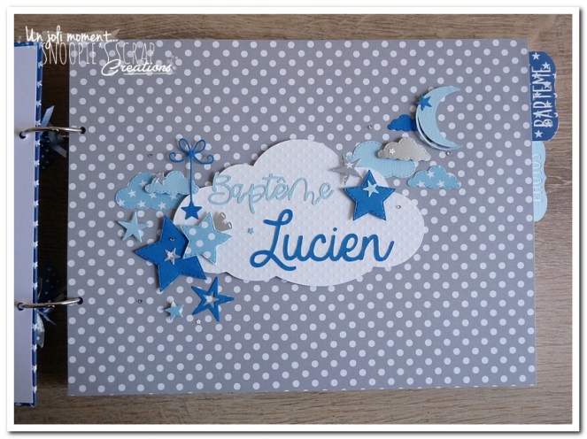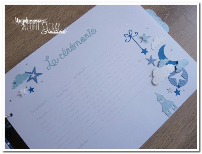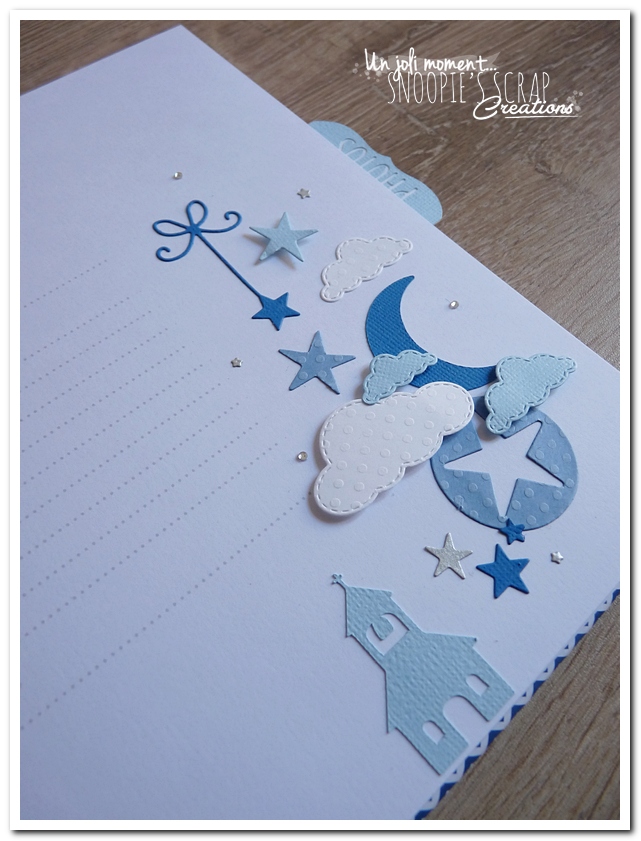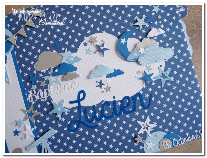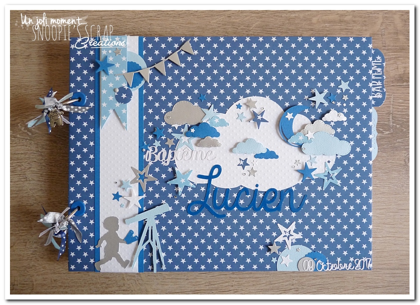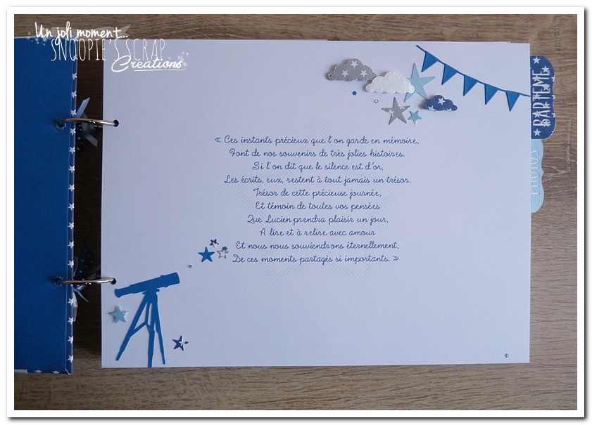 Baptême Manoa Léana Leana livre d’or, baptême, parrainage civil, mariage, pacs, argent, bleu ciel, bleu pâle, bleu clair, turquoise, argent, gris, blanc, nuages, rubans, fanions, étoiles, lune, ciel, Ninon, Lucien, astronomie, jumelles, télescope…