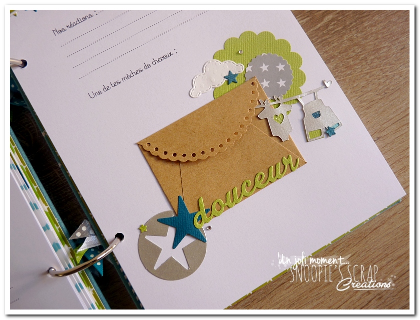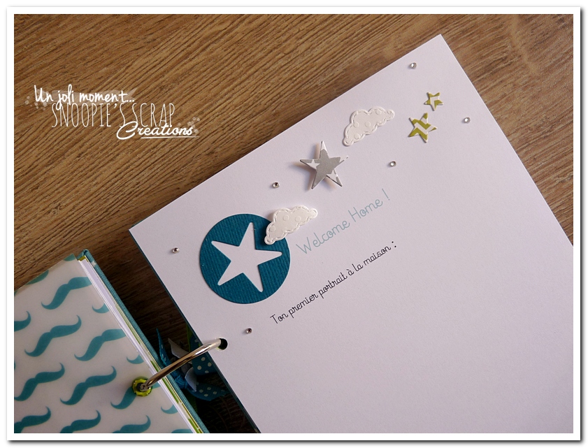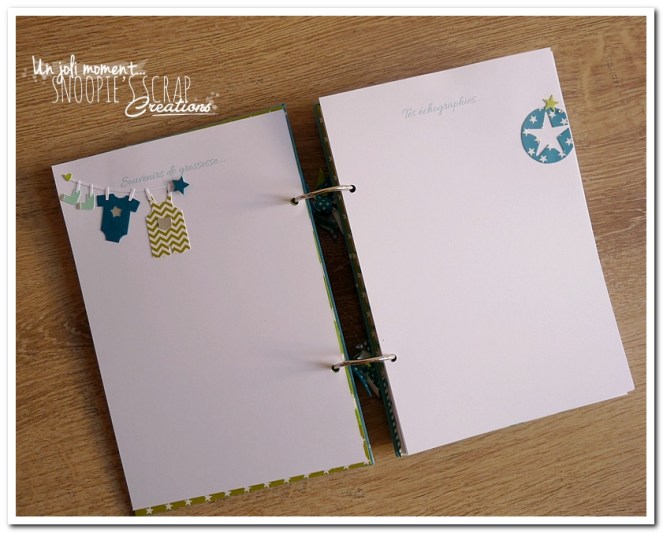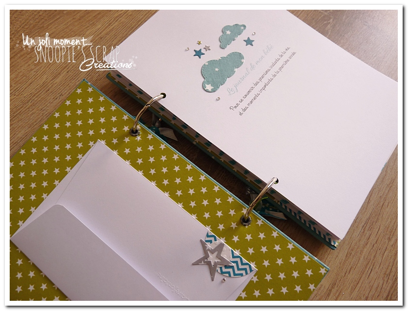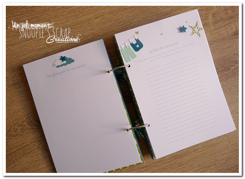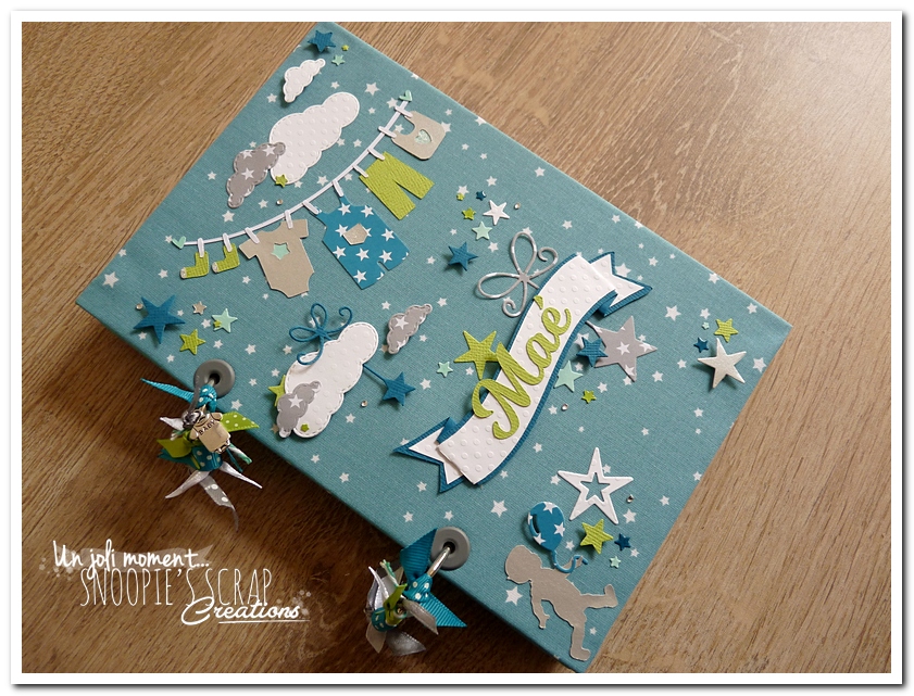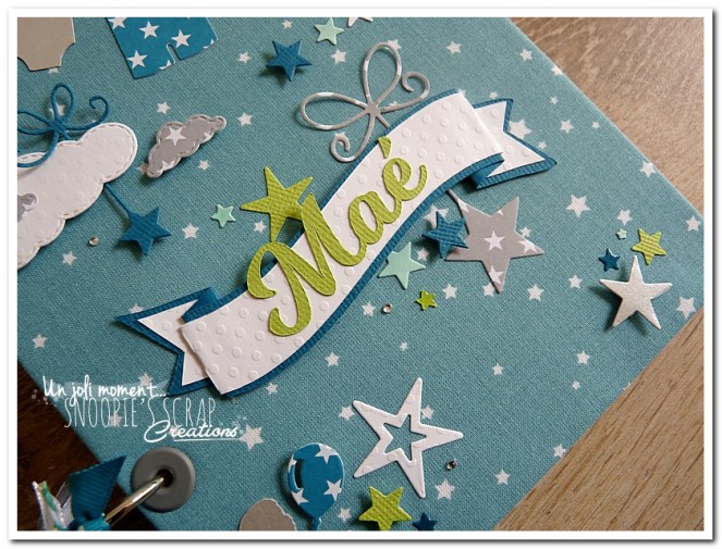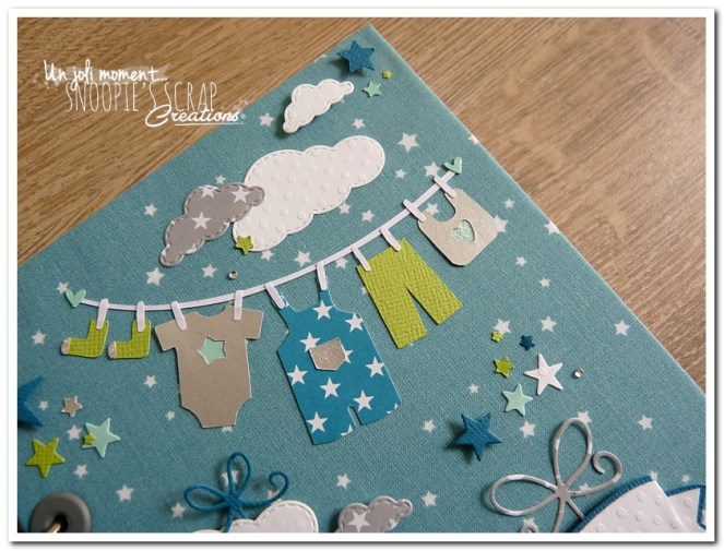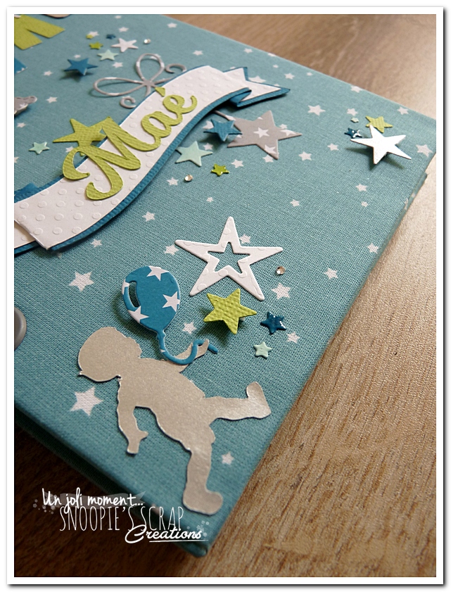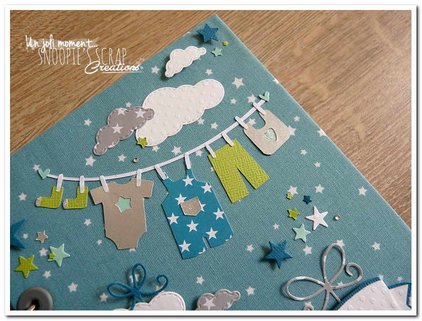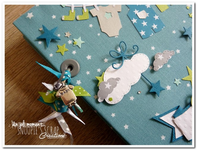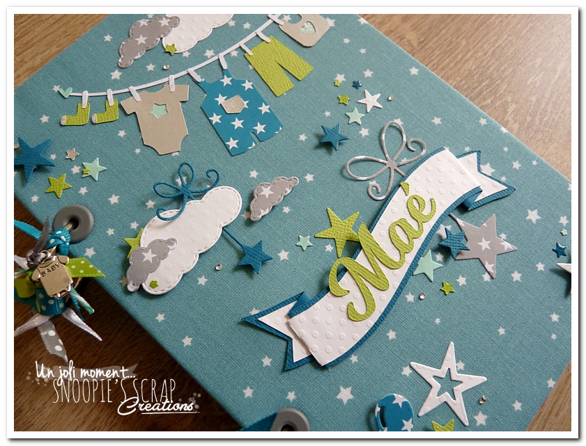 livre de naissance, cadeau de naissance, baby shower, album photo, souvenirs de naissance, maternité, blanc, gris, étoiles, nuages, mongolfière, noeud, Sacha, Malonn, bleu pétrole, vert anis, vêtements de bébé, bleucanard maé.