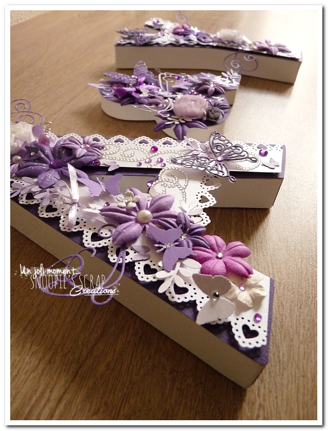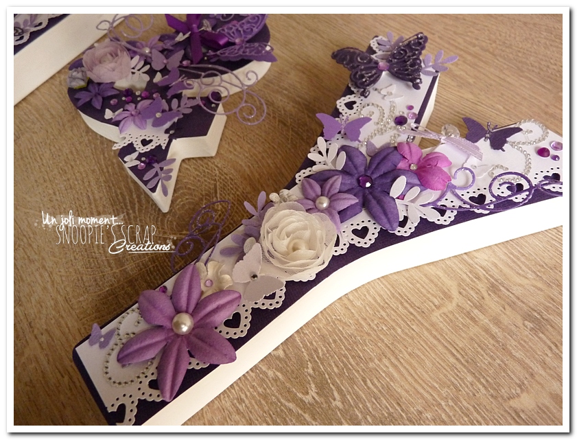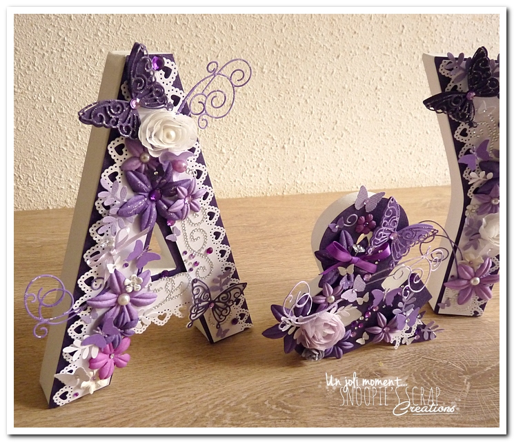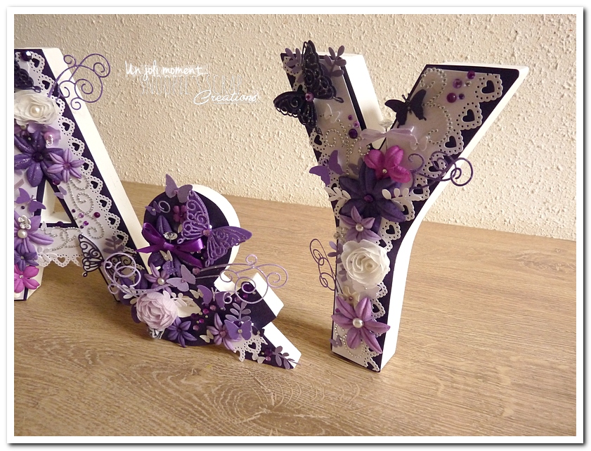 initiales, lettres, décorées, strass, perles, fleurs, parme, blanc, argent, feuillage, dentelle, coeurs, adeline & yannick, violet.