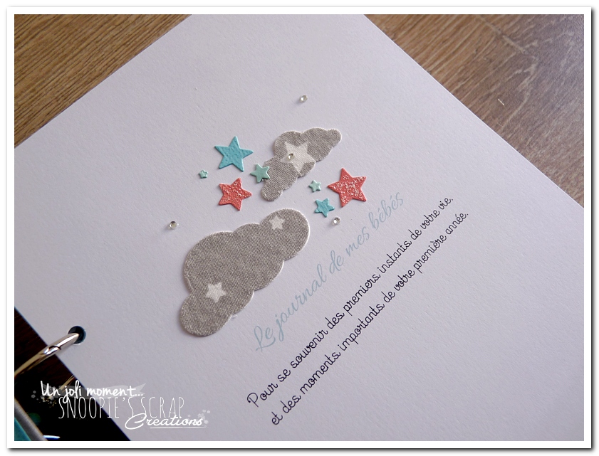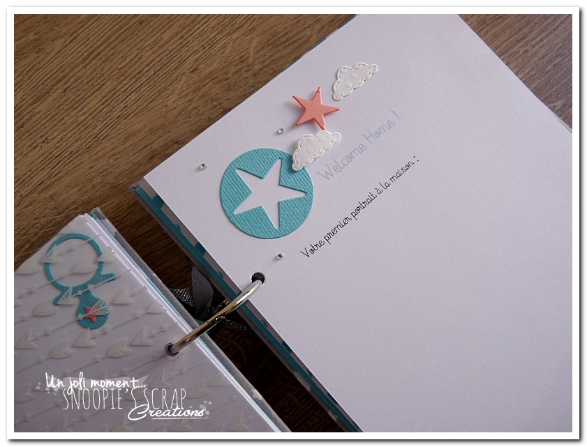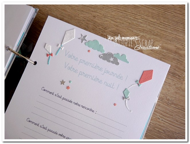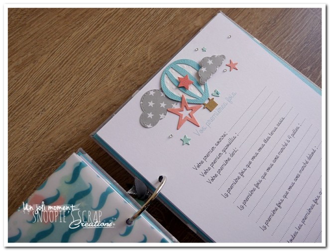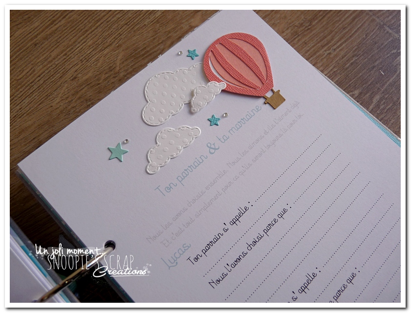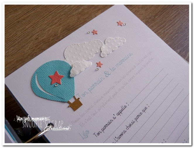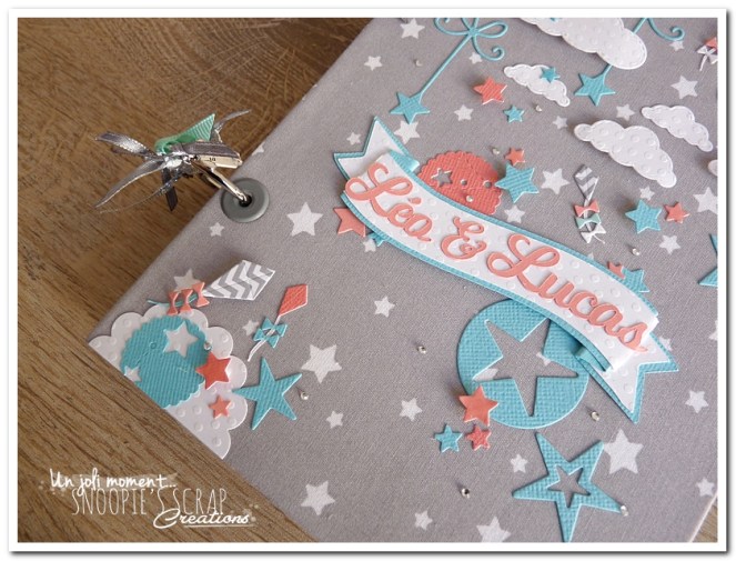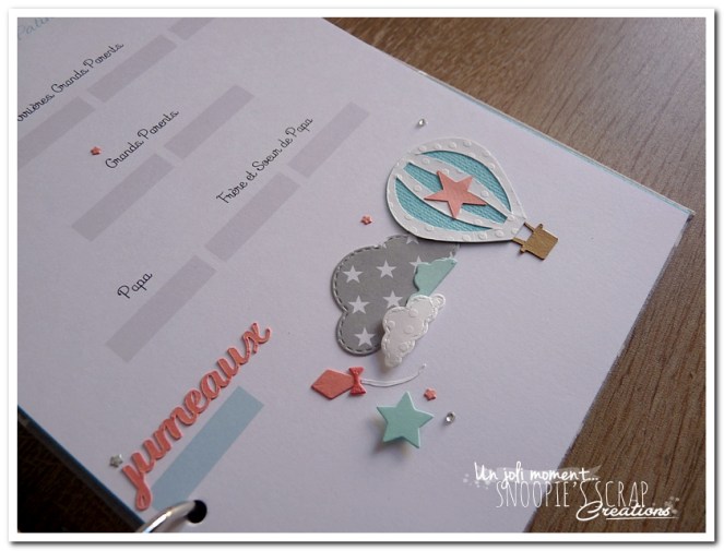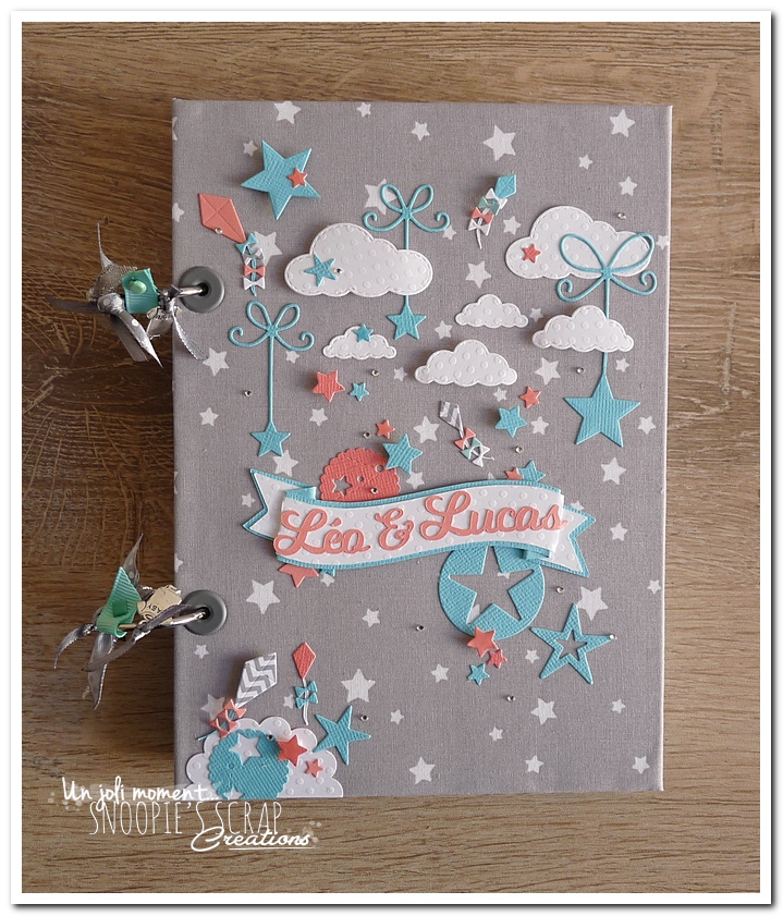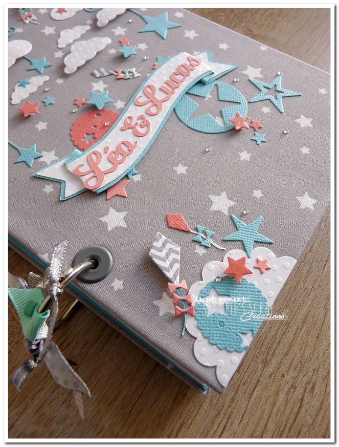 livre de naissance, cadeau de naissance, baby shower, album photo, souvenirs de naissance, maternité, corail, turquoise, blanc, gris, étoiles, nuages, mongolfière, voyage, noeud, Sacha, Léo & Lucas, livre de naissance pour jumeaux, frères, frère & soeur.
