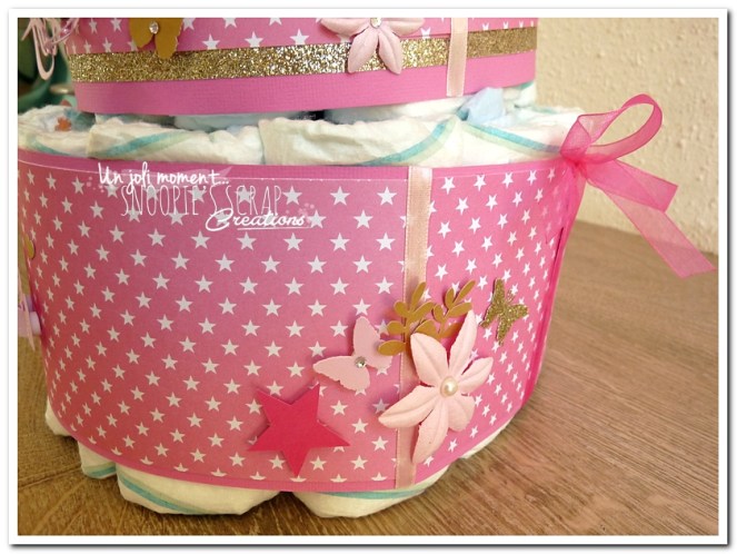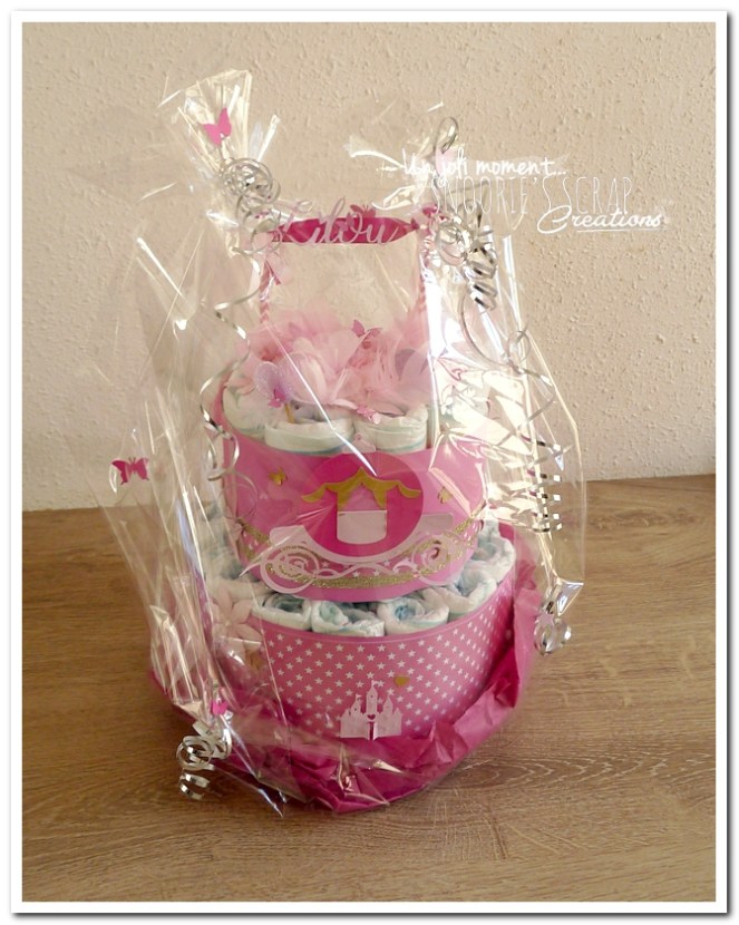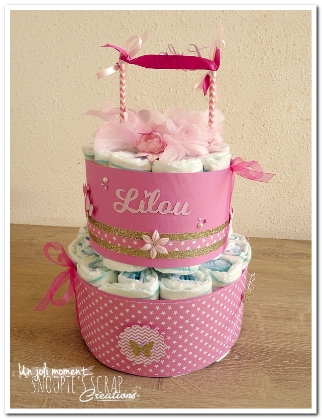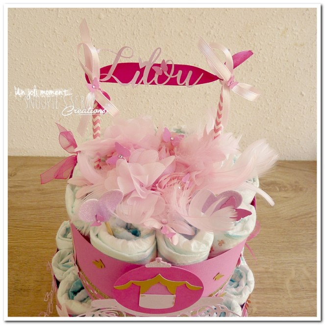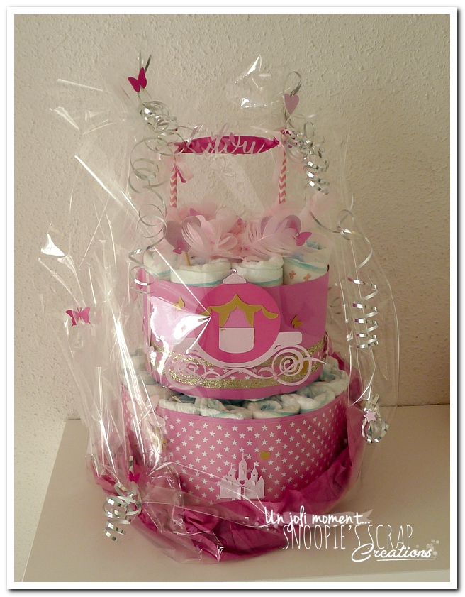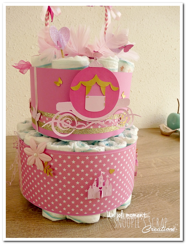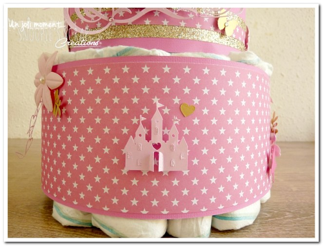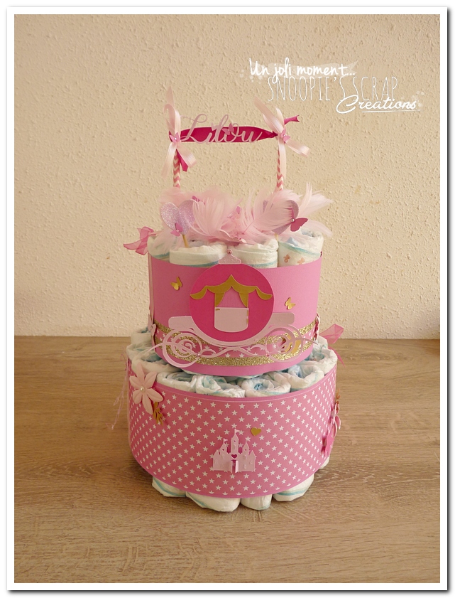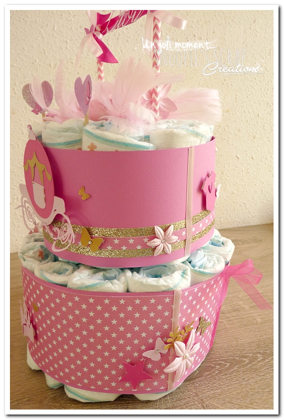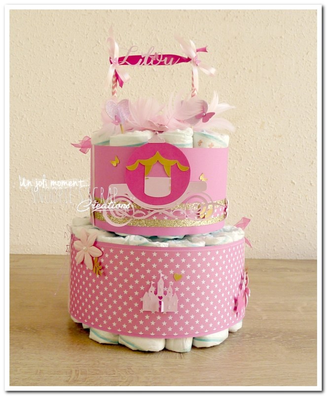 gâteau de couches, 2 étages, cadeau de naissance, fille, garçon, girly, princesse, rose, fushia, paillettes, disney, or, doré, Lilou.