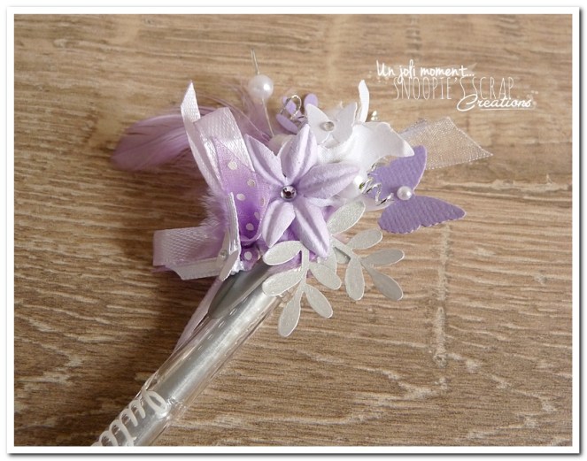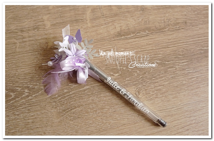stylo décoré & personnalisé, mariage, pacs, Julie & Fardjan, parme, blanc & argent, violet, douceur, romantisme, romantique, arabesques, plumes, roses, fleurs, strass, paillettes, champêtre chic.