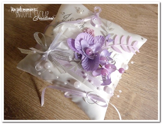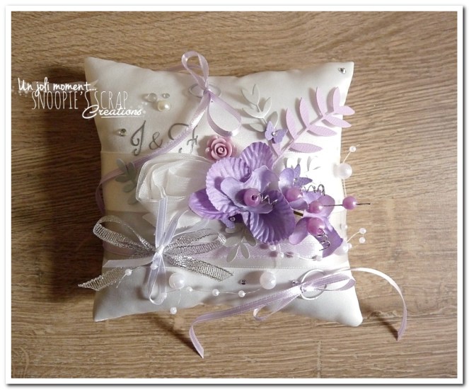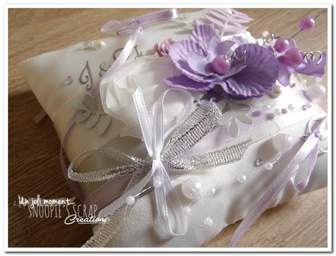 Voici donc le coussin d’alliances, un peu plus traditionnel, décoré sur la base de celui de Laura & Mikael