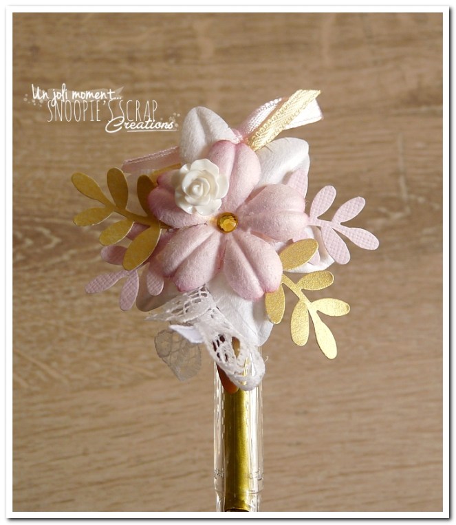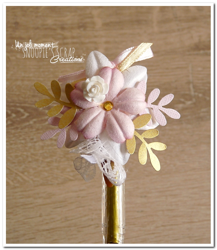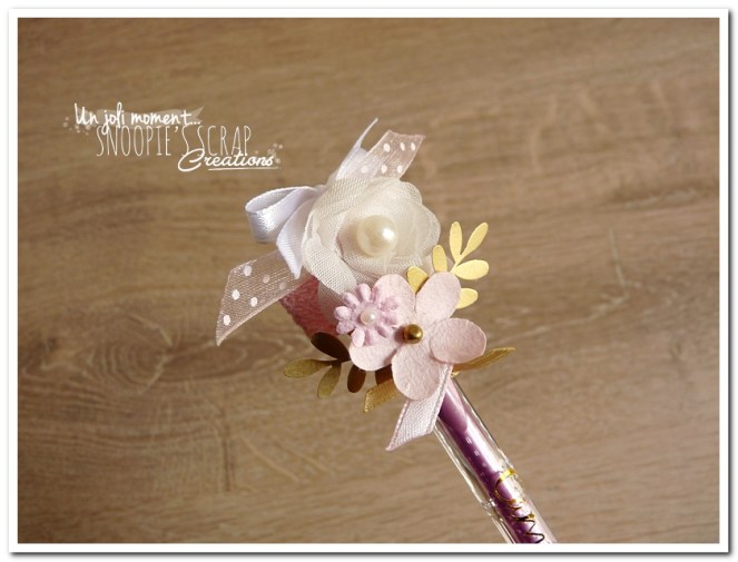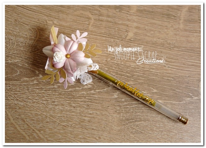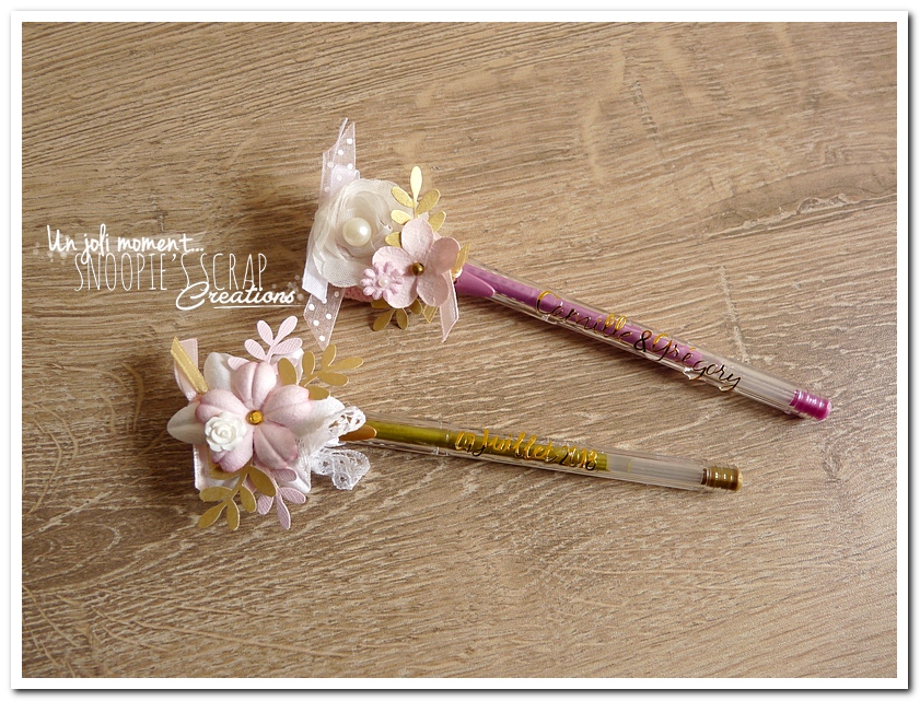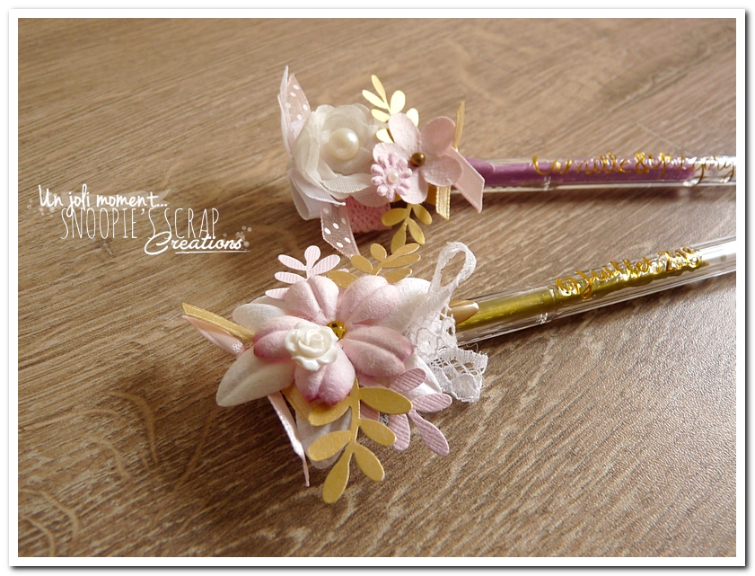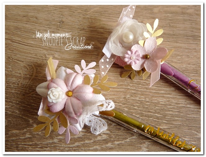 stylos décorés assortis au livre d’or, livre d’or mariage, vintage, rétro, dentelle, clés, métal, serrure, rubans, fleurs, doux, rose pastel, blanc cassé, romantique, romantique chic, fleuri, rose, blanc, doré, or, Camille & Grégory.