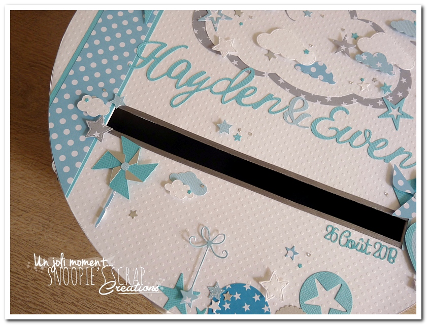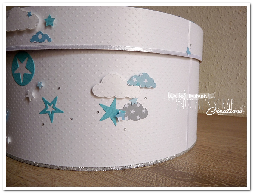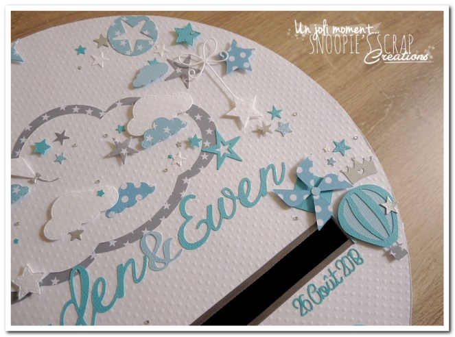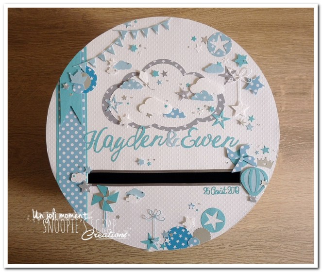 tirelire ronde. Urneronde, urne ronde,Baptême, anniversaire, Bapt’iversaire, urne, tirelire, boîte souvenirs,, bleu clair, argent, turquoise clair, blanc, gris, étoiles, moulin à vent, pois, chevrons, garçon, montgolfière, aqua, Hayden & Ewen.ronde