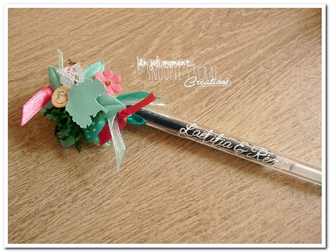 stylos décorés assortis au livre d’or, livre d’or mariage, dentelle, rubans, fleurs, fleuri, bois, rondin, mousse,arbre & petite touche attrapes rêves,herbe, forêt, nature, champêtre, vert menthe, mint, corail, pêche. Laëtitia & Rémi.