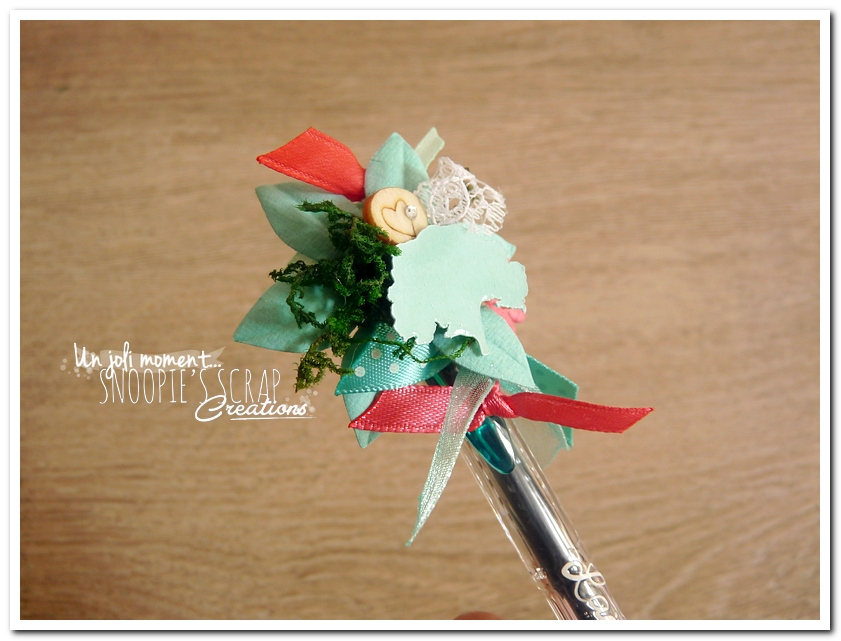 stylos décorés assortis au livre d’or, livre d’or mariage, dentelle, rubans, fleurs, fleuri, bois, rondin, mousse,arbre & petite touche attrapes rêves,herbe, forêt, nature, champêtre, vert menthe, mint, corail, pêche. Laëtitia & Rémi.