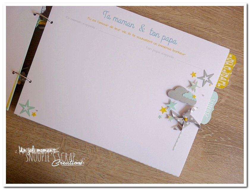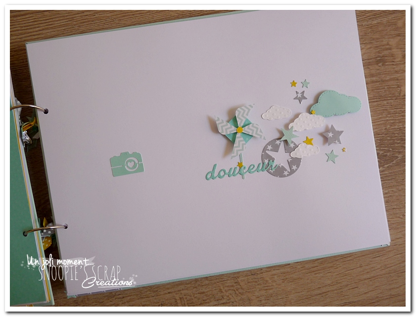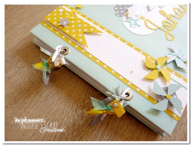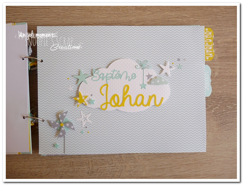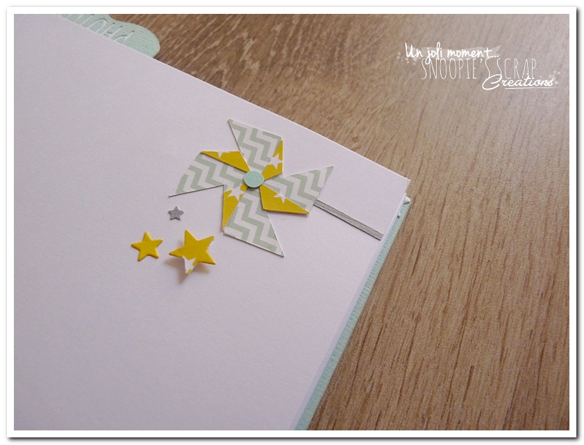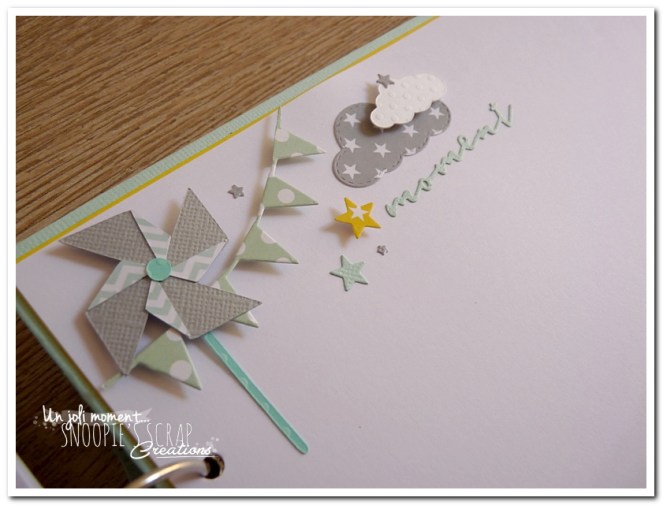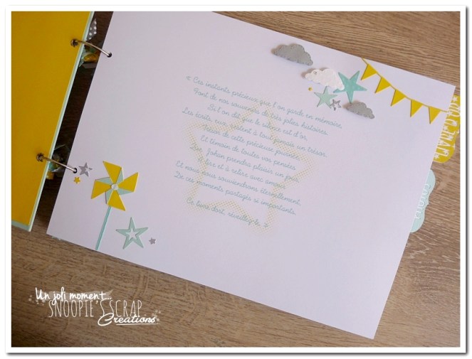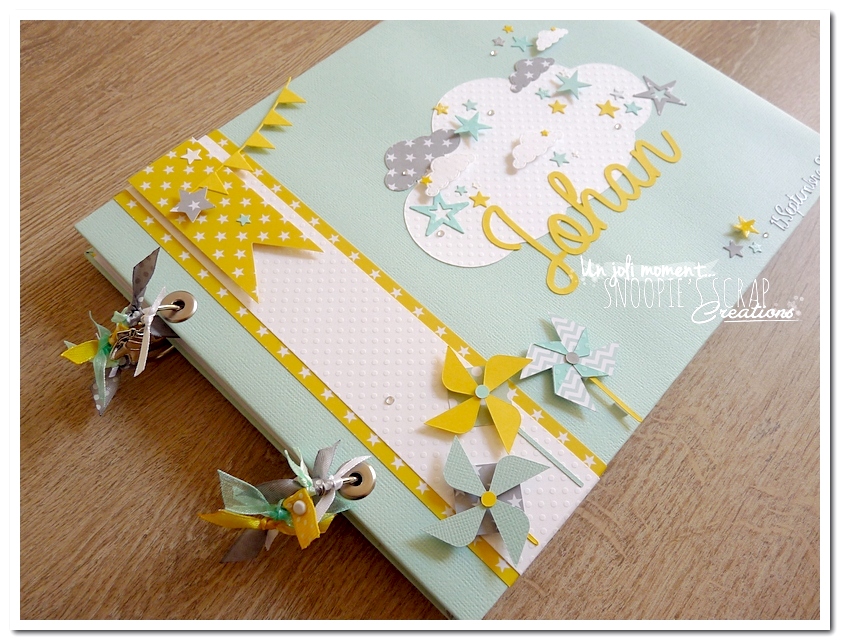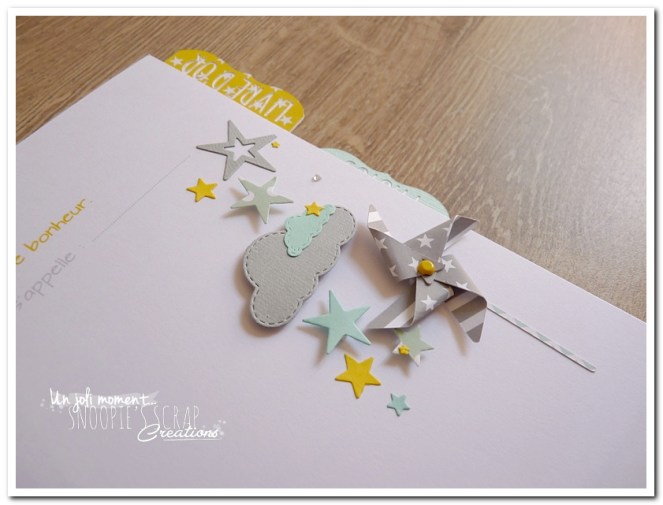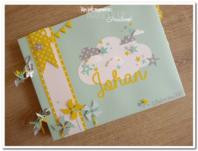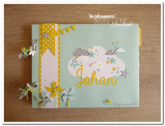 Baptême Johan, Manoa livre d’or, baptême, parrainage civil, mariage, pacs, bleu mint, menthe, vert d’eau, turquoise, blanc, jaune, nuages, rubans, fanions, étoiles, moulins à vent