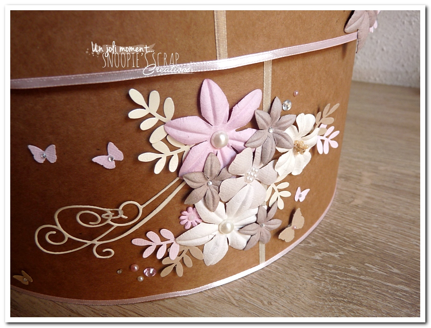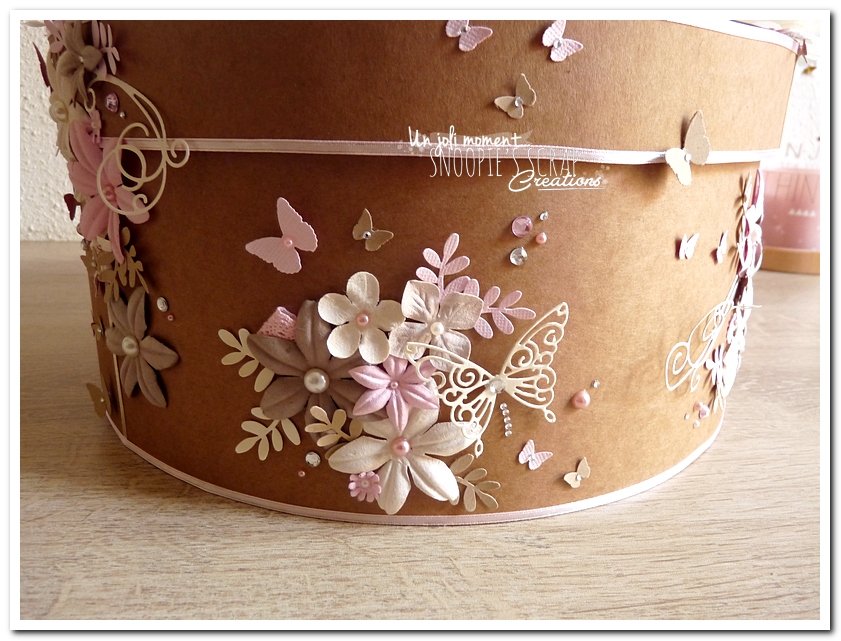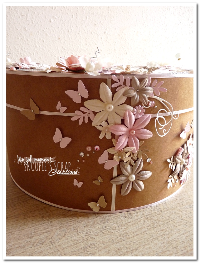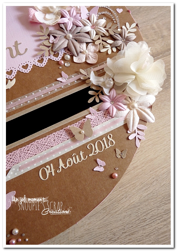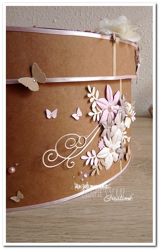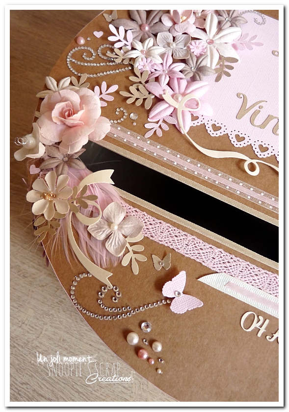 tirelire, boîte à rêves, boîte voyage, voyage de noces, honymoon, urne mariage, vintage, rétro, dentelle,plumes, romantique, ivoire, coeur, beige, taupe, kraft, roses, papillons, rubans, fleurs, doux, vieux rose, rose, blanc, ivoire, Leyla & Vincent ronde