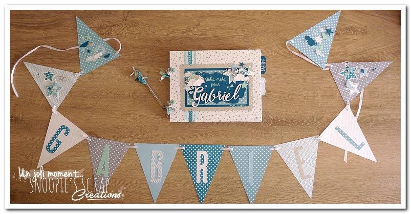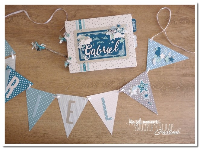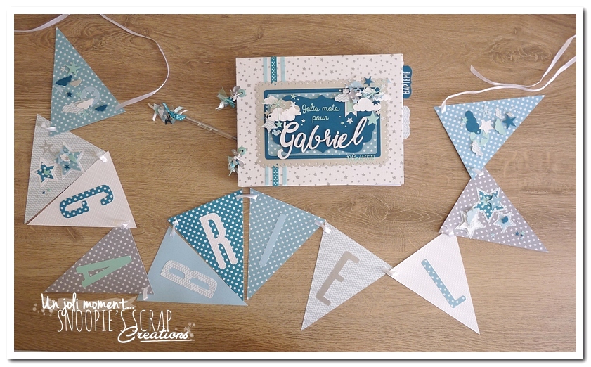 Ici celle de Gabriel, avec son prénom inscrit, assortie au livre d’or & stylo, dans les couleurs de son Baptême.