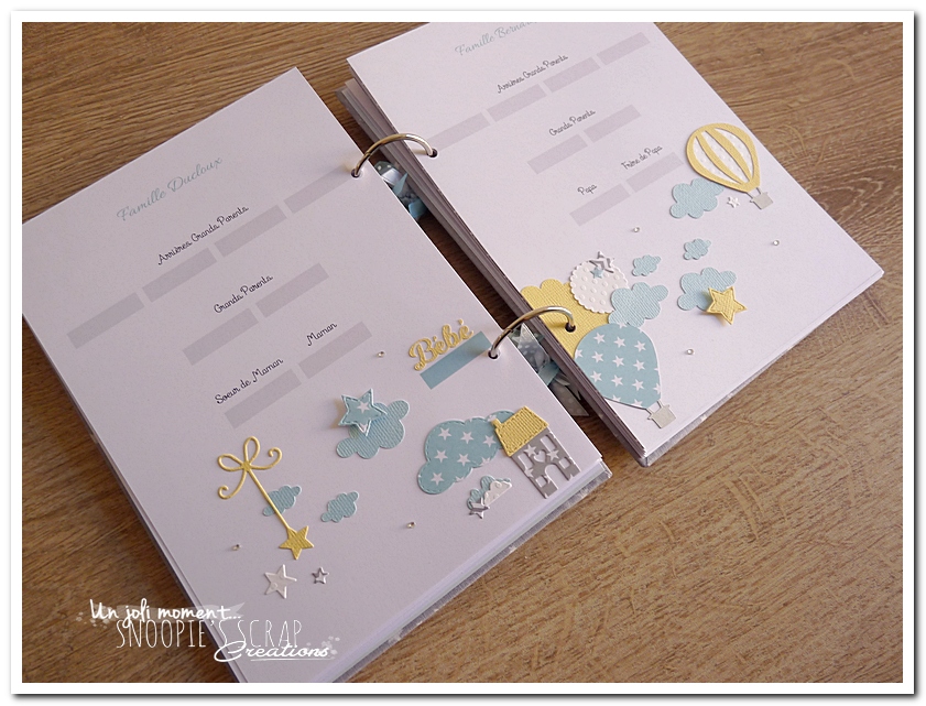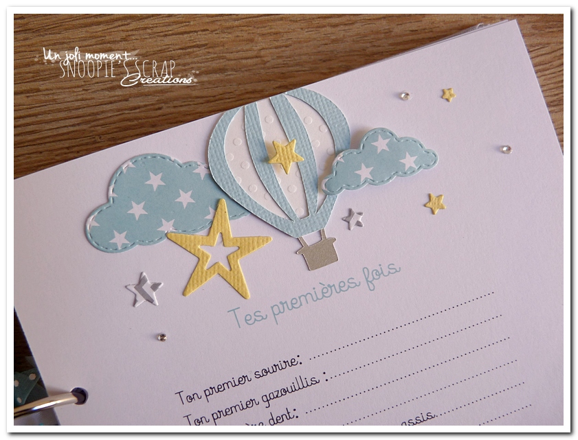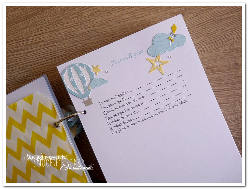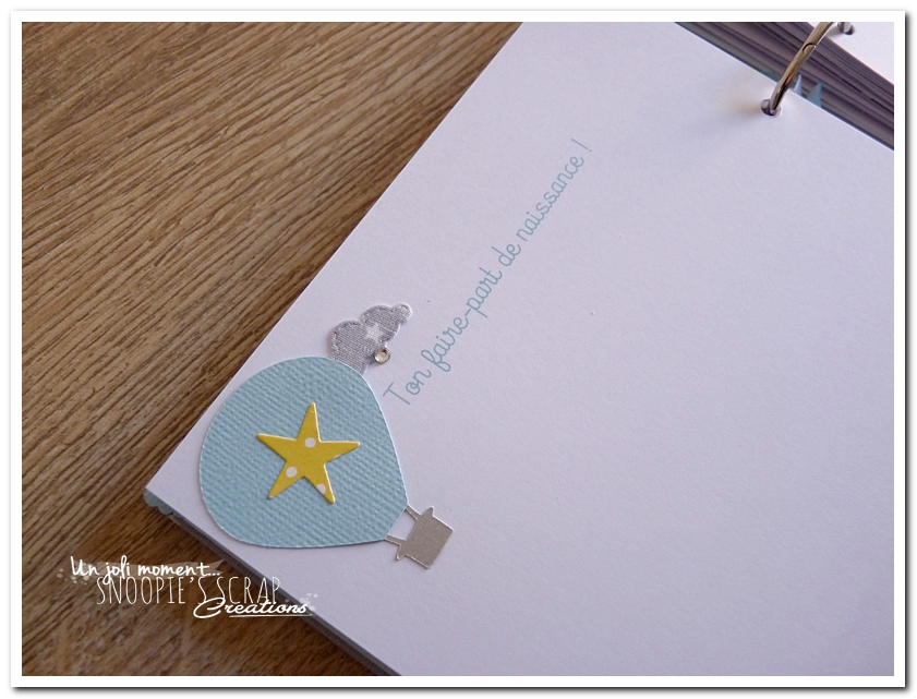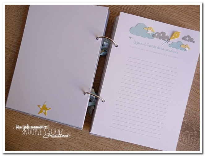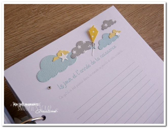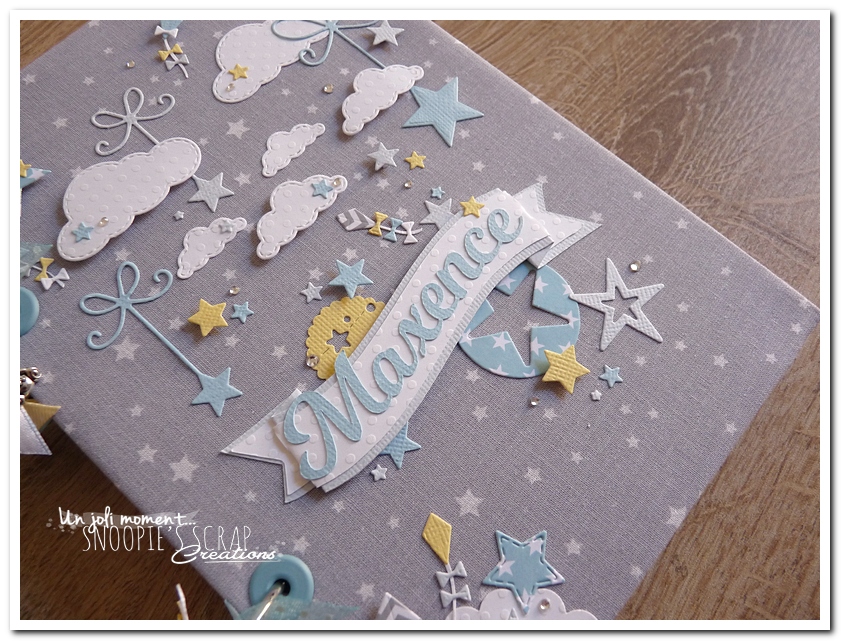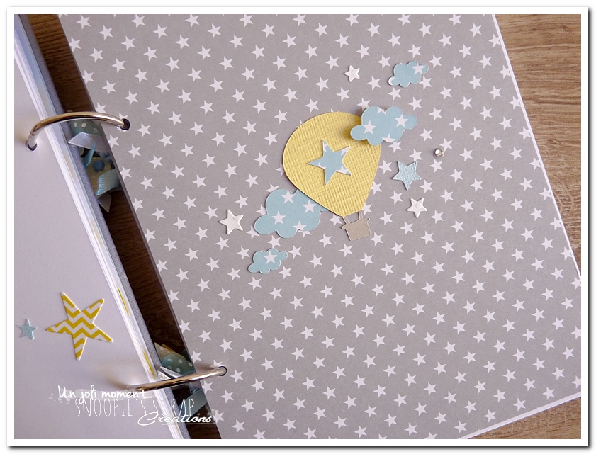 livre de naissance, cadeau de naissance, baby shower, album photo, souvenirs de naissance, maternité, jaune, bleu clair, pastel, blanc, gris, étoiles, nuages, voyage, mongolfière, noeud, cerf-volants, maxence.