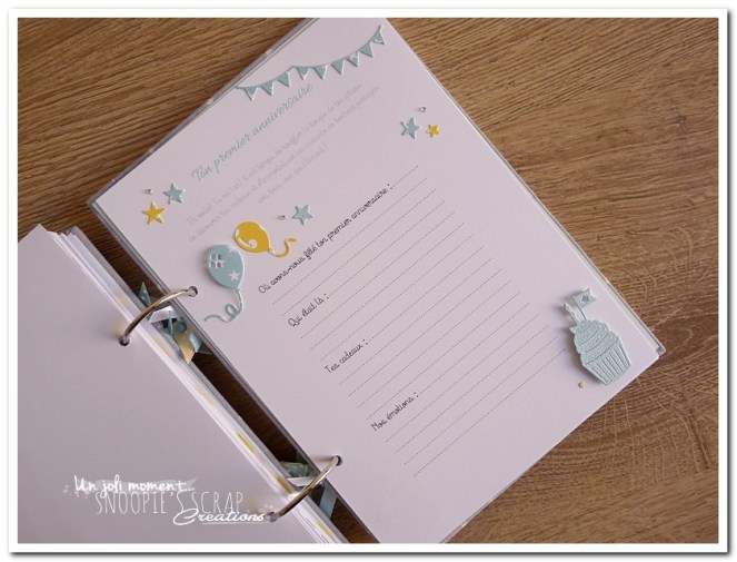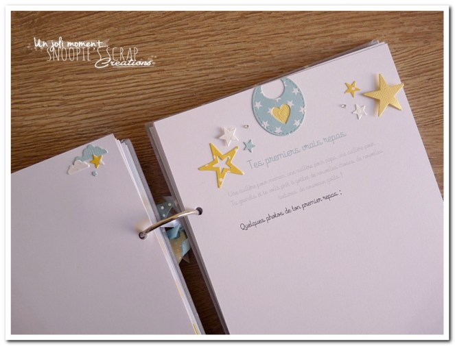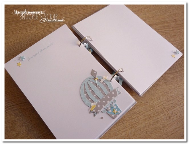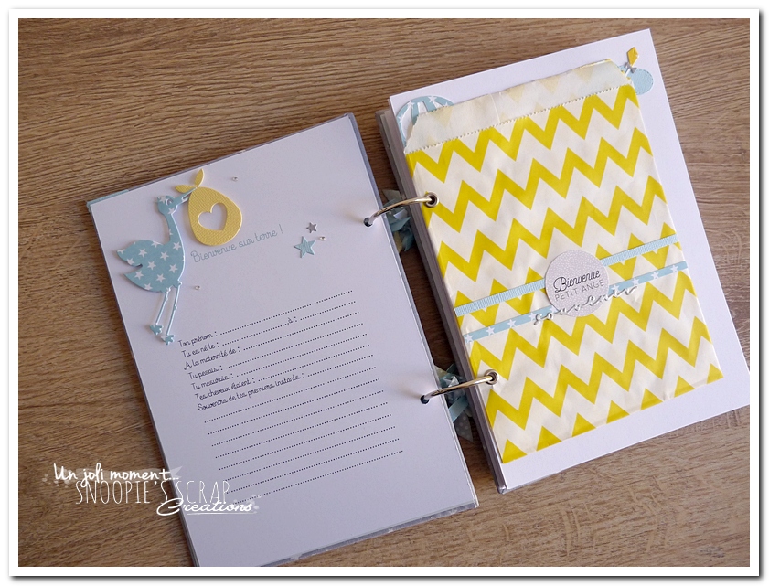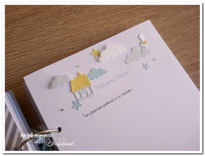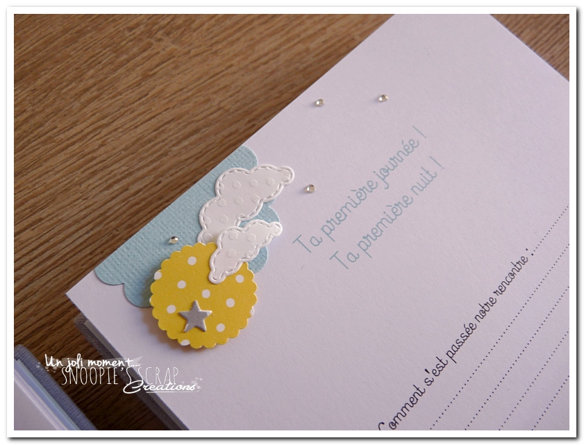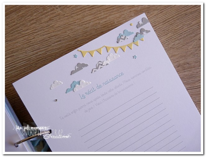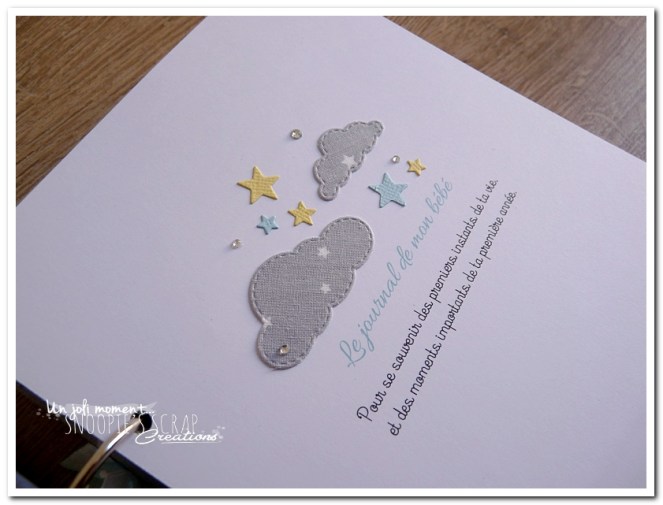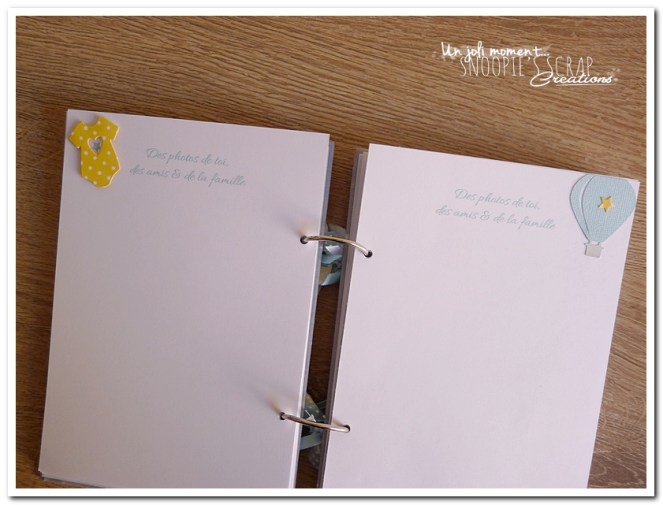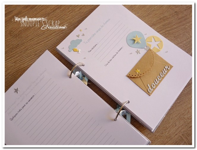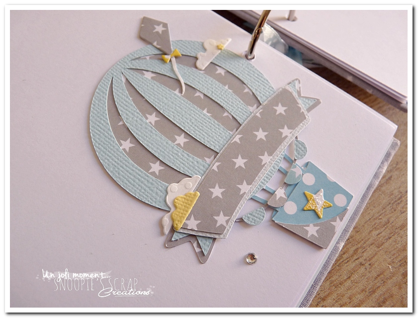 livre de naissance, cadeau de naissance, baby shower, album photo, souvenirs de naissance, maternité, jaune, bleu clair, pastel, blanc, gris, étoiles, nuages, voyage, mongolfière, noeud, cerf-volants, maxence.