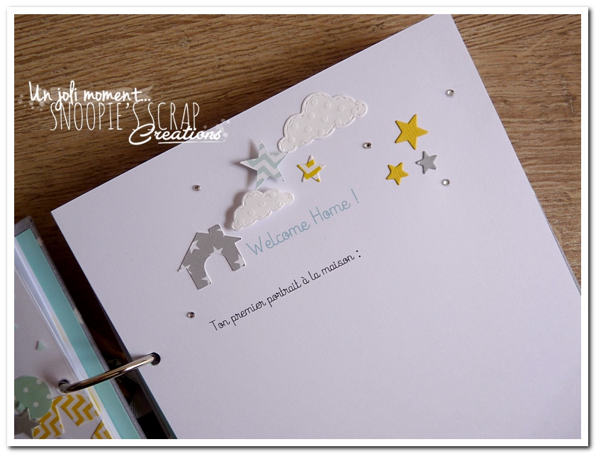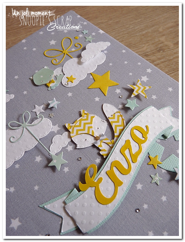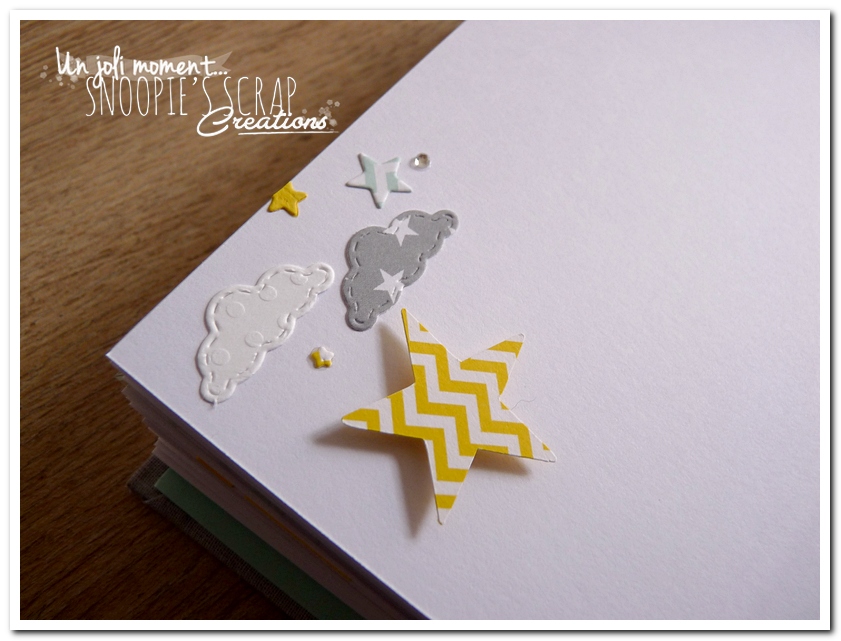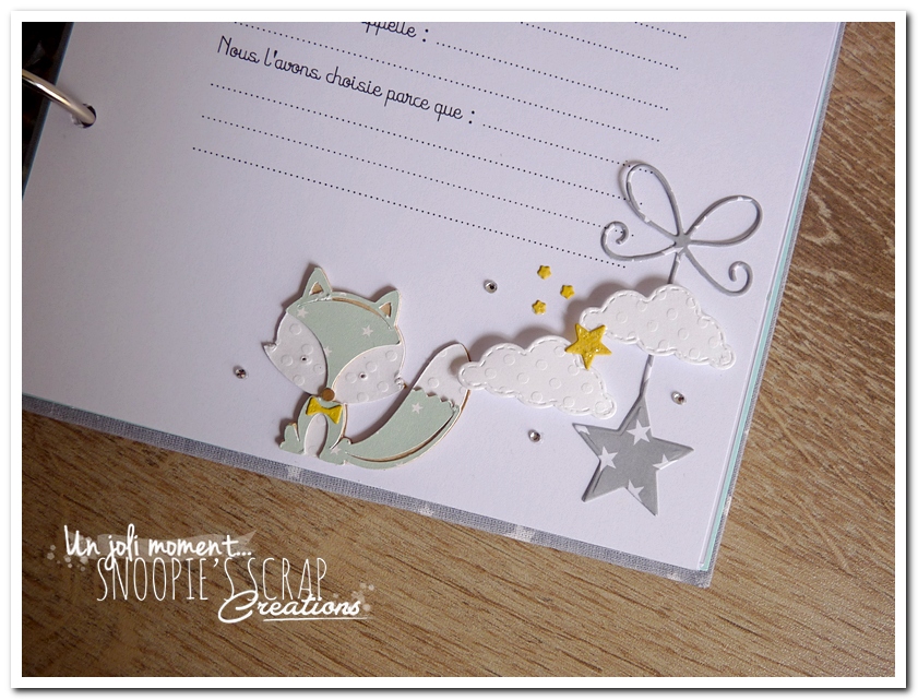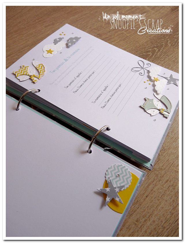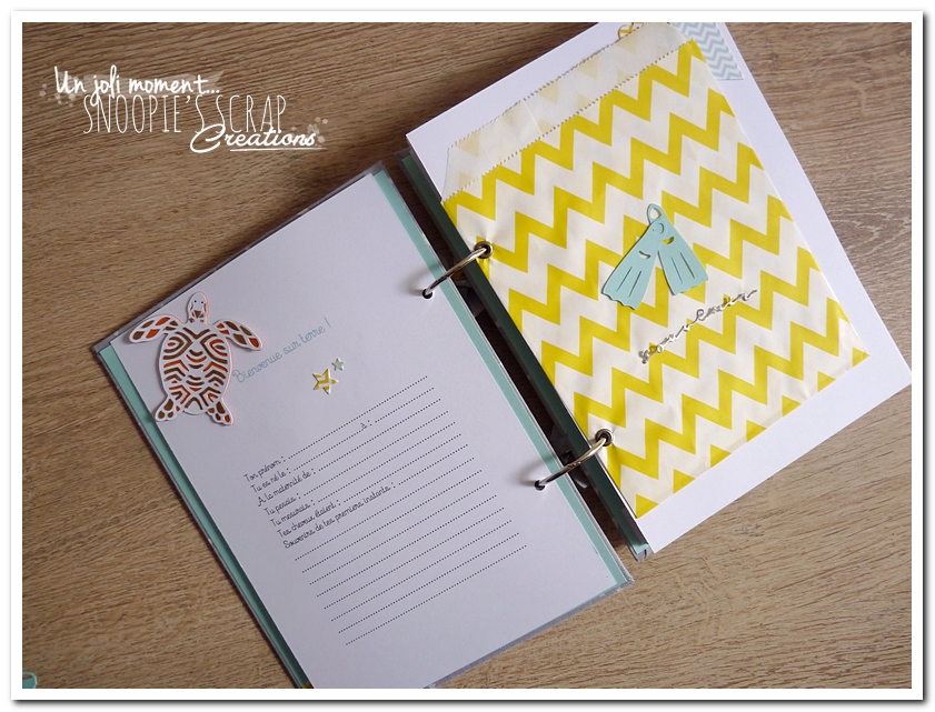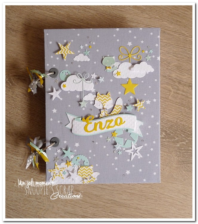 livre de naissance, cadeau de naissance, baby shower, album photo, souvenirs de naissance, maternité, blanc, gris, étoiles, nuages, vert d’eau, jaune, argent, renard, LE GRAND BLEU, tortue, palmes, fox, scandinave, chevrons, Enzo.