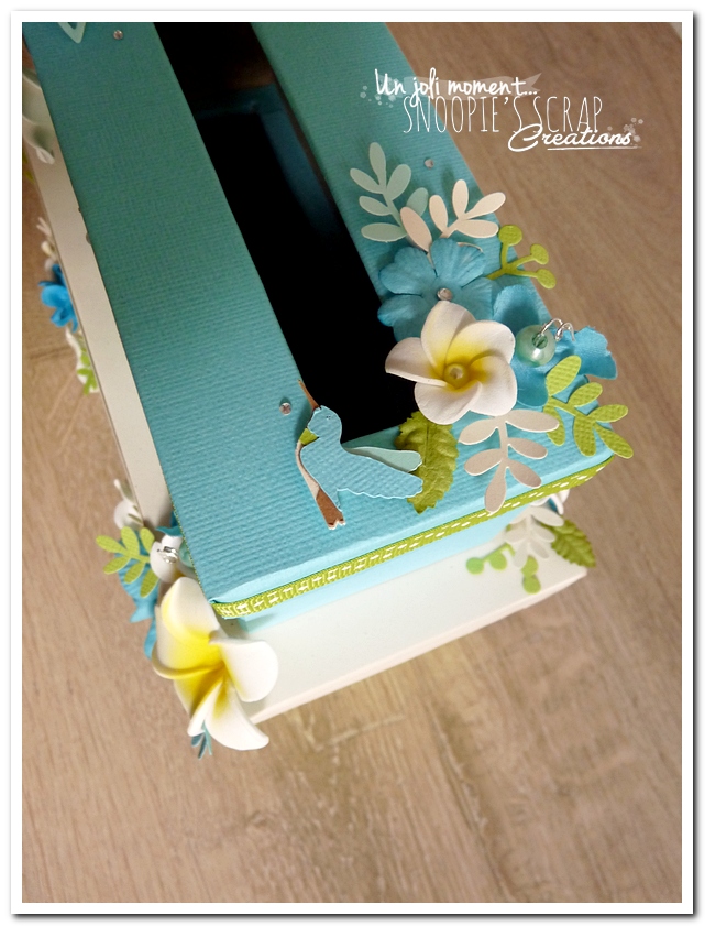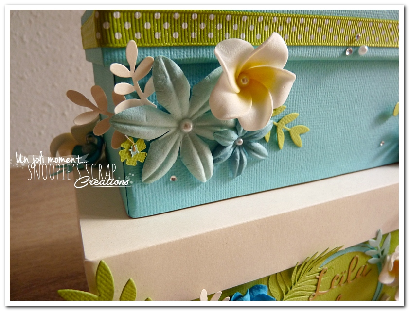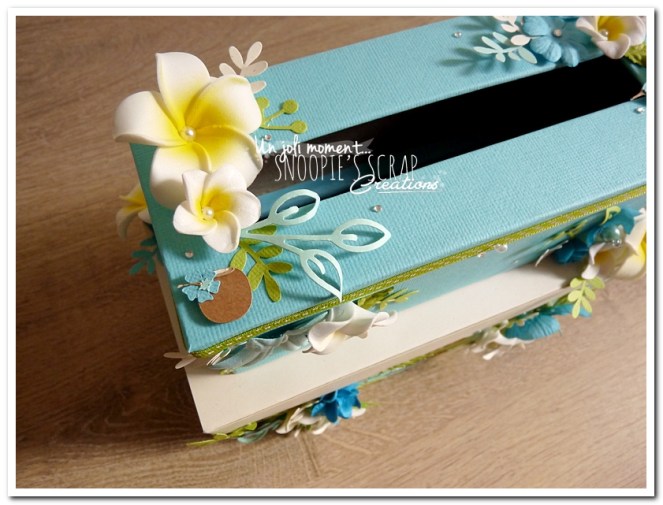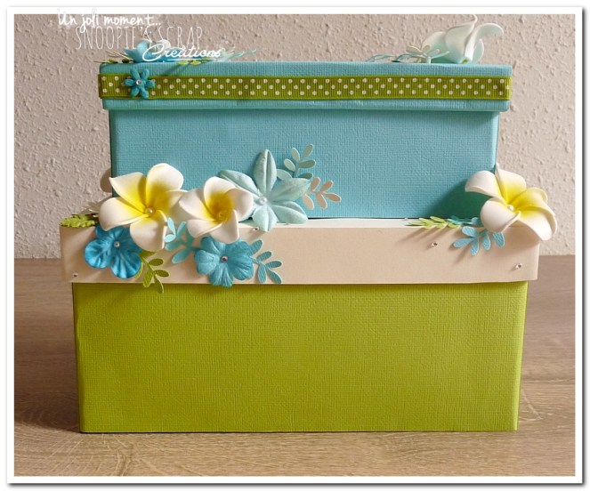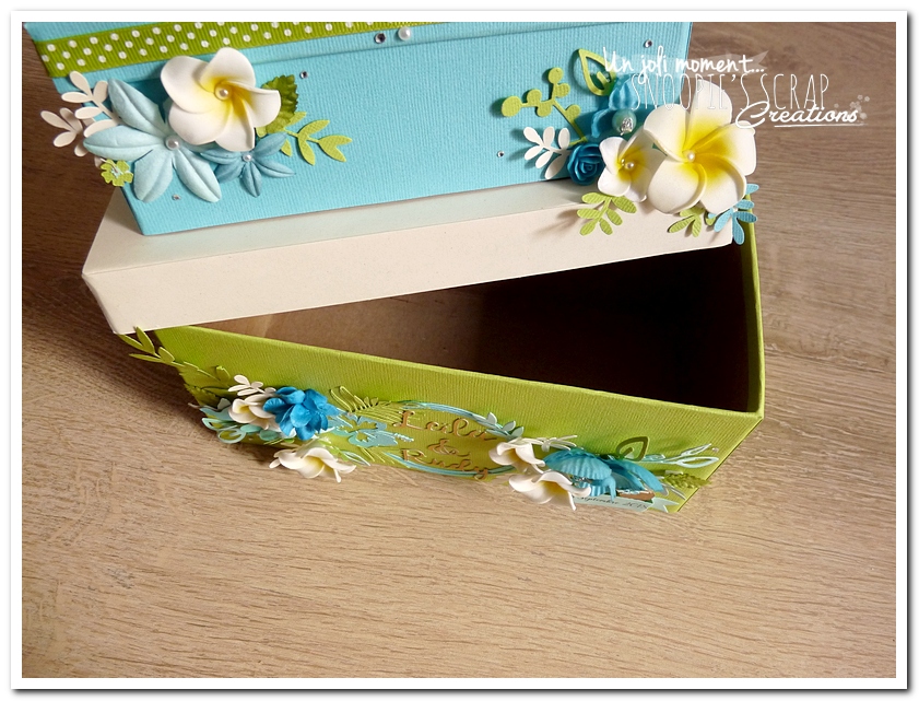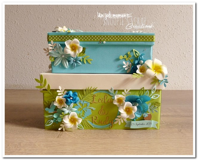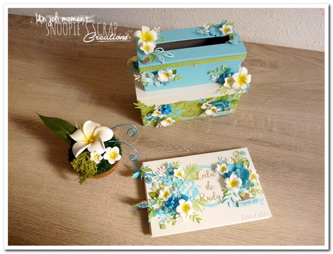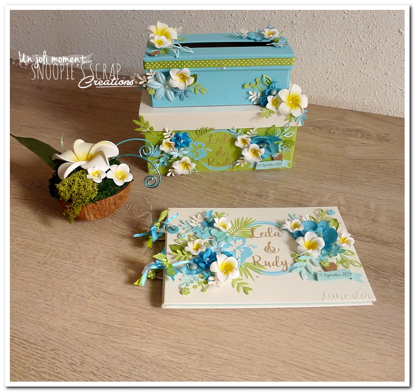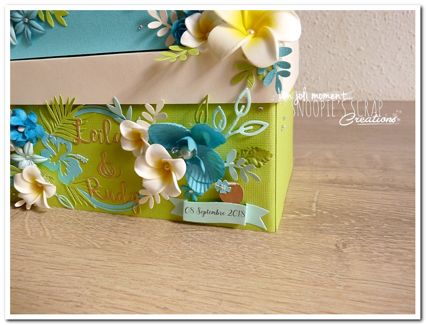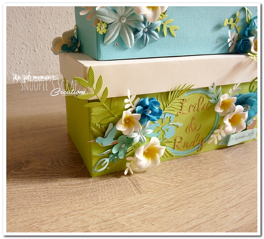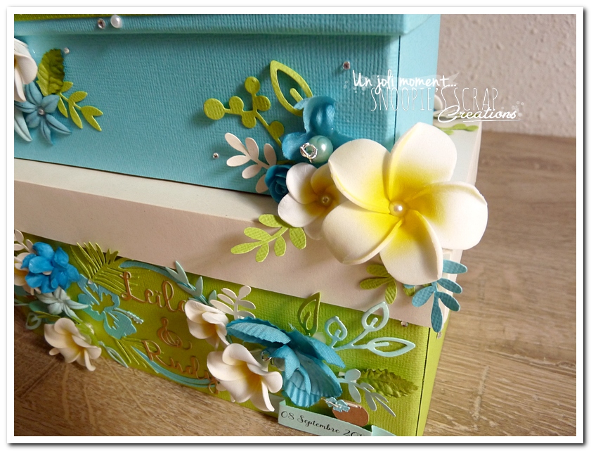 mariage Leïla & Rudy, wedding, exotique, îles, eau, mer, tropiques, voyages de noces, hawaï, martinique, guadeloupe, canelle, cannelle, fleurs, feuilles, arum, lys, frangipanier, urne, tirelire, boîte à rêves, boîte à rêves, turquoise, bleu, aqua, teal, eau, bois. rectangulaire, double étage