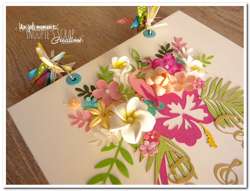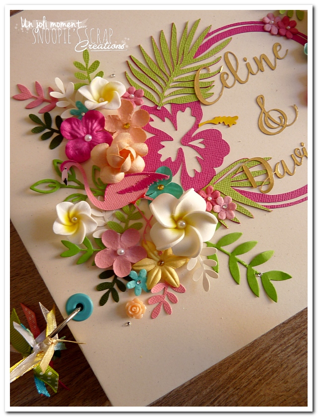 Thématique : Les tropiques, fleurs de Frangipanier, flamant rose, ananas.