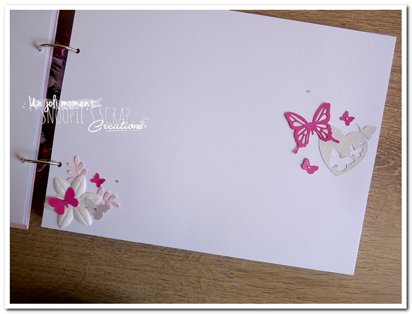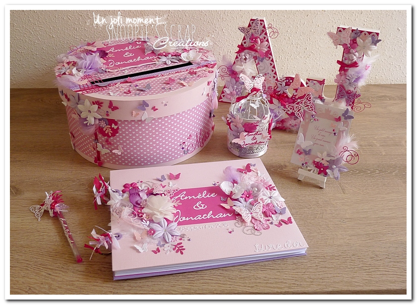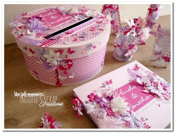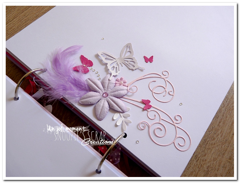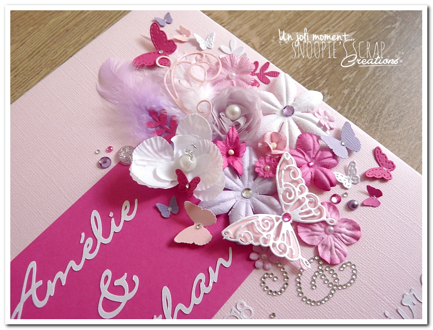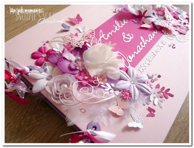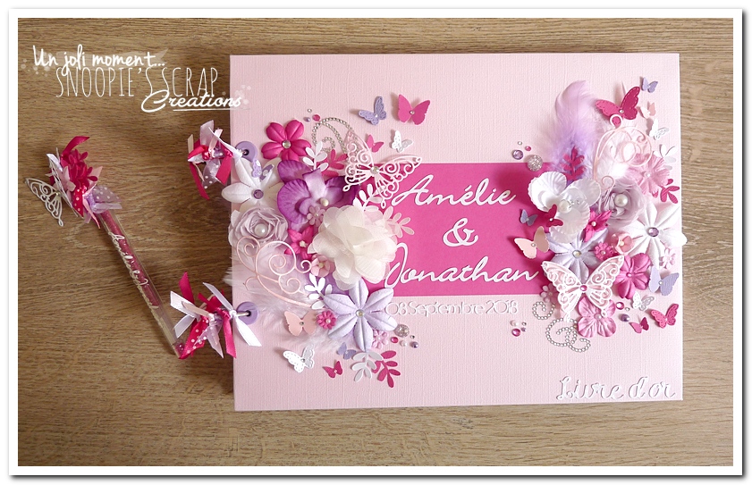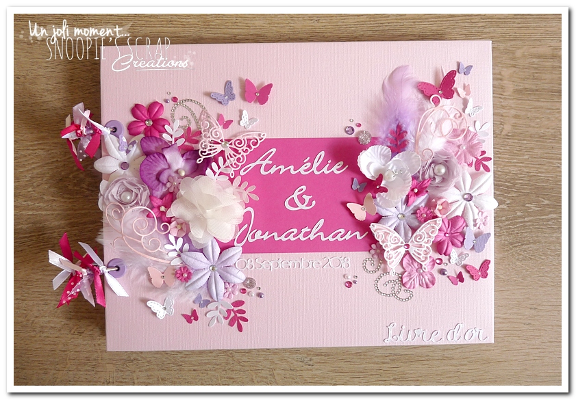 livre d’or, mariage, pacs, mariage Amélie & Jonathan, fushia, rose, blanc & parme, papillons, fleurs, douceur, romantisme, romantique, arabesques, plumes, roses, fleurs, strass, paillettes, champêtre chic. ENJOY
