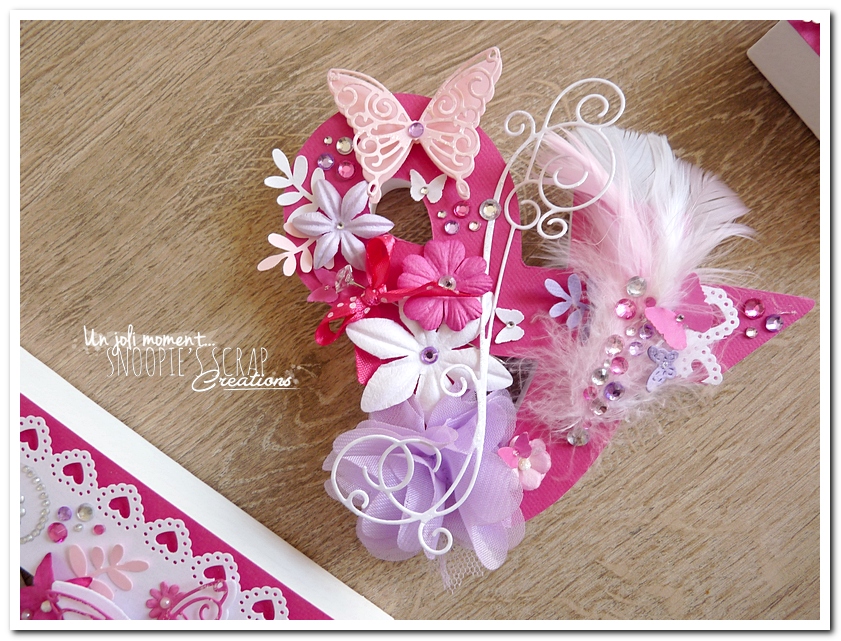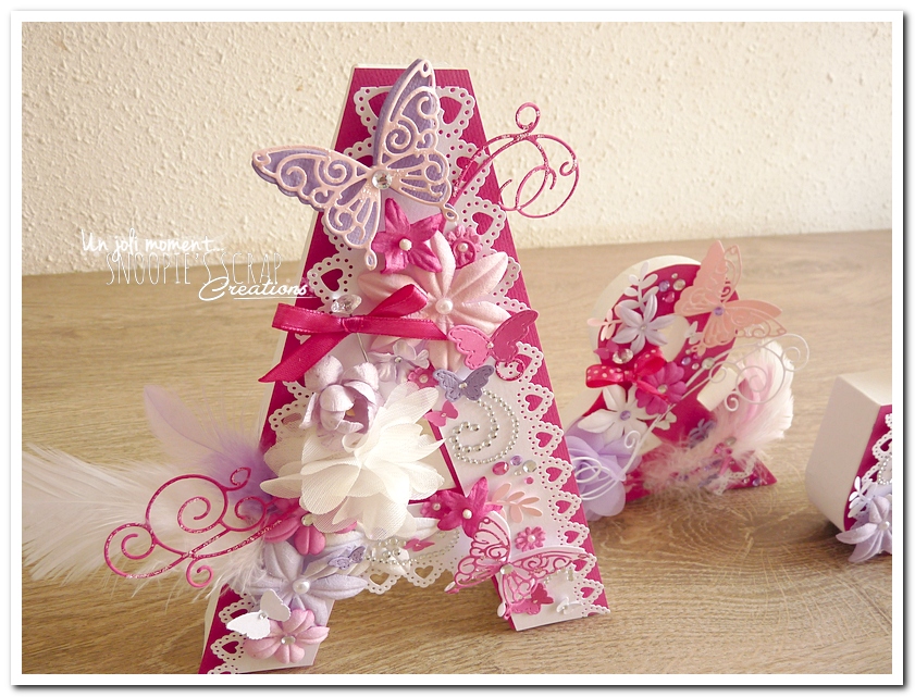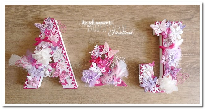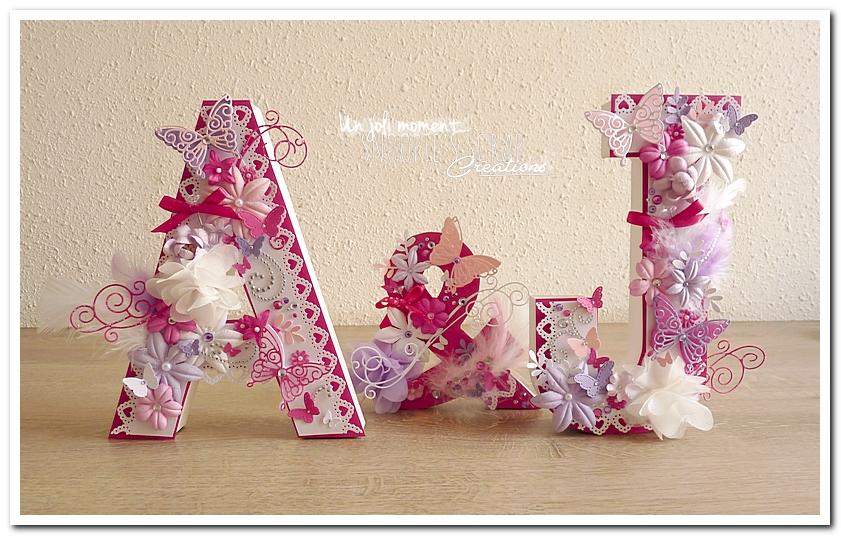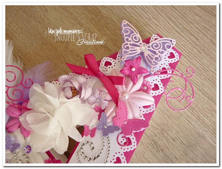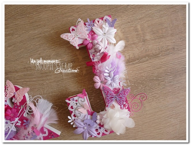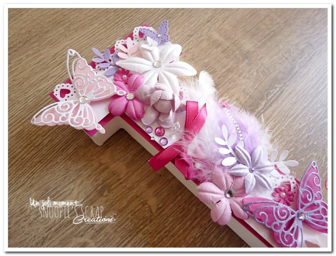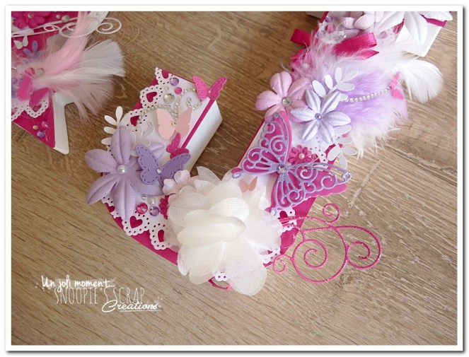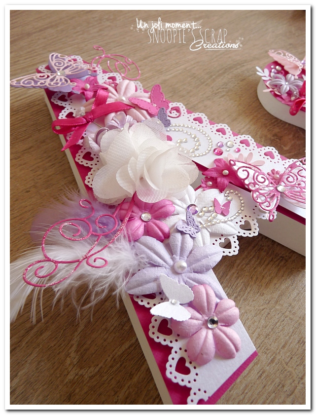 initiales, lettres, décorées, mariage, pacs, mariage Amélie & Jonathan, fushia, rose, blanc & parme, papillons, fleurs, douceur, romantisme, romantique, arabesques, plumes, roses, fleurs, strass, paillettes, champêtre chic, décoration de table, centre de table d’honneur.