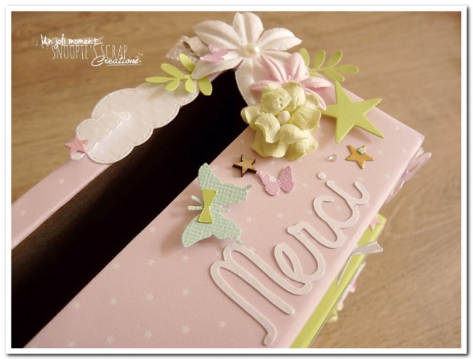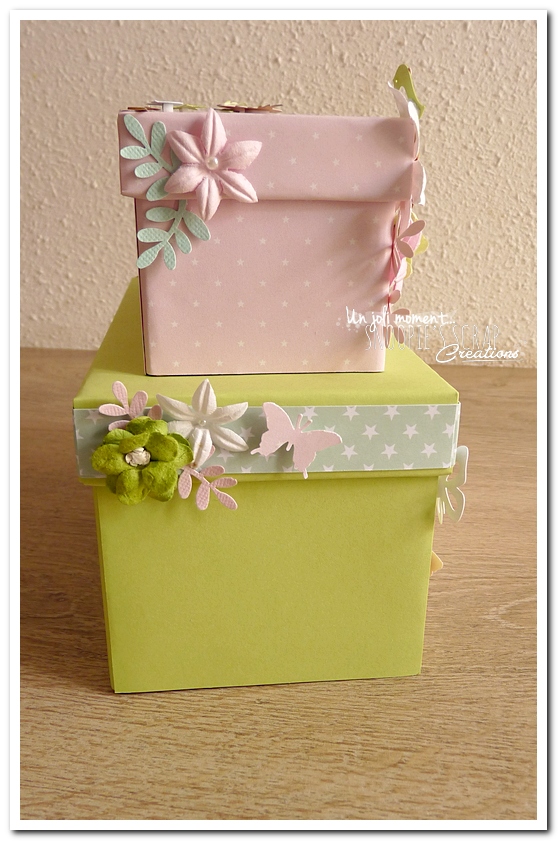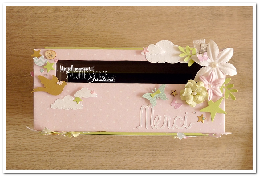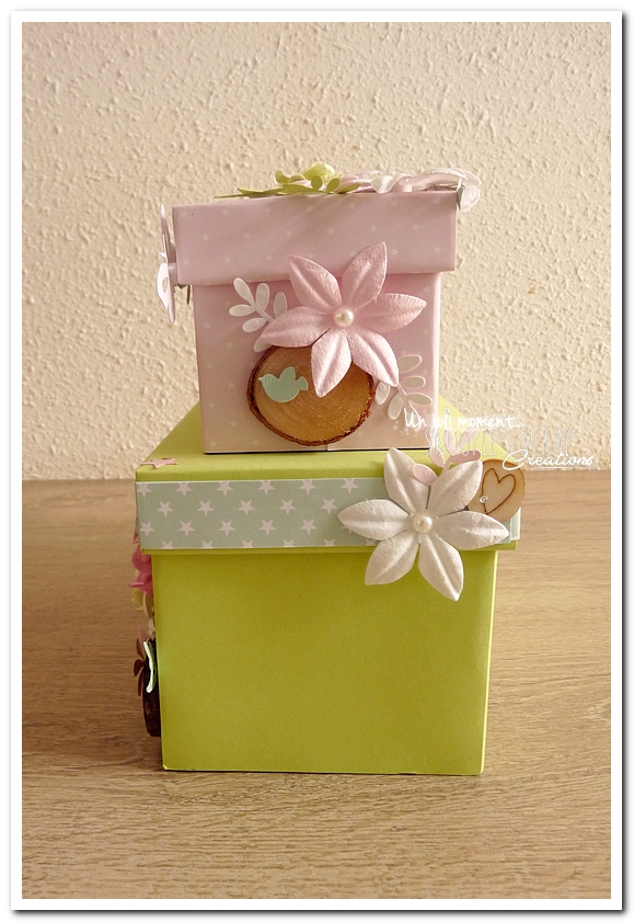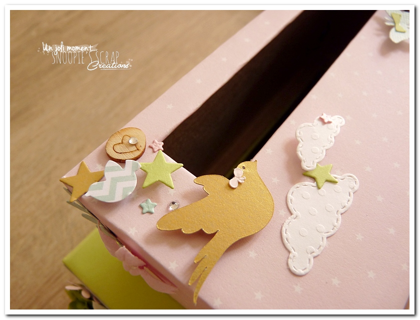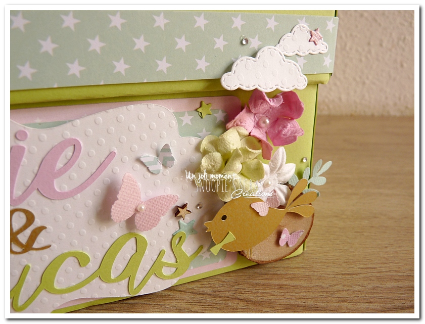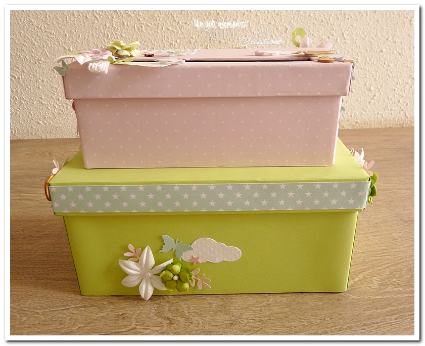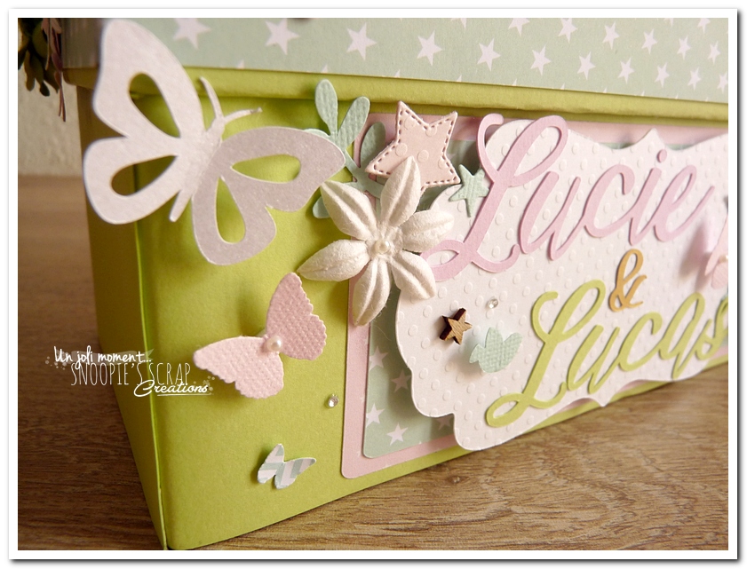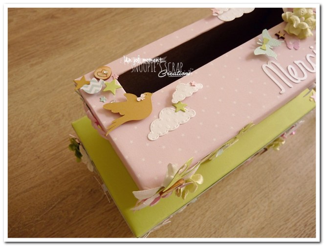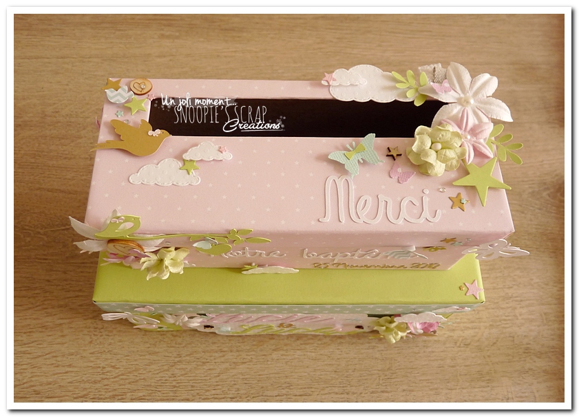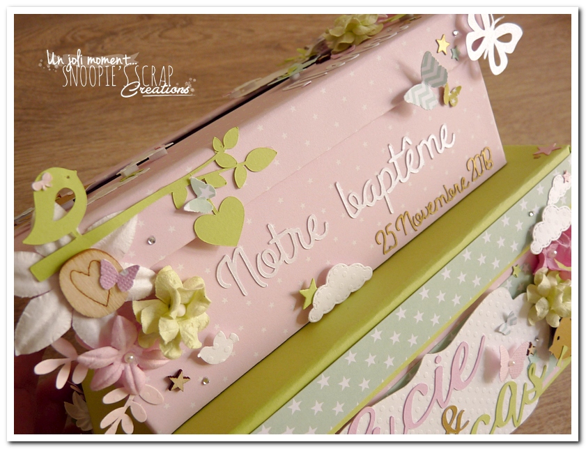 tirelire, boîte à rêves, boîte voyage, urne Baptême, Lucie & Lucas, dentelle,rondin en bois, coeur, kraft, rose, papillons, rubans, fleurs, doux, vert anis, blanc, or, doré, champêtre chic, oiseau, forêt, nature,rectangulaire, double étage