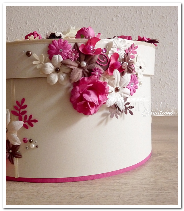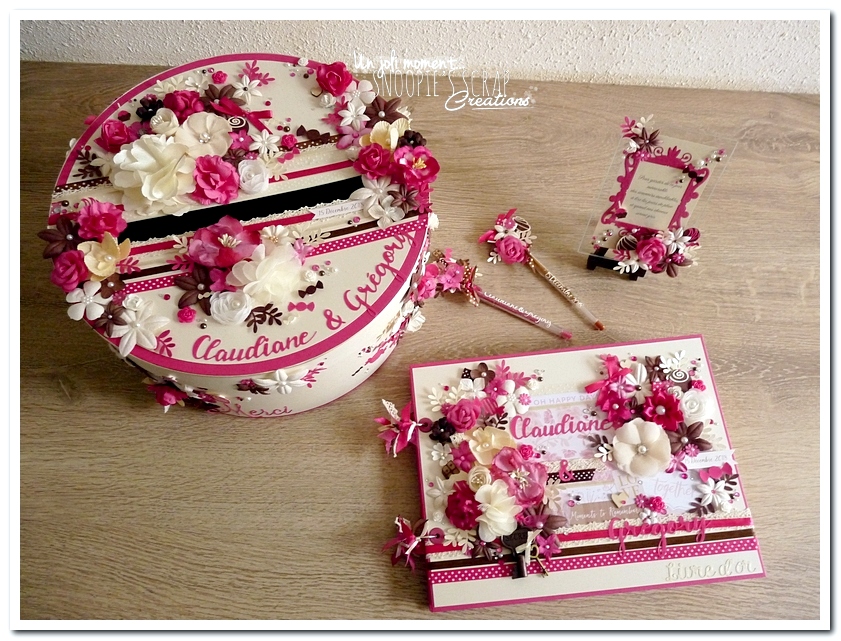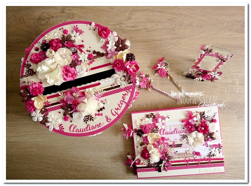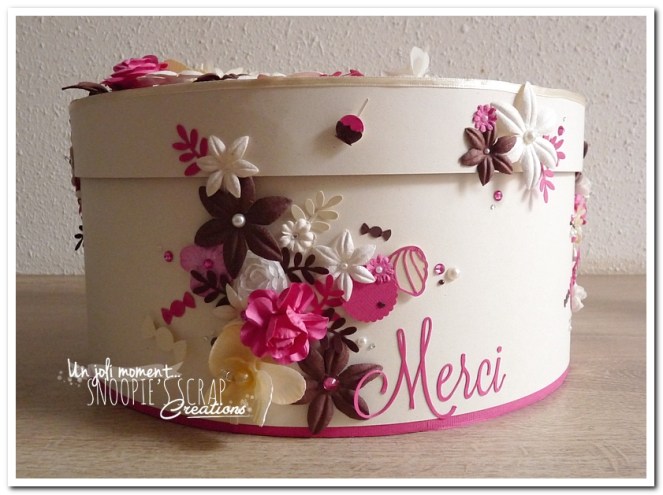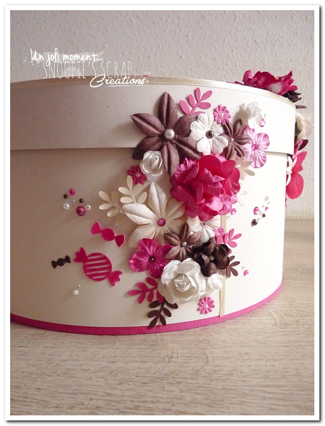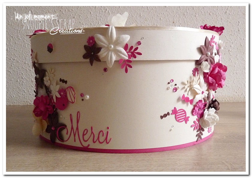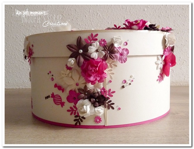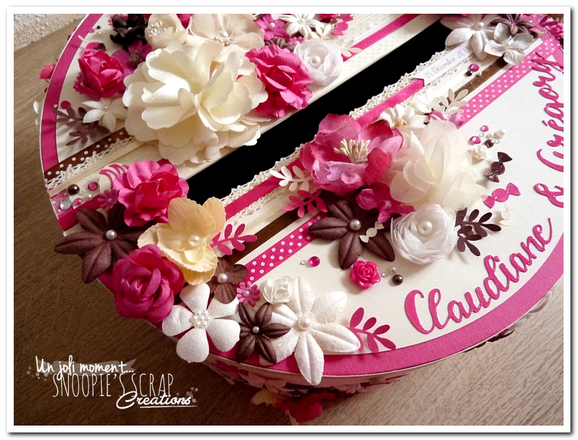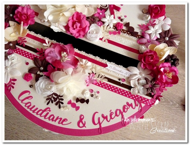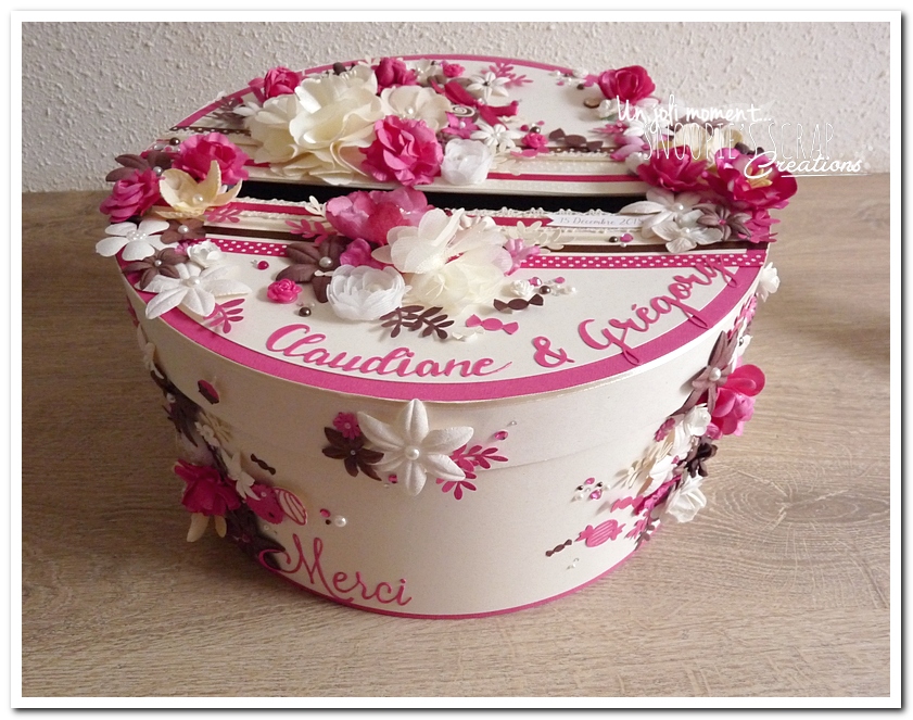 tirelire, boîte à rêves, boîte voyage, voyage de noces, honymoon, urne mariage,ronde, romantique chic fleuri, gourmandises, rose fushia, fuchsia, fuschia, ivoire, blanc cassé, chocolat, marron, bonbons, fleurs, strass, perles, roses, pivoines, orchidées, arabesques,romantisme,mariage, pacs, mariage Claudiane & Grégory