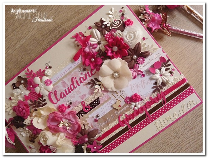 romantique chic fleuri, gourmandises, rose fushia, fuchsia, fuschia, ivoire, blanc cassé, chocolat, marron, bonbons, fleurs, strass, perles, roses, pivoines, orchidées, arabesques,romantisme,mariage, pacs, mariage Claudiane & Grégory, livre d’or mariage, mariage, fête, wedding, Pages spéciales. FORMULE LOVE